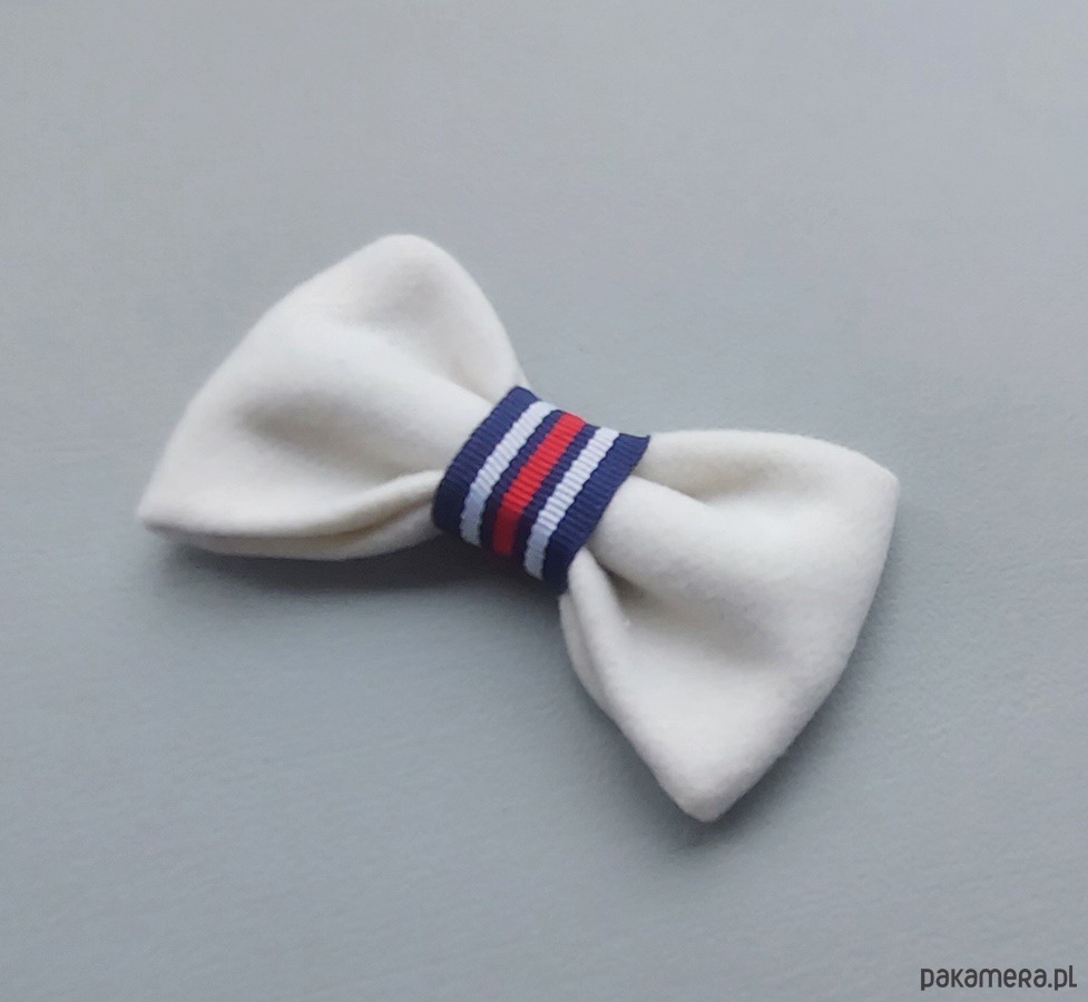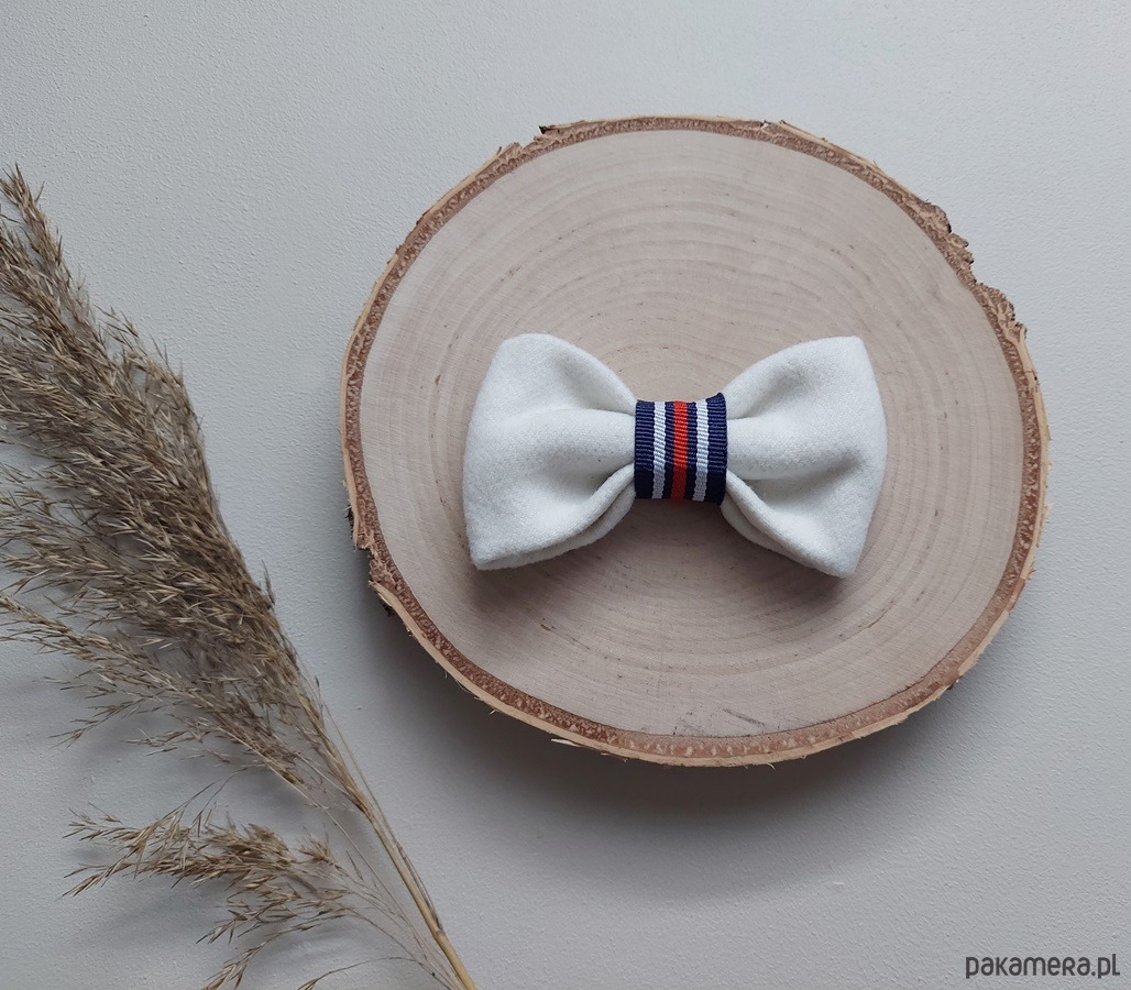 Ręcznie wykonana, elegancka broszka w kolorze kremowym to wyjątkowy dodatek, który doda każdej stylizacji subtelnej elegancji. Jej ozdobą jest pasiasta tasiemka w odcieniach bieli, granatu i czerwieni, która wprowadza do całości nutę klasycznego szyku. To idealny wybór dla osób, które cenią wyraziste akcesoria, które doskonale wzbogacą zarówno eleganckie, jak i codzienne kreacje.