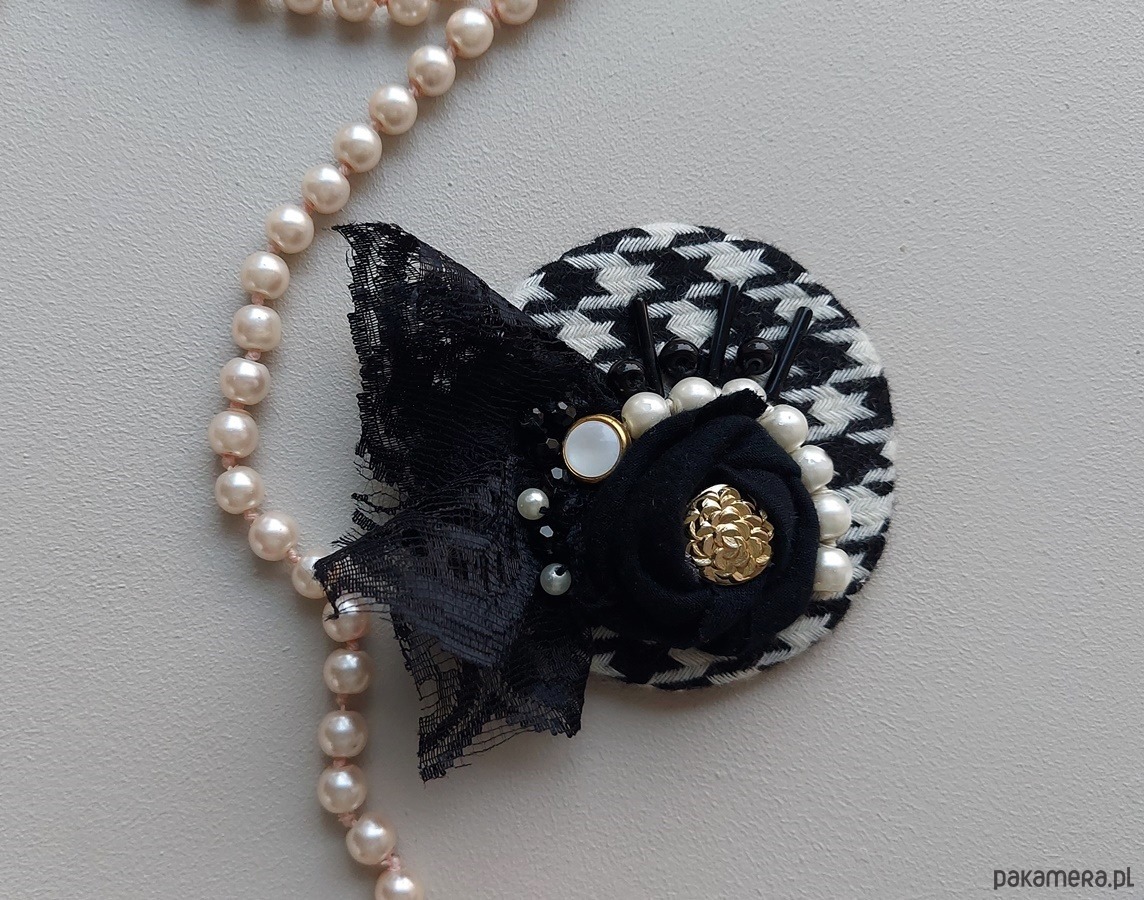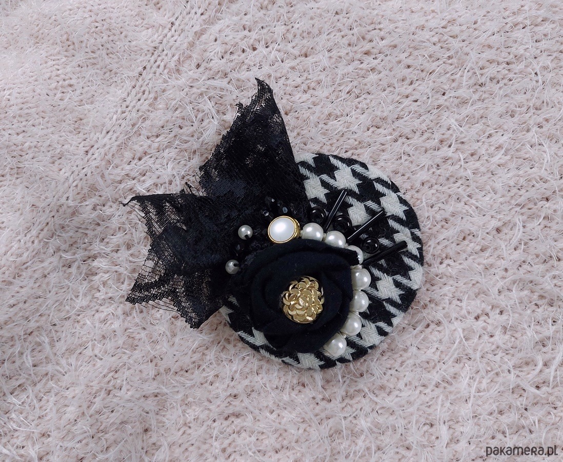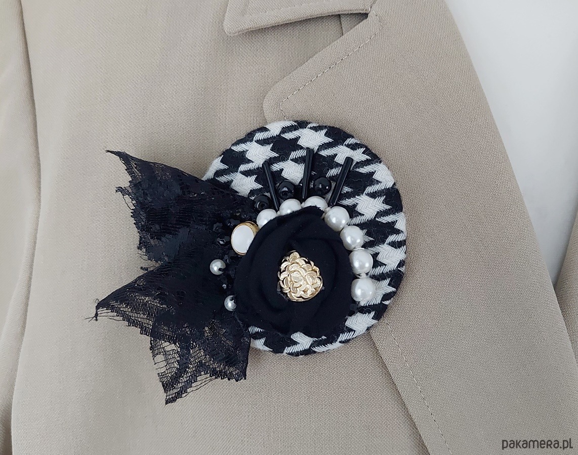 Elegancka broszka pepitka z koronką