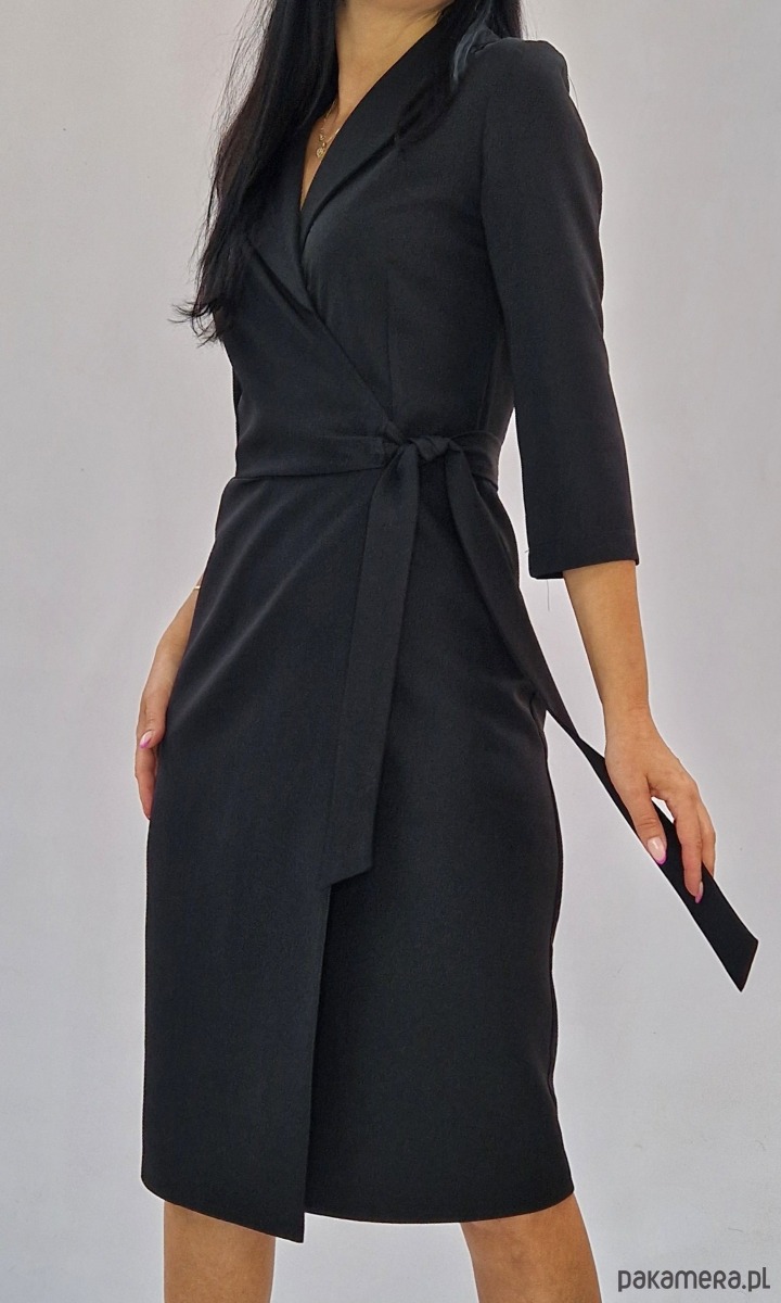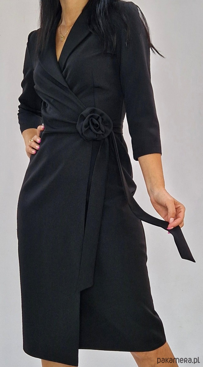 Elegancka czarna Kopertowa sukienka z różą 34-50
