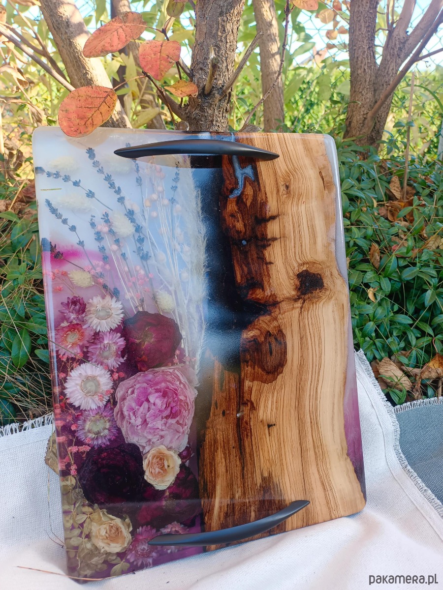 Elegancka, romantyczna deska do serwowania o wymiarach 30 × 40 cm, wykonana z wyjątkowego drewna oliwnego o naturalnym, dekoracyjnym usłojeniu. Szlachetność materiału łączy się tu z delikatną, kobiecą kompozycją kwiatową zatopioną w żywicy epoksydowej.