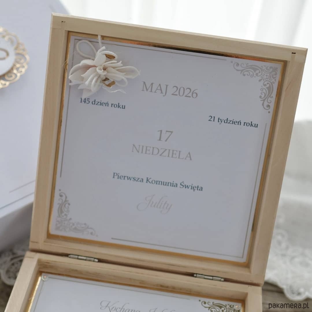 Elegancka kartka na Pierwszą Komunię Świętą w drewnianym pudełku to wyjątkowy, personalizowany prezent komunijny dla dziewczynki lub chłopca. Subtelna biało-złota kolorystyka oraz symbol IHS podkreślają uroczysty charakter tego dnia.