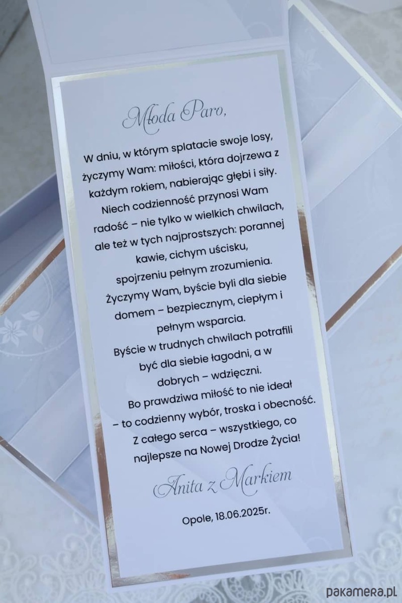 Kartka ślubna w bieli i srebrze – elegancki prezent „na już”. W zestawie pudełko, opcjonalnie kieszonka na pieniądze. Personalizacja: imiona, data, życzenia. Doskonała dla osób, które chcą wręczyć upominek ze smakiem, bez dodatkowego pakowania.