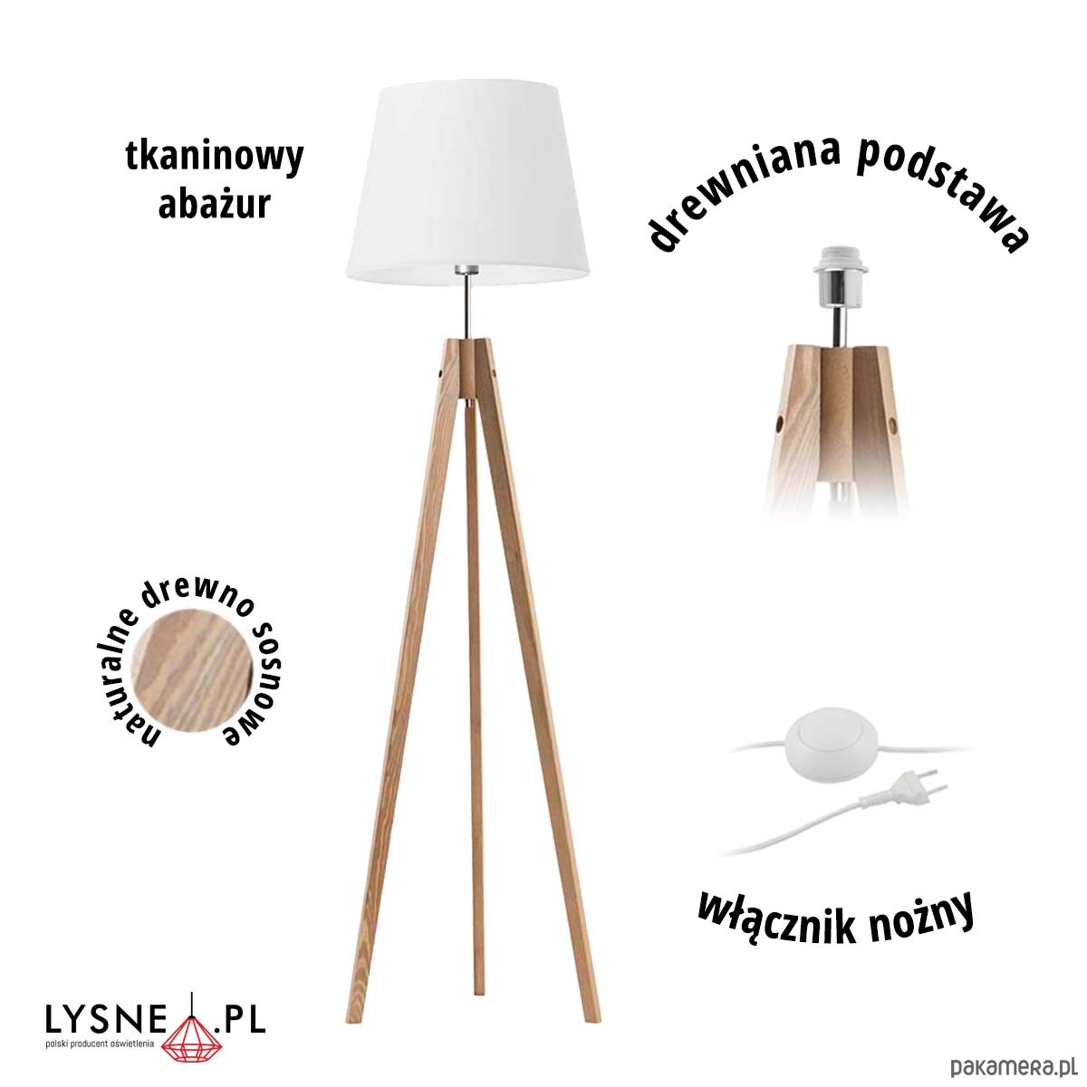 Materiał: stelaż - elementy drewna sosnowego, abażur - holenderska tkanina tekstylna podklejona na folii PVC