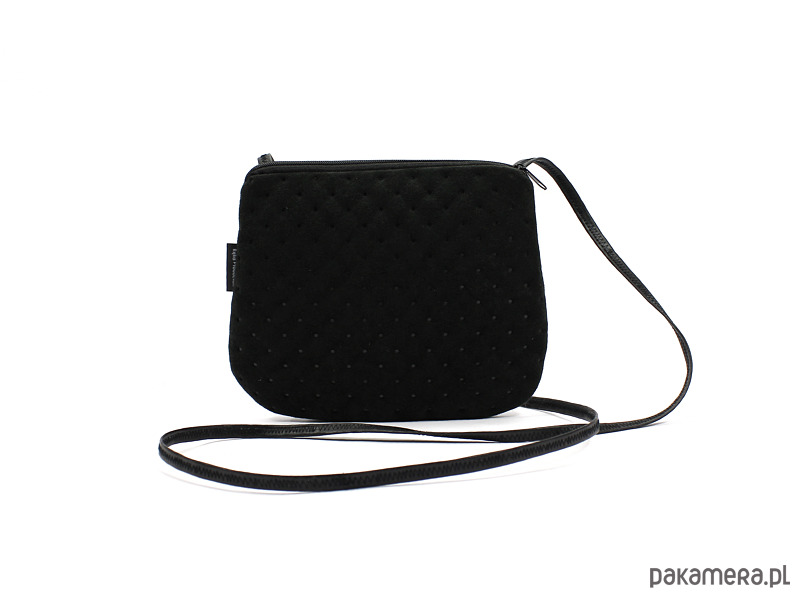 Torebeczka uszyta z ciekawie pikowanej tkaniny w kolorze czarnym.
