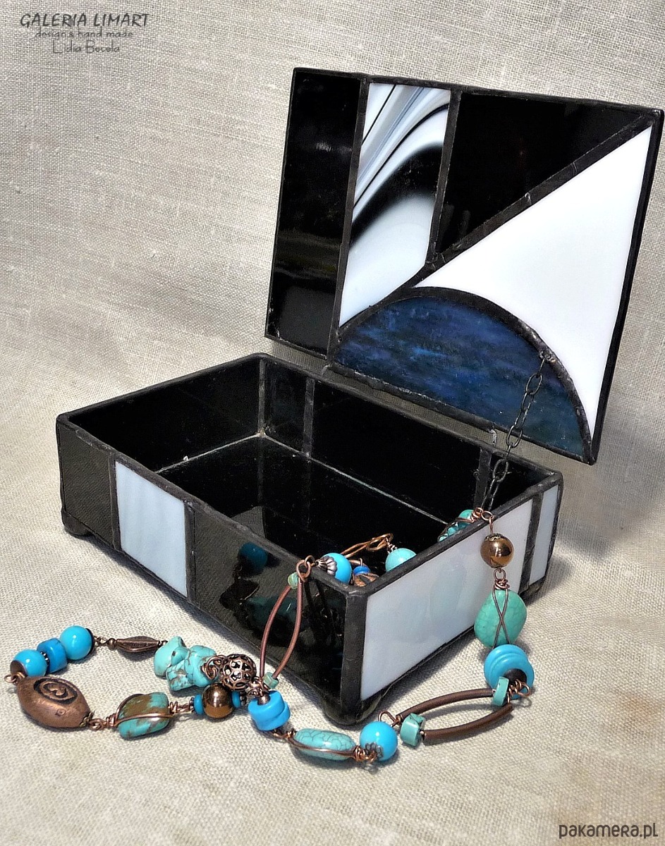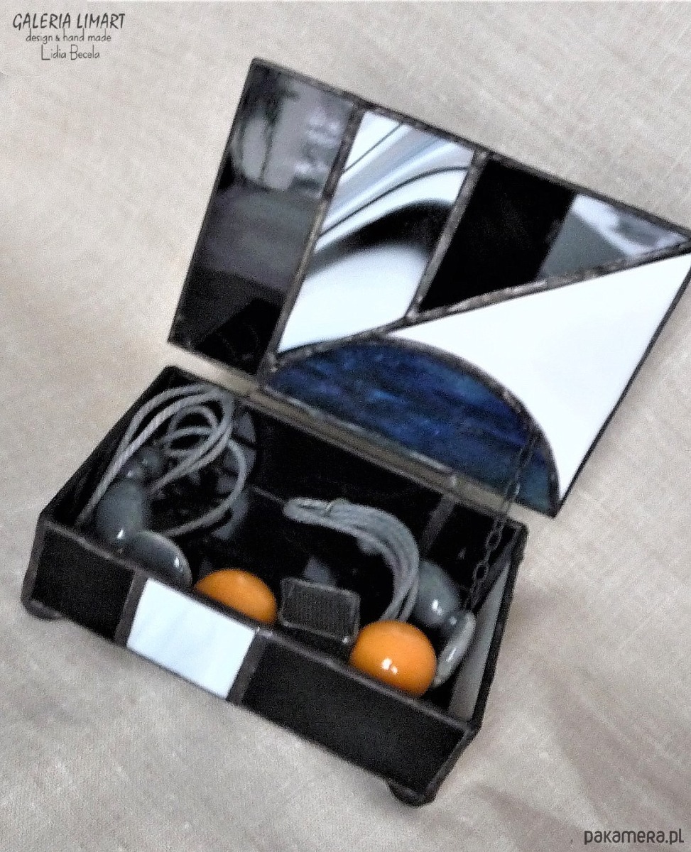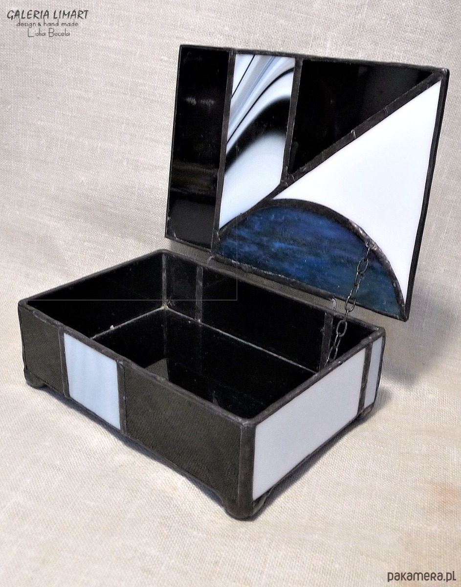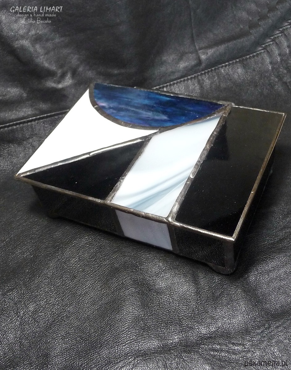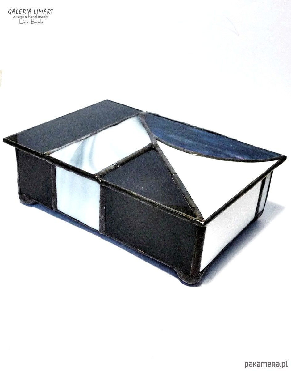 Autorska szkatułka na precjoza, własnoręcznie zrobiona z doskonałej jakości szkła witrażowego w modnej biało-szaro-czarnej tonacji. Bardzo starannie wykonana, elegancka i unikatowa, prawdziwy rarytas handmade. Dla osób ceniących rzeczy piękne i prawdziwe rękodzieło trochę w stylu vintage :)