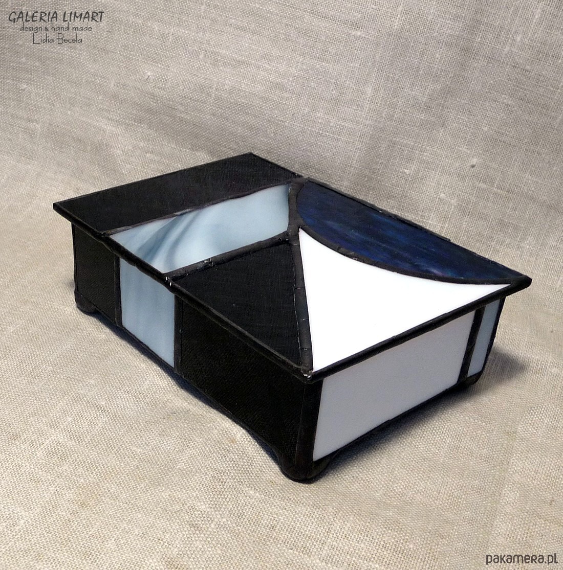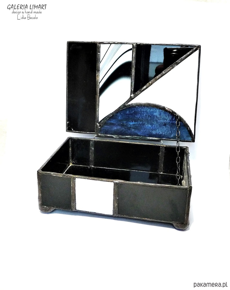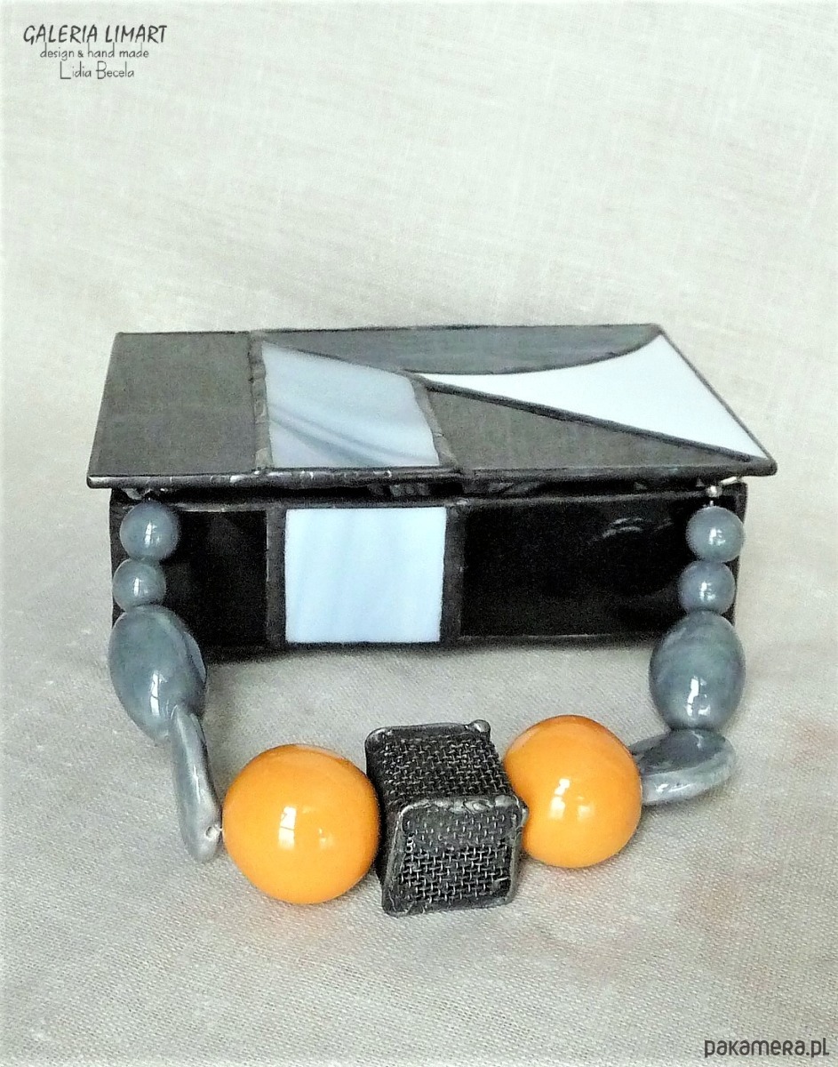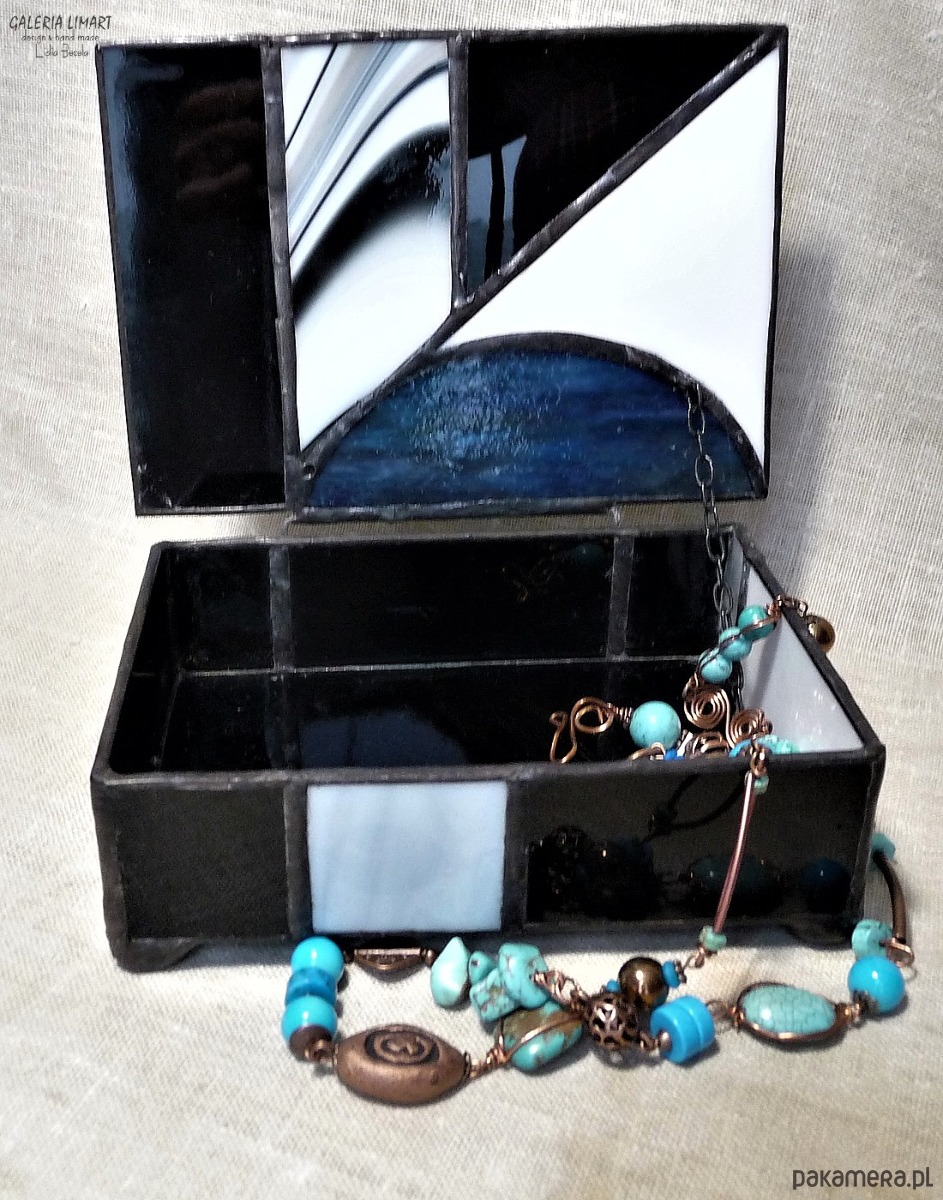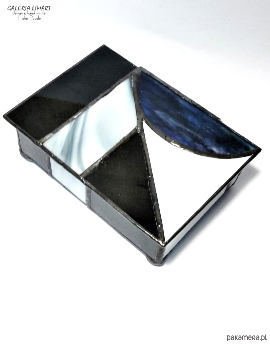Autorska szkatułka na precjoza, własnoręcznie zrobiona z doskonałej jakości szkła witrażowego w modnej biało-szaro-czarnej tonacji. Bardzo starannie wykonana, elegancka i unikatowa, prawdziwy rarytas handmade. Dla osób ceniących rzeczy piękne i prawdziwe rękodzieło trochę w stylu vintage :)