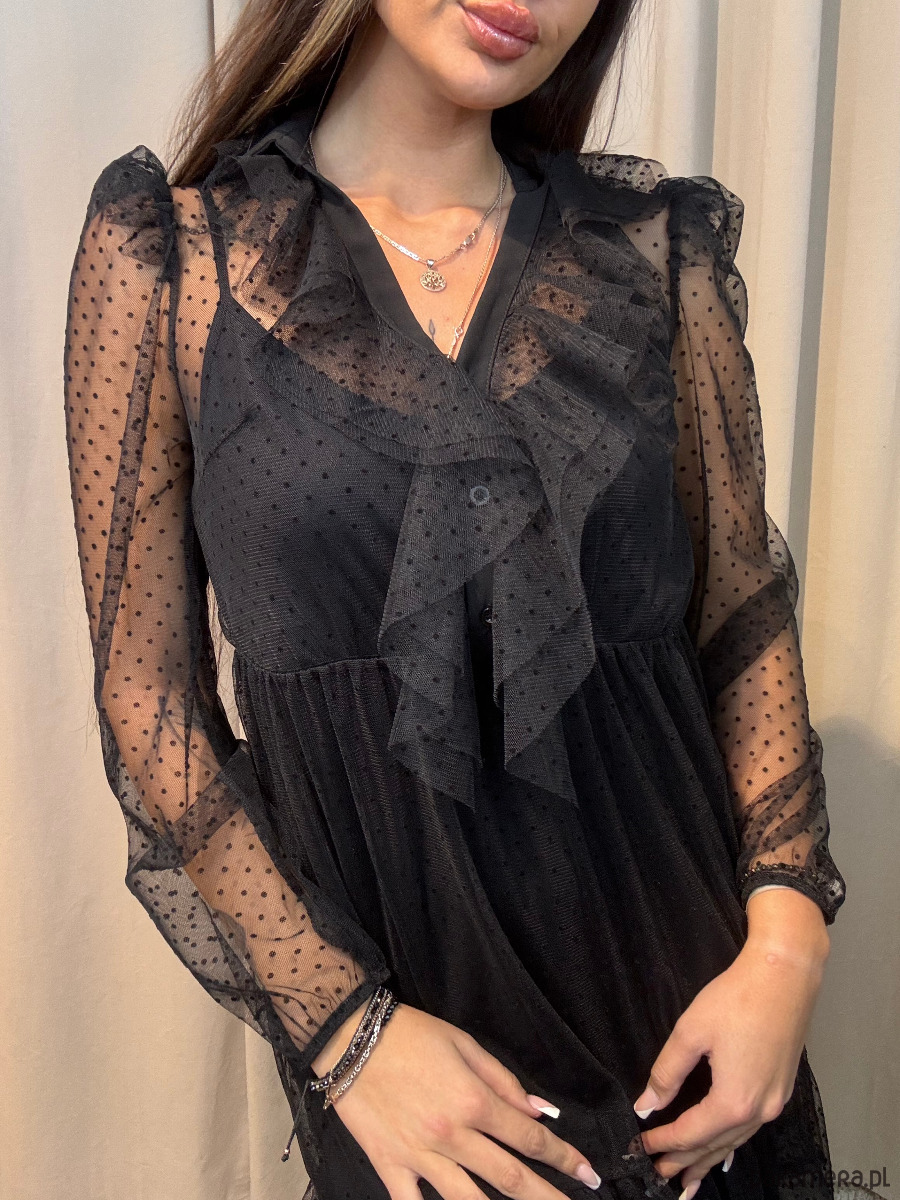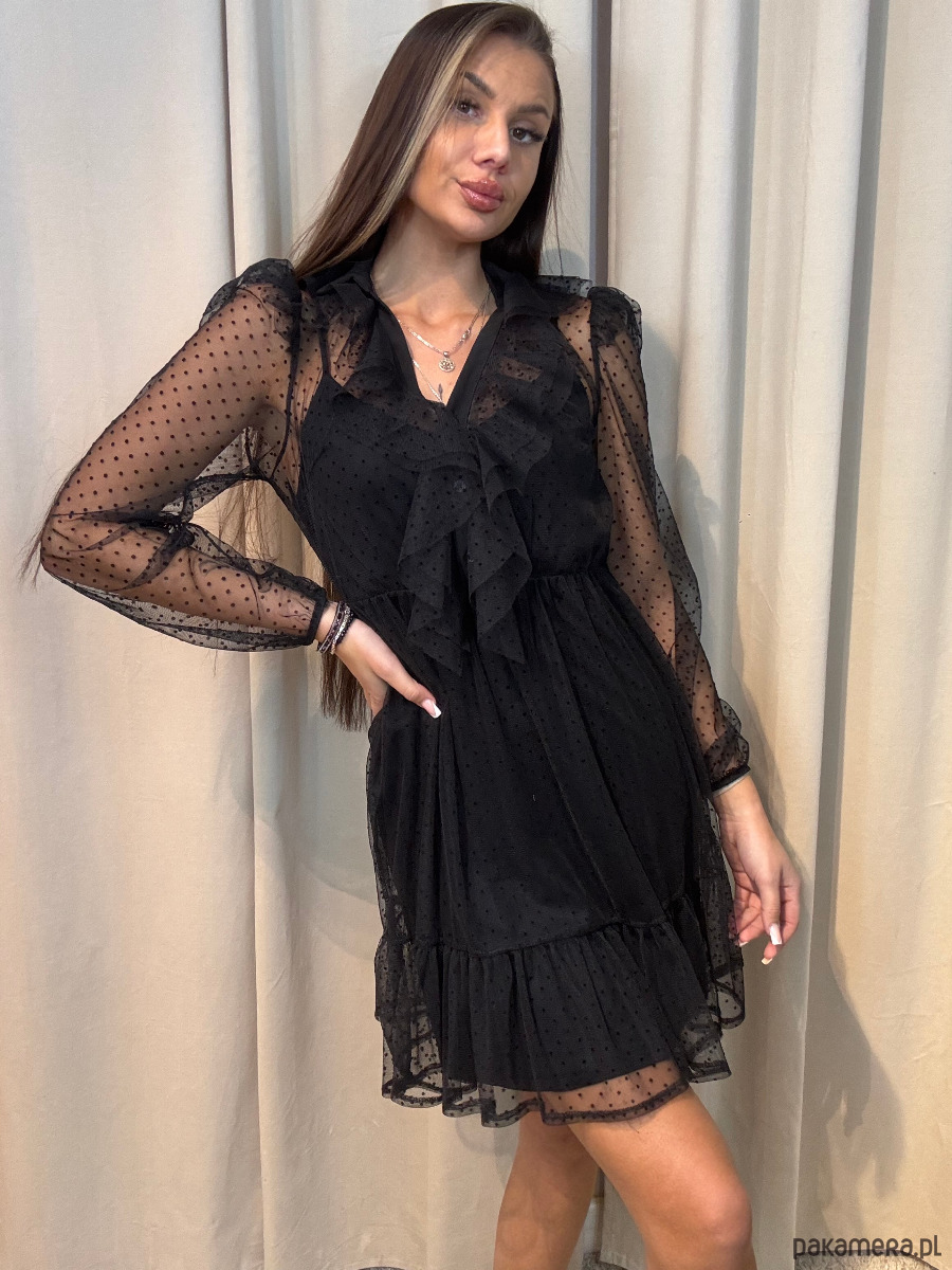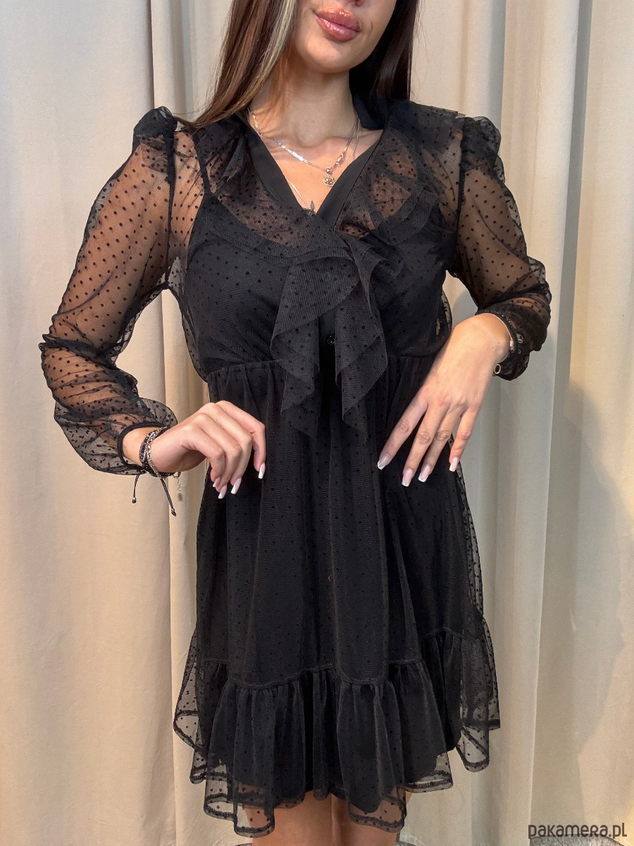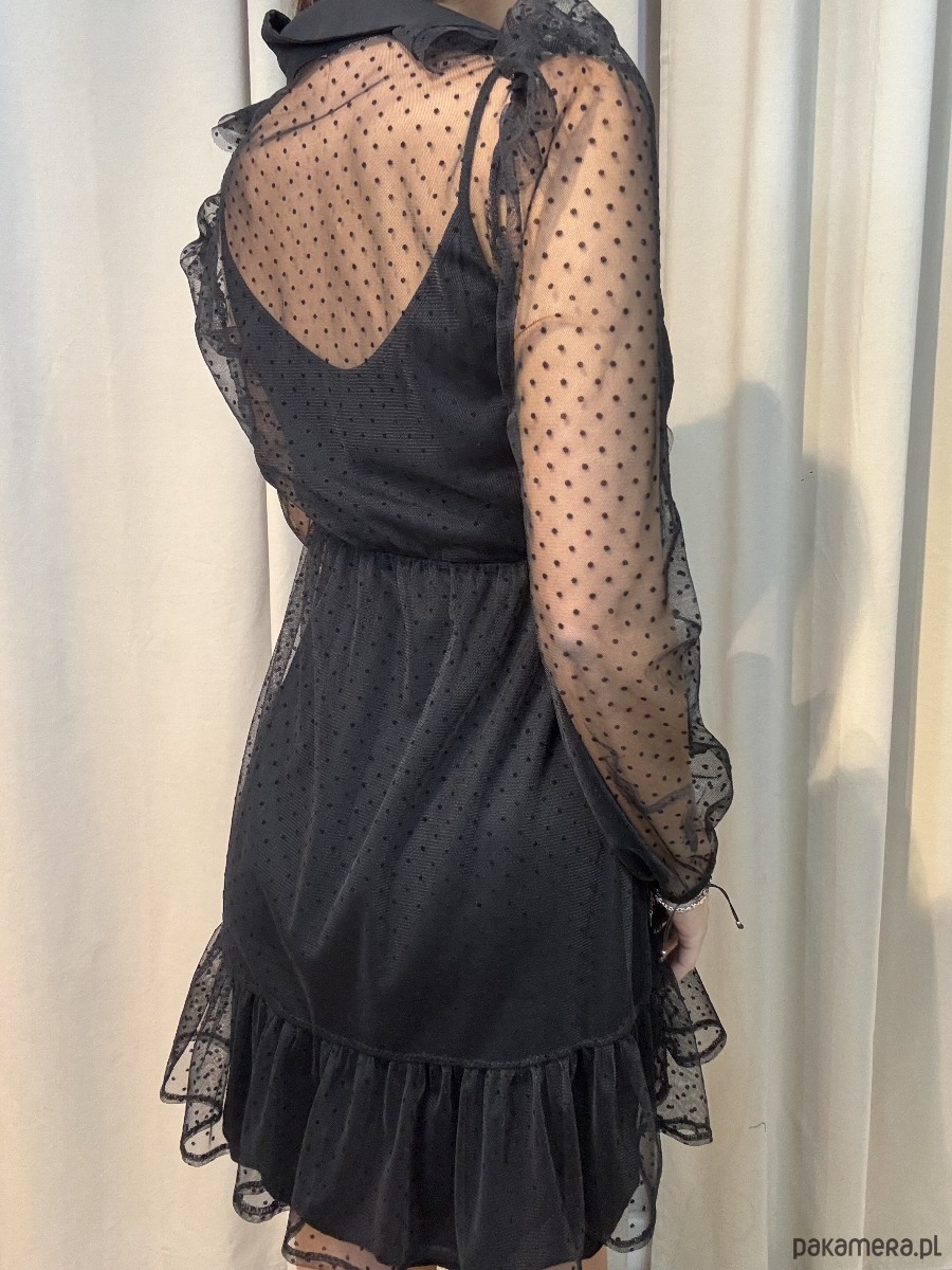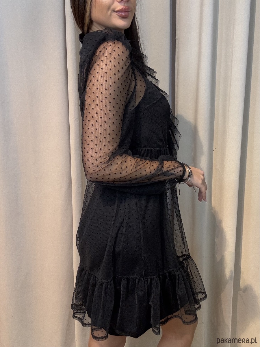 Elegancka sukienka w grochy z siateczką. Posiada halkę oraz siateczkę.