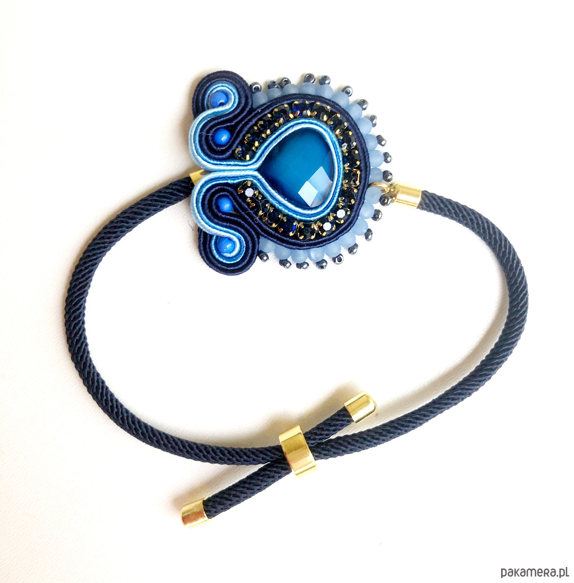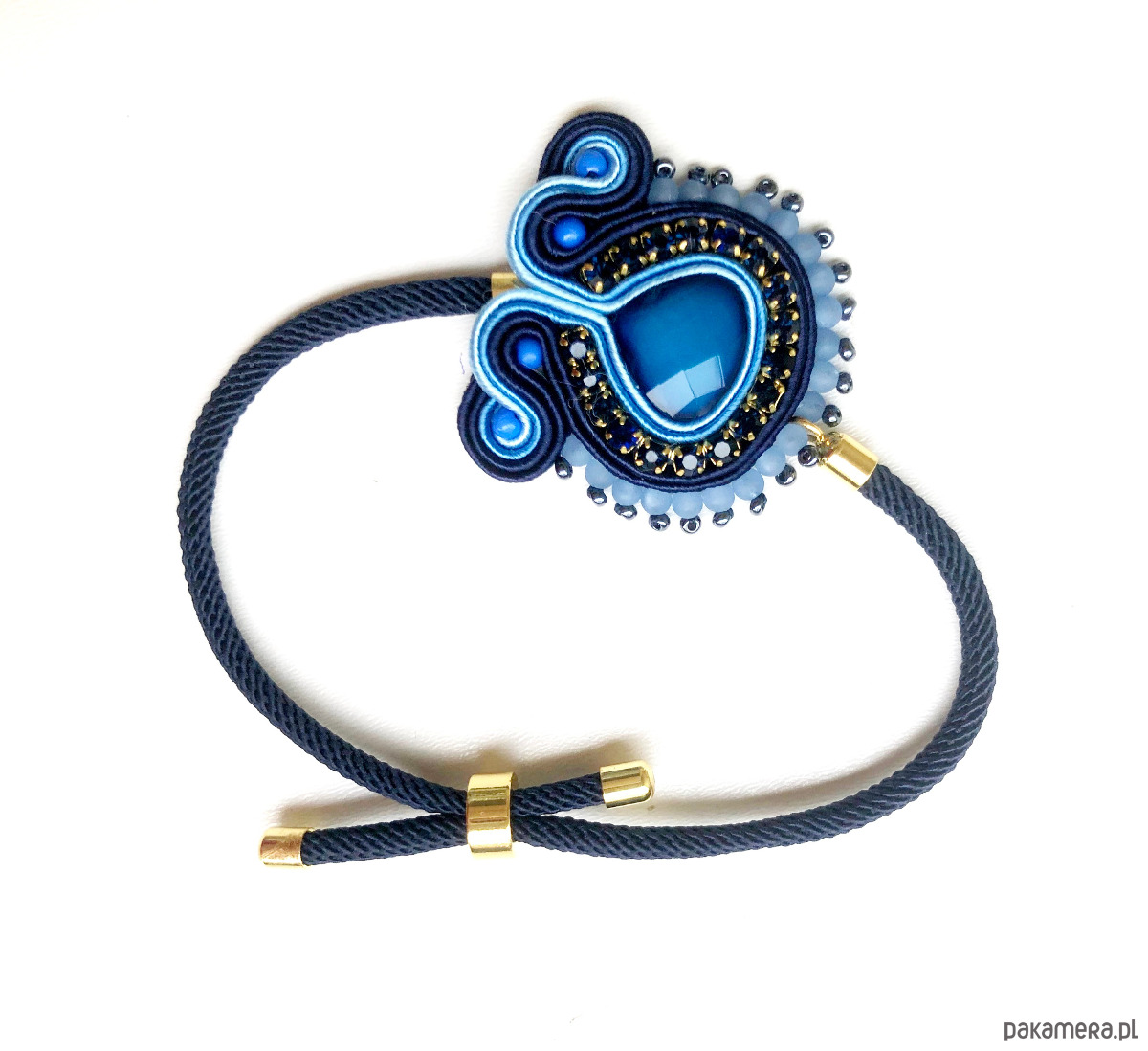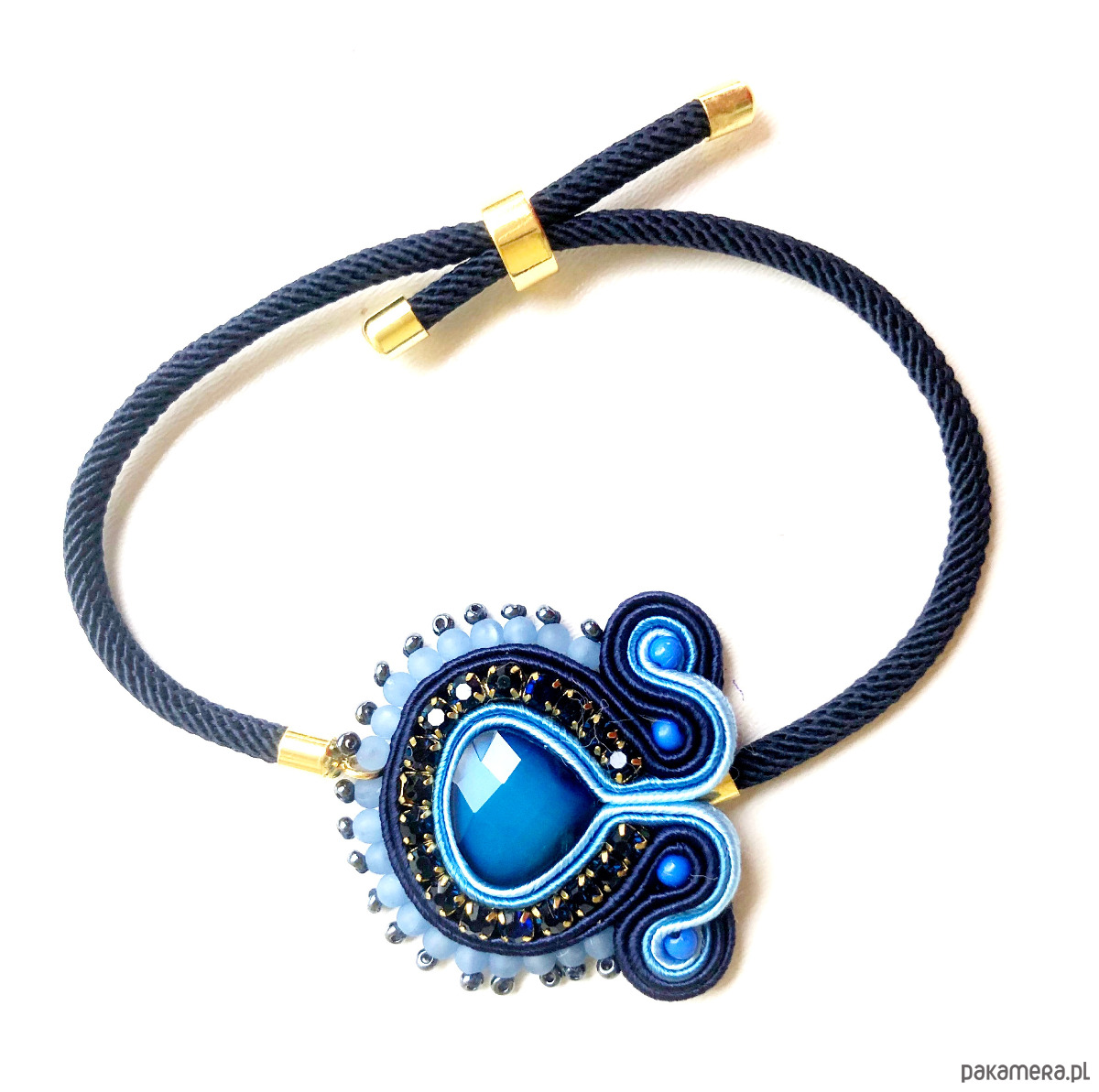 Elegancka bransoletka wykonana w technice haftu sutaszowego w odcieniach: granatu i niebieskiego. Długość regulowana.
