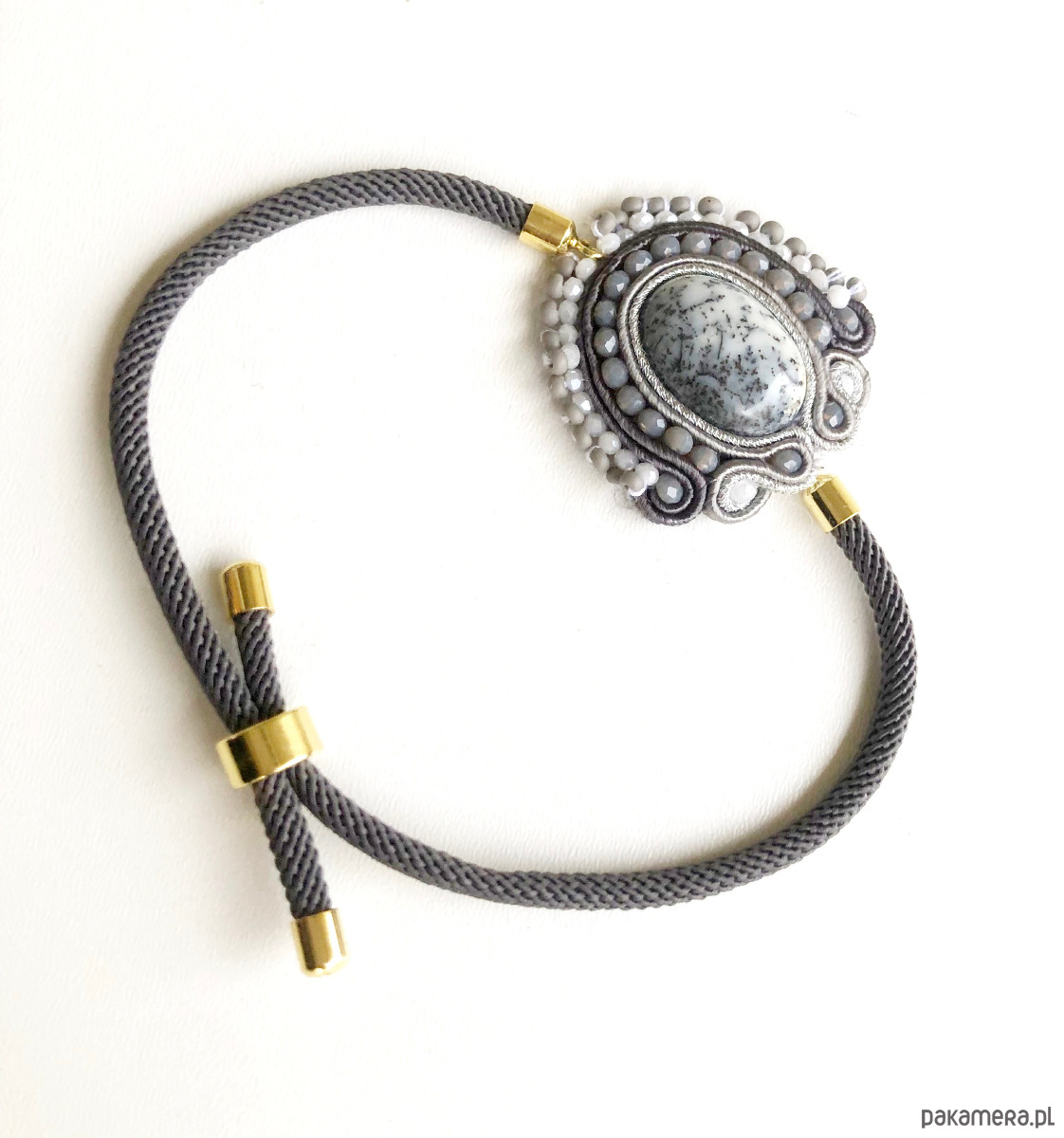 Elegancka bransoletka wykonana w technice haftu sutaszowego w odcieniach: szarości z howlitem. Długość regulowana.