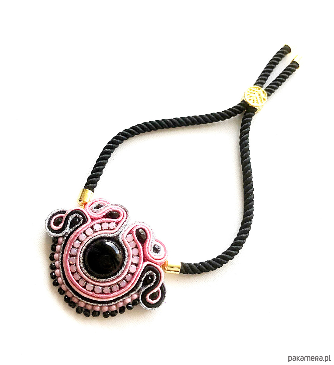Elegancka bransoletka wykonana w technice haftu sutaszowego w odcieniach: różu i czerni. Długość regulowana.