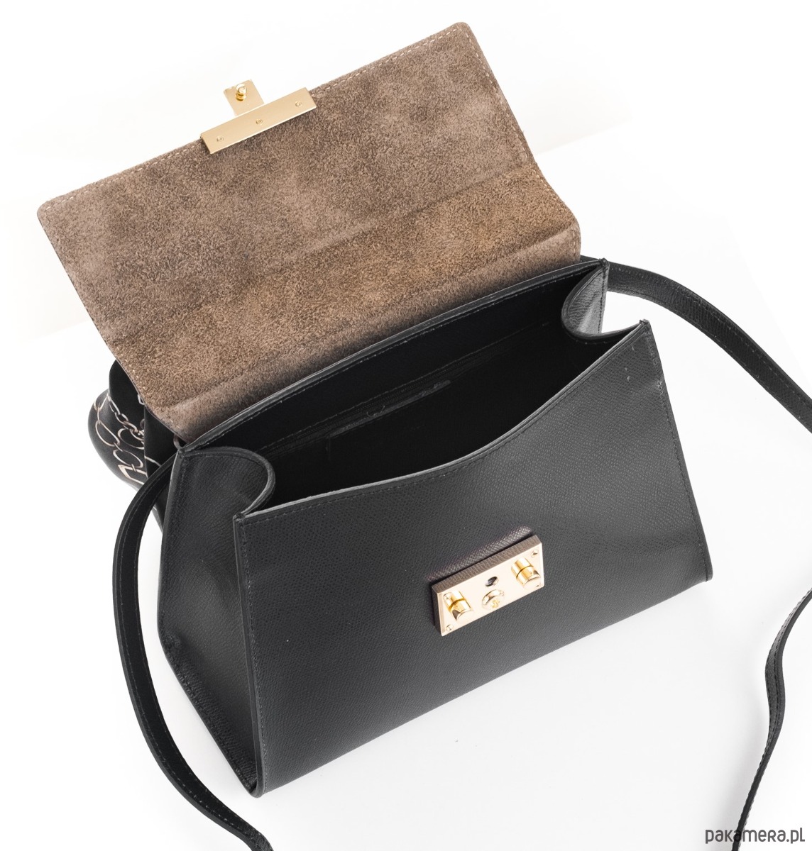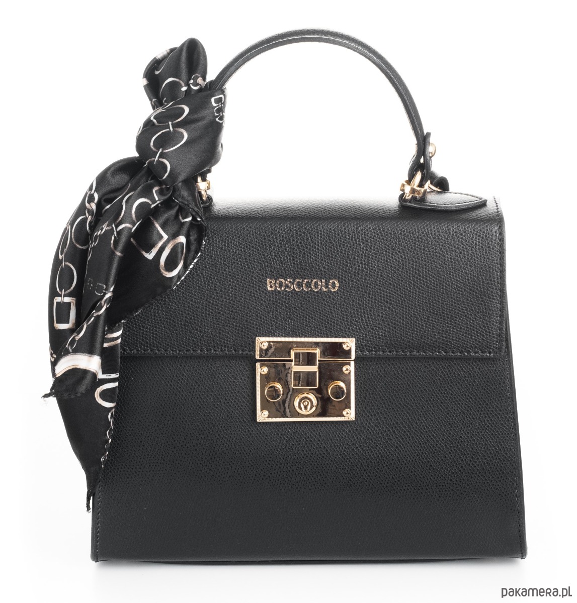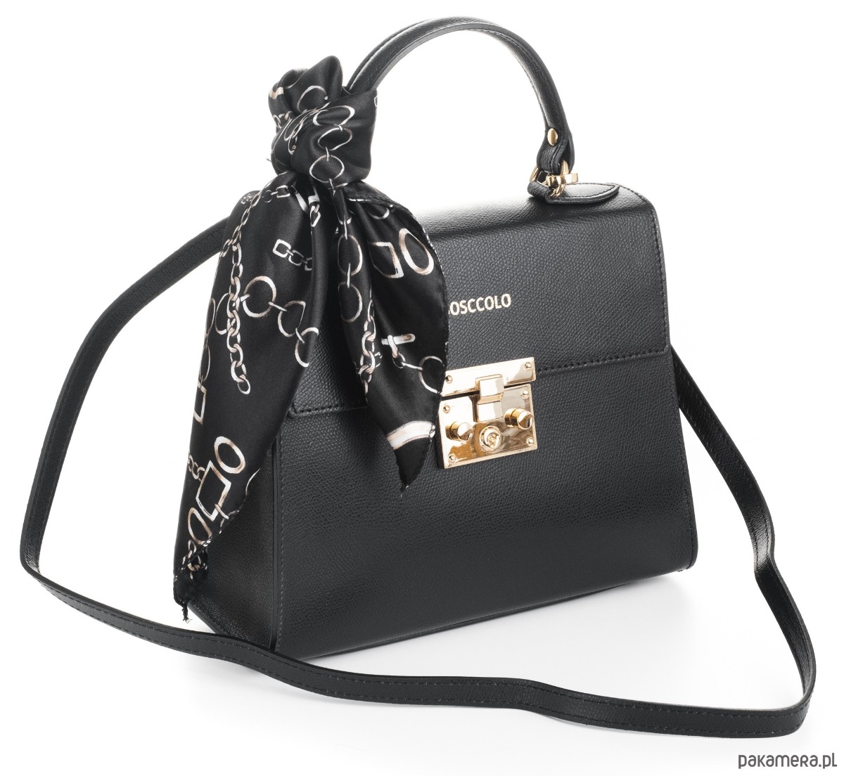 Kuferek, do ręki lub na ramię, dopinany pasek i dopasowana apaszka.
