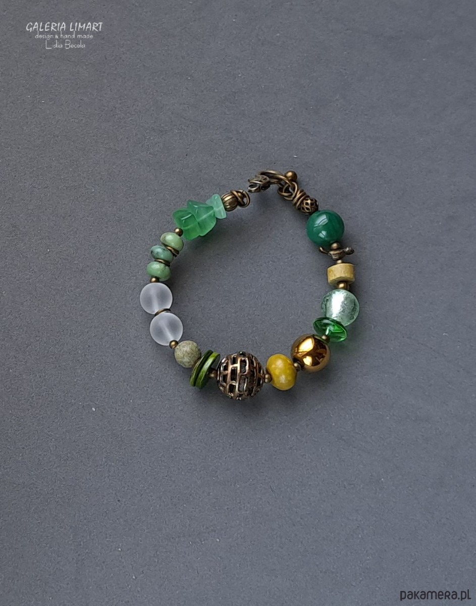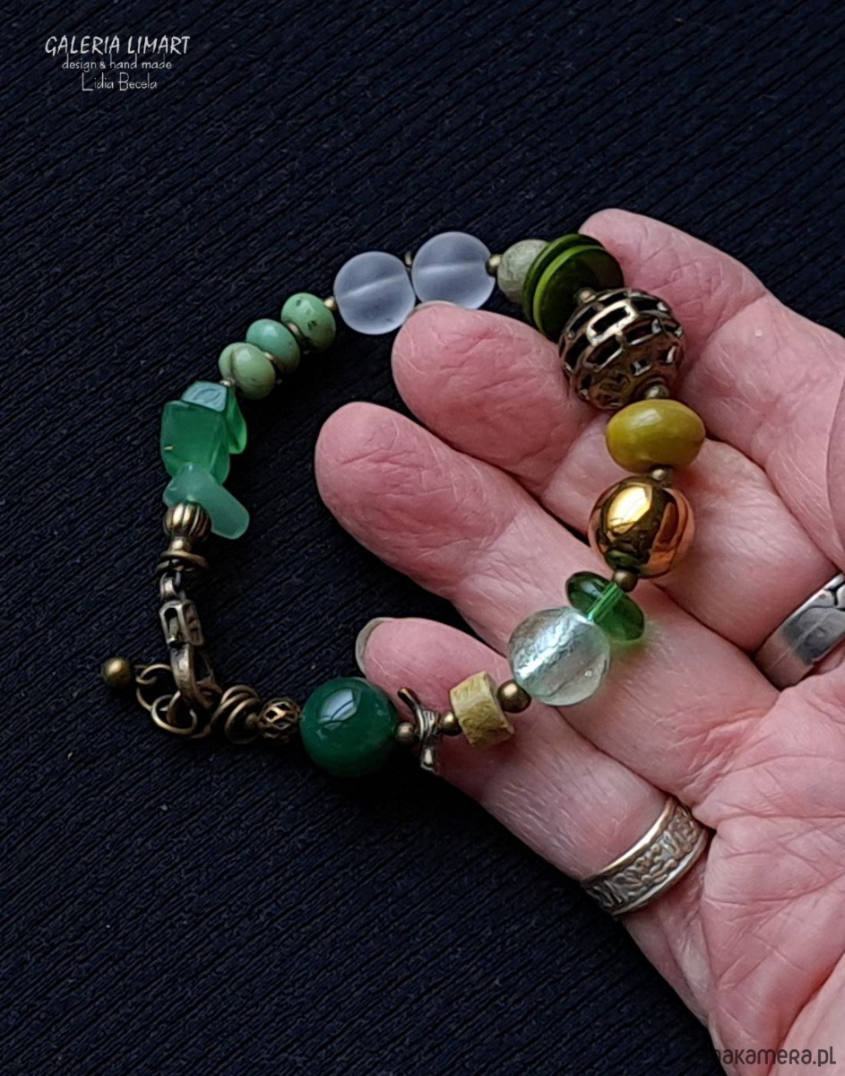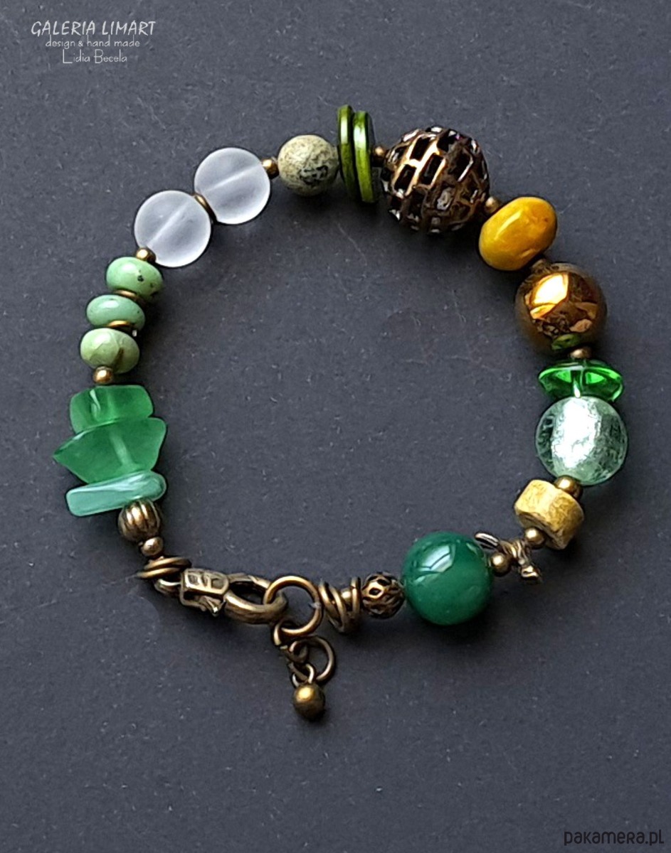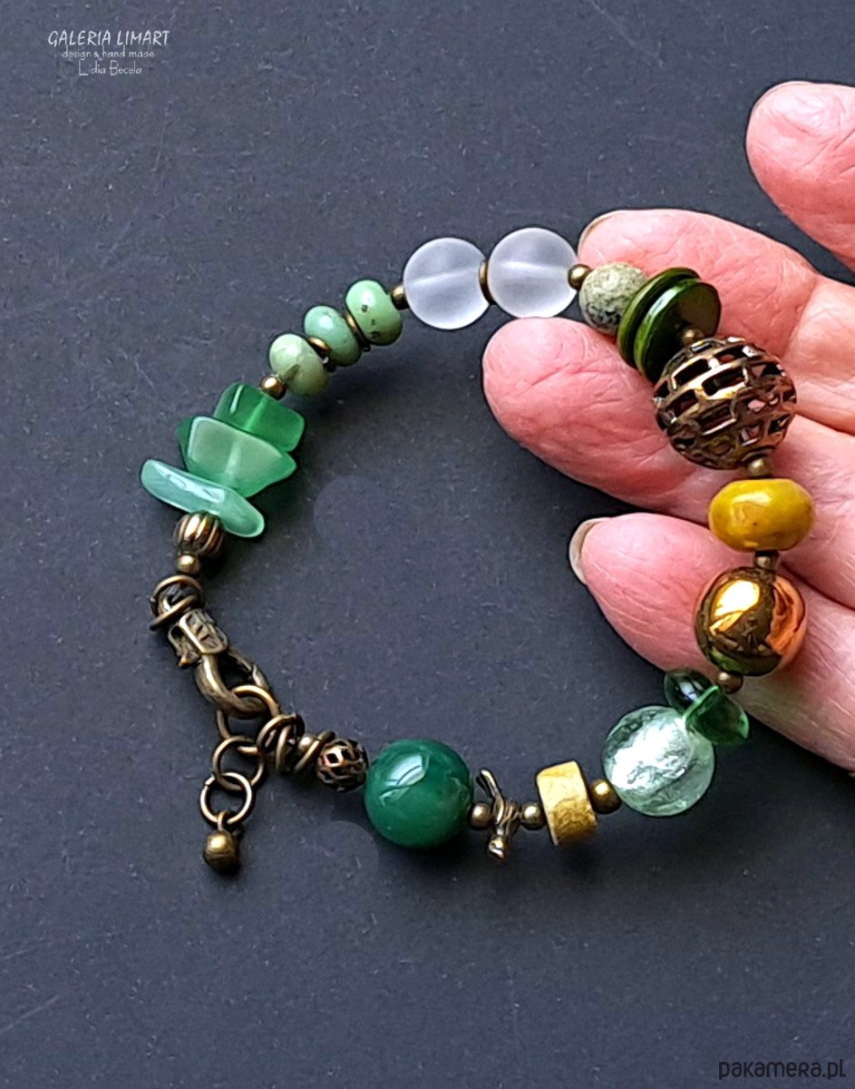 Oto elegancka, efektowna i niezwykła bransoletka, która powstała dzięki unikatowej kompozycji przeróżnych minerałów (agat, jaspis, jadeit, awenturyn, egzotyczne drewno i nasiona, muszla, turkus afrykański i piękne ozdoby z mosiądzu, m.in. duża ażurowa kula). Minerały zostały bardzo starannie dobrane i dopasowane w przepięknej zielonej kolorystyce w taki sposób by powstała oryginalna unikatowa bransoletka jedyna w swoim rodzaju. Ten przemyślany melanż minerałów dał w efekcie stylową bransoletką dla eleganckiej kobiety, która doceni jej urodę.