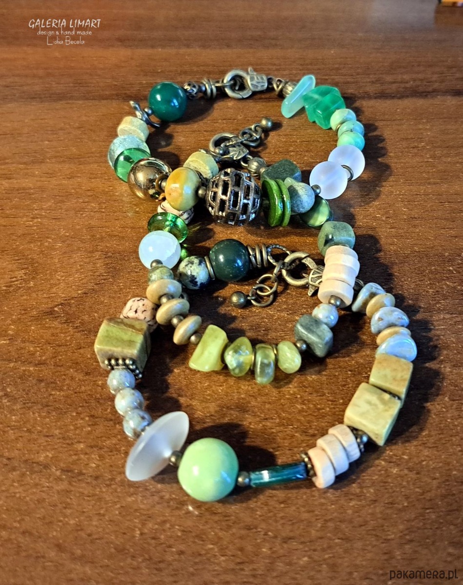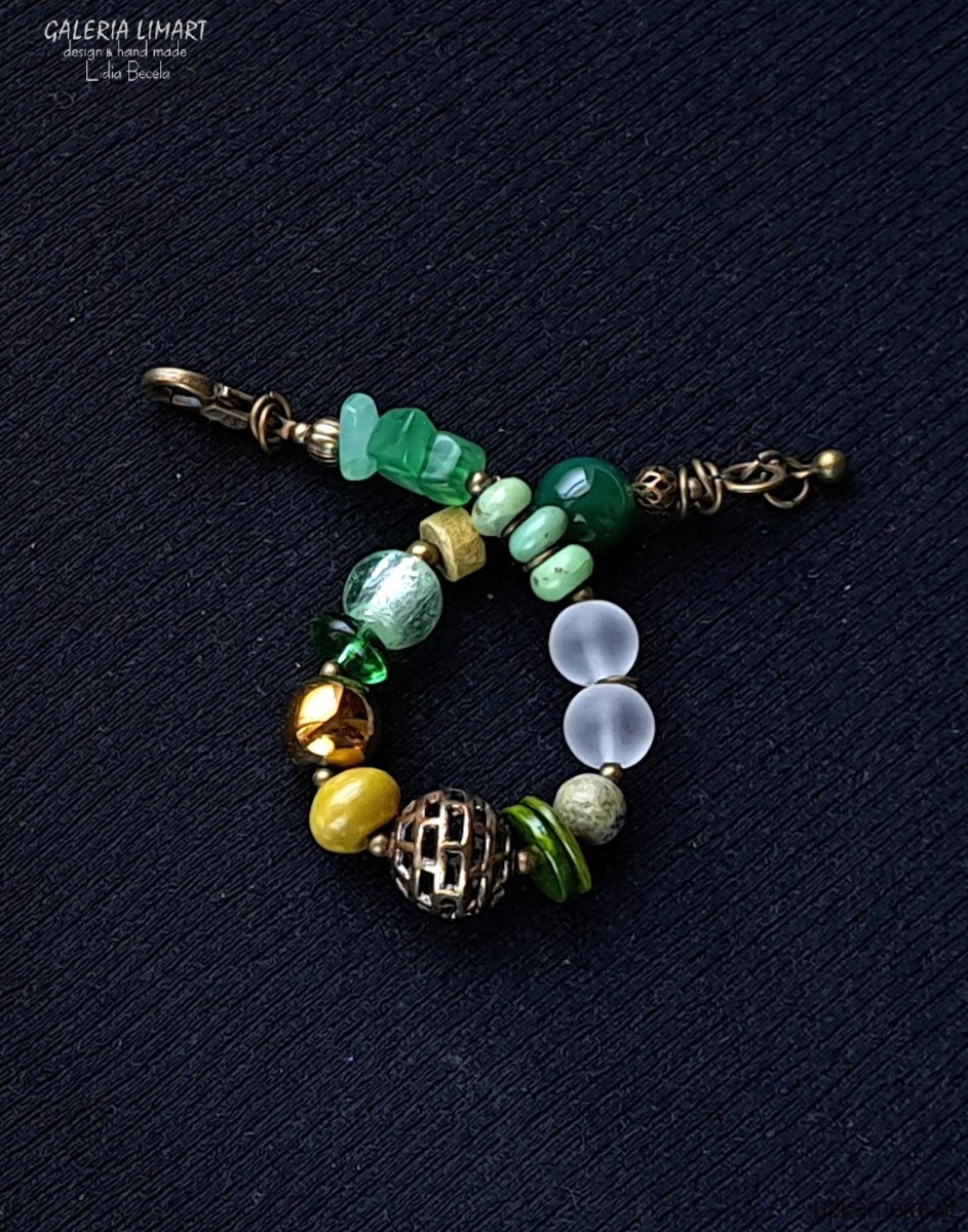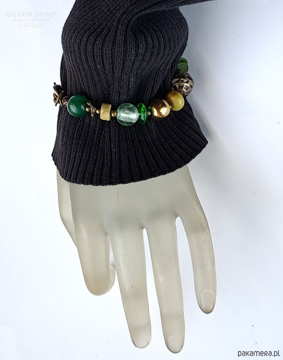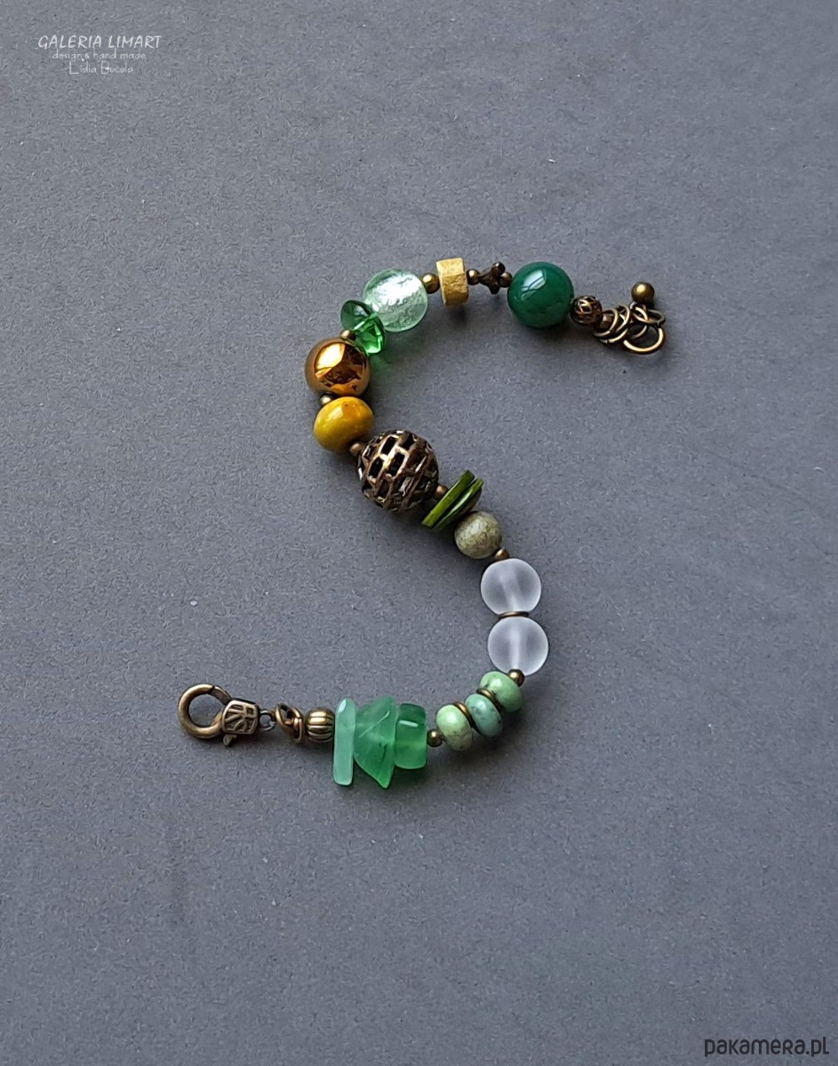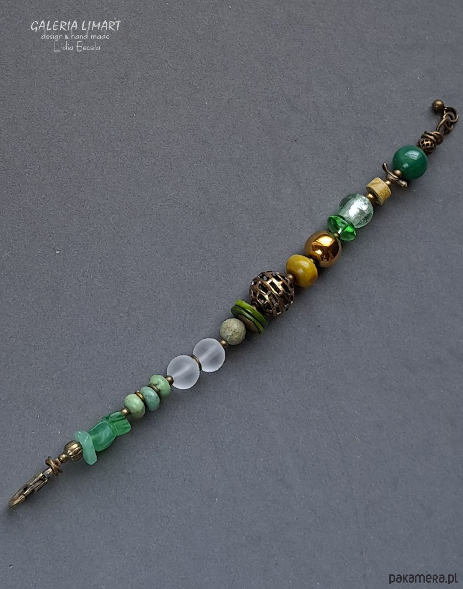 Oto elegancka, efektowna i niezwykła bransoletka, która powstała dzięki unikatowej kompozycji przeróżnych minerałów (agat, jaspis, jadeit, awenturyn, egzotyczne drewno i nasiona, muszla, turkus afrykański i piękne ozdoby z mosiądzu, m.in. duża ażurowa kula). Minerały zostały bardzo starannie dobrane i dopasowane w przepięknej zielonej kolorystyce w taki sposób by powstała oryginalna unikatowa bransoletka jedyna w swoim rodzaju. Ten przemyślany melanż minerałów dał w efekcie stylową bransoletką dla eleganckiej kobiety, która doceni jej urodę.