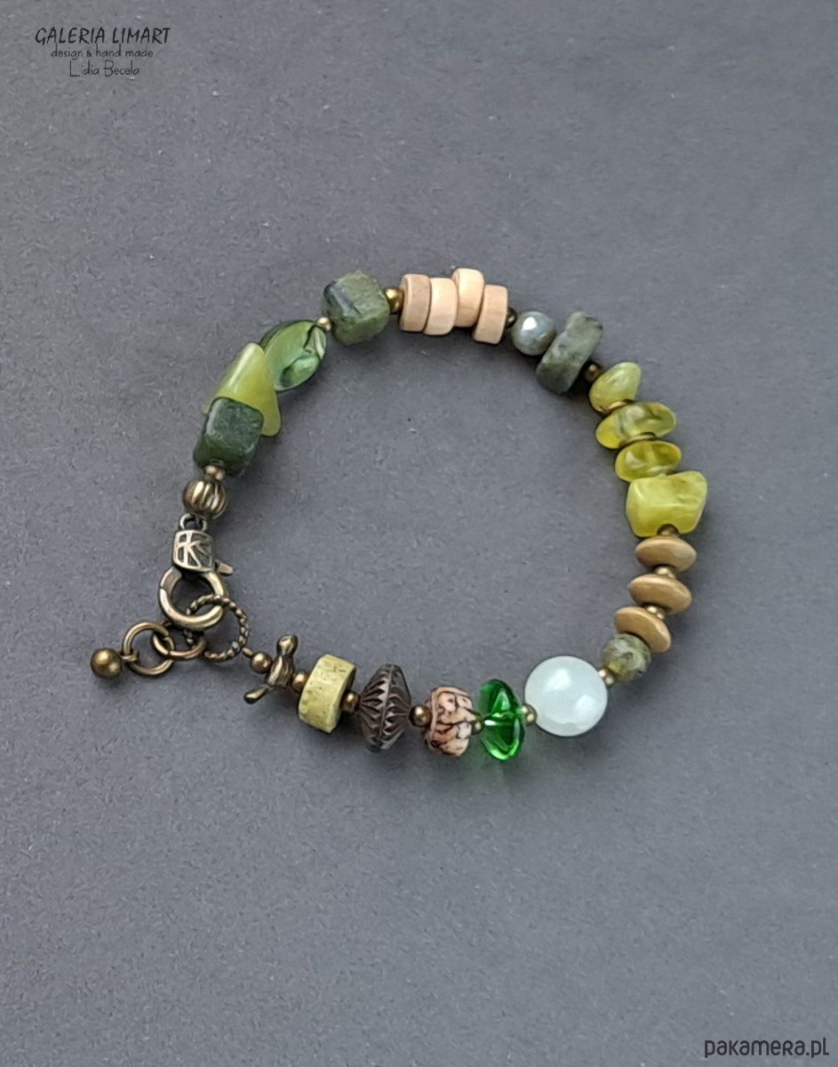 Oto elegancka, efektowna i niezwykła bransoletka, która powstała dzięki unikatowej kompozycji przeróżnych minerałów (agat, jaspis, jadeit, awenturyn, egzotyczne drewno i nasiona, muszla, turkus afrykański i piękne ozdoby z mosiądzu). Minerały zostały bardzo starannie dobrane i dopasowane w przepięknej zielonej kolorystyce w taki sposób by powstała oryginalna unikatowa bransoletka jedyna w swoim rodzaju. Ten przemyślany melanż minerałów dał w efekcie stylową bransoletką dla eleganckiej kobiety, która doceni jej urodę.