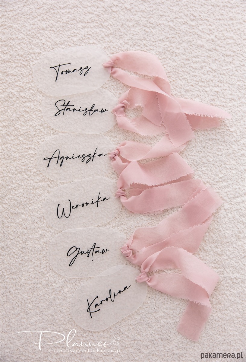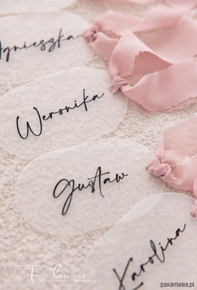 Elegancka winietka ślubna na folii to subtelny i nowoczesny sposób oznaczenia miejsc dla gości. Transparentne tło z nadrukiem nadaje jej lekkości i wyjątkowego charakteru. Świetnie komponuje się z różnymi aranżacjami stołów, od minimalistycznych po glamour. To praktyczny i estetyczny detal, który podkreśla wyjątkowość uroczystości.
