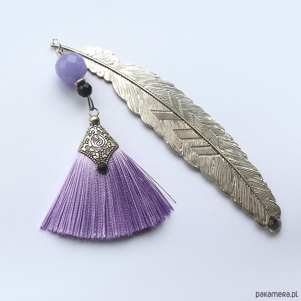 Elegancka etno zakładka do książki z fioletowym chalcedonem, fasetowanym onyksem z oryginalnym chwostem.Ozdobiona ręcznie.