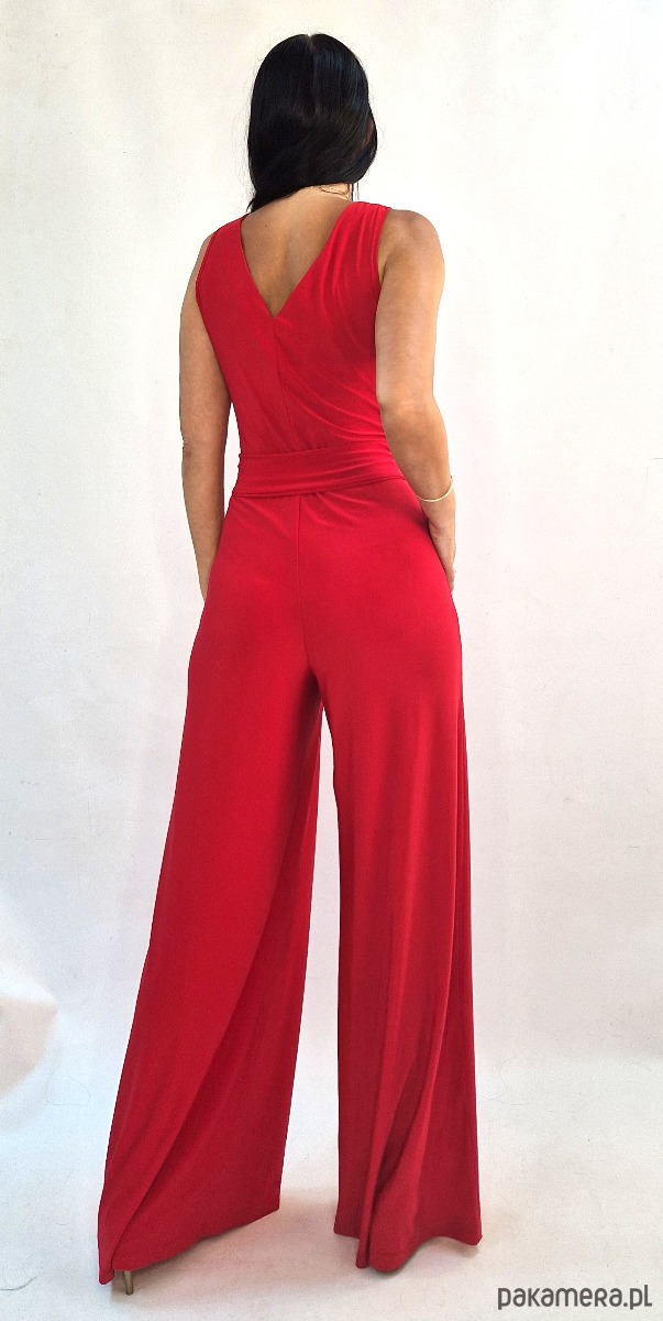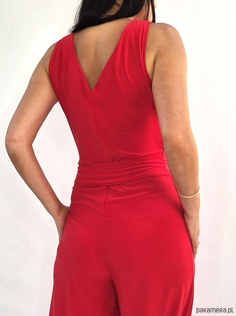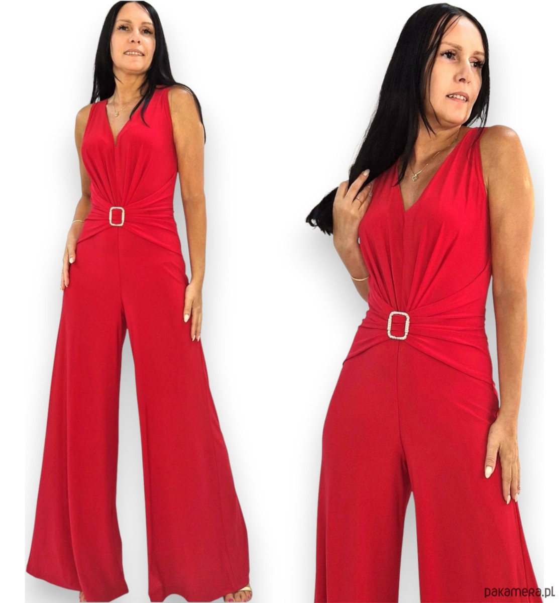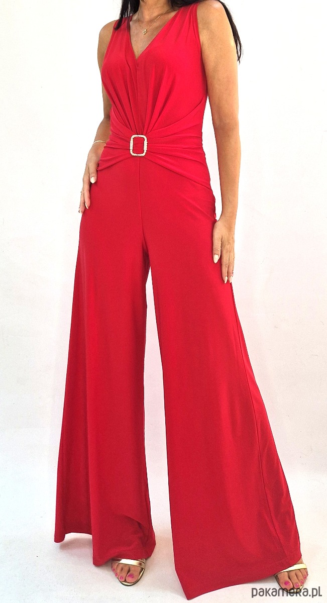 Czerwony elegancki kombinezon z draperią i ozdobną klamrą dostępny w rozmiarach od 34-48