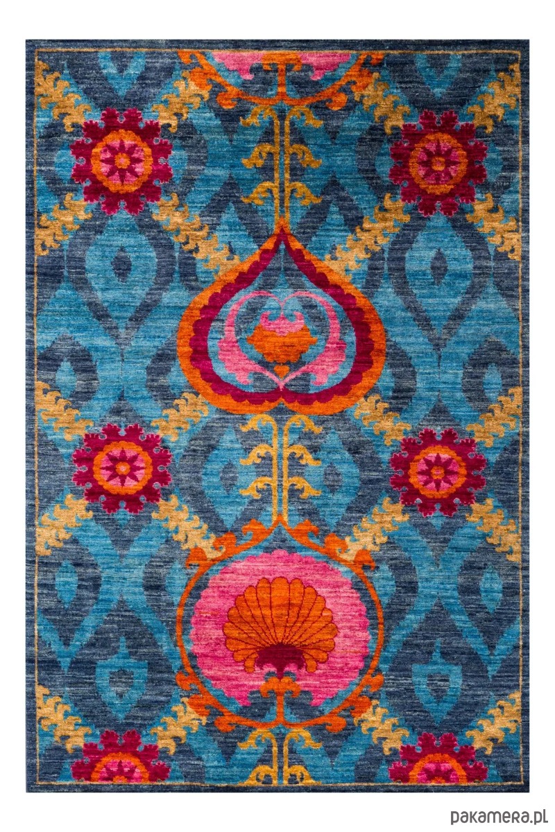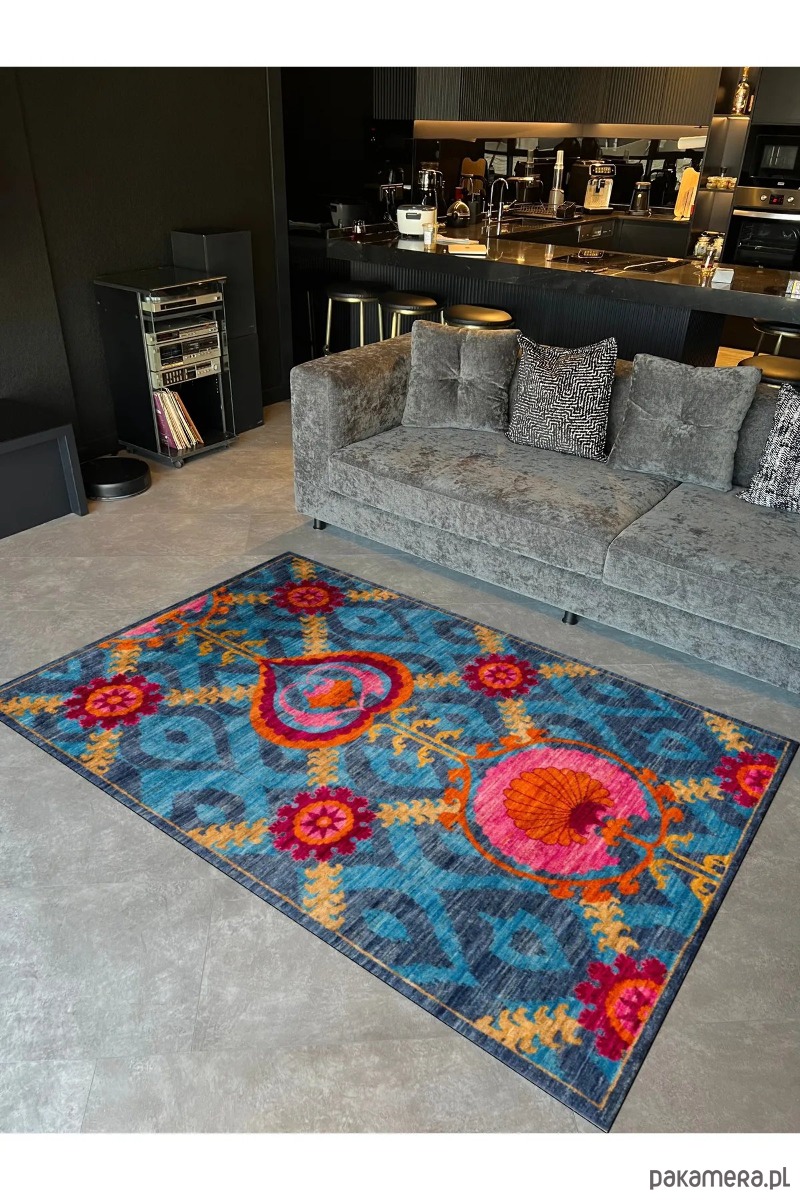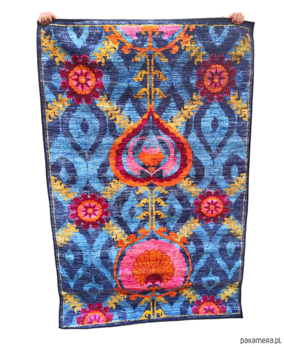 Zainspiruj się orientalnym urokiem z naszym dywanem dekoracyjnym w stylu Suzani. Unikalny wzór ikat w żywych kolorach fuksji, pomarańczy i niebieskim doda charakteru każdemu wnętrzu. Wykonany z wysokiej jakości materiałów, dywan jest trwały i łatwy w pielęgnacji. Idealny do salonu, sypialni lub pokoju młodzieżowego.
