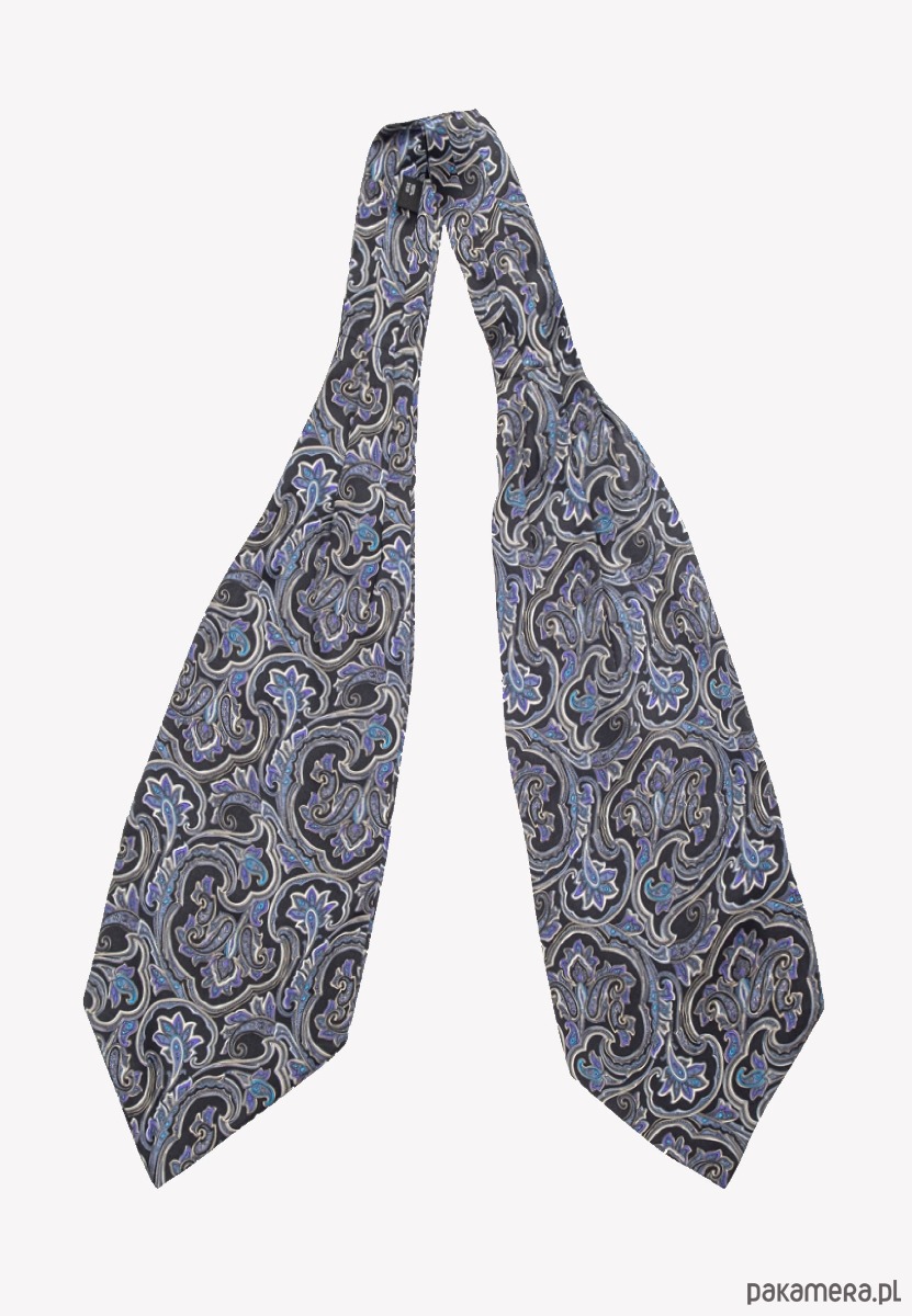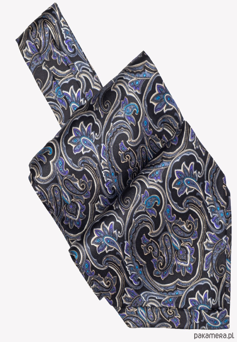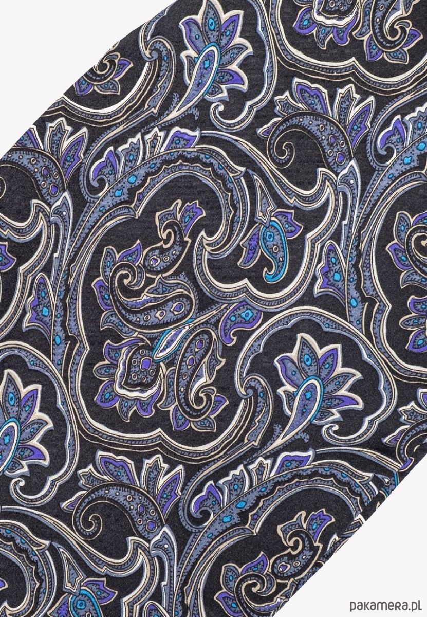 Fular jedwabny to elegancki dodatek w głębokiej, grafitowo-czarnej tonacji, przełamanej odcieniami błękitu i subtelnymi akcentami fioletu. Klasyczny wzór paisley w nowoczesnym wydaniu nadaje całości wyrafinowanego, ale zdecydowanego charakteru. Wykonany z wysokiej jakości jedwabiu, jest miękki, lekki i doskonale układa się pod kołnierzem koszuli, podkreślając styl i klasę.