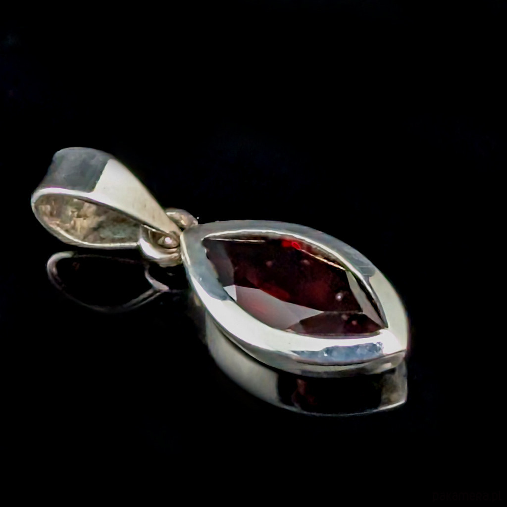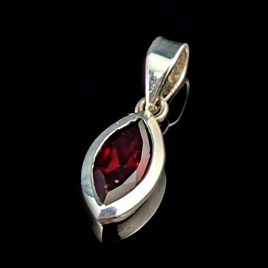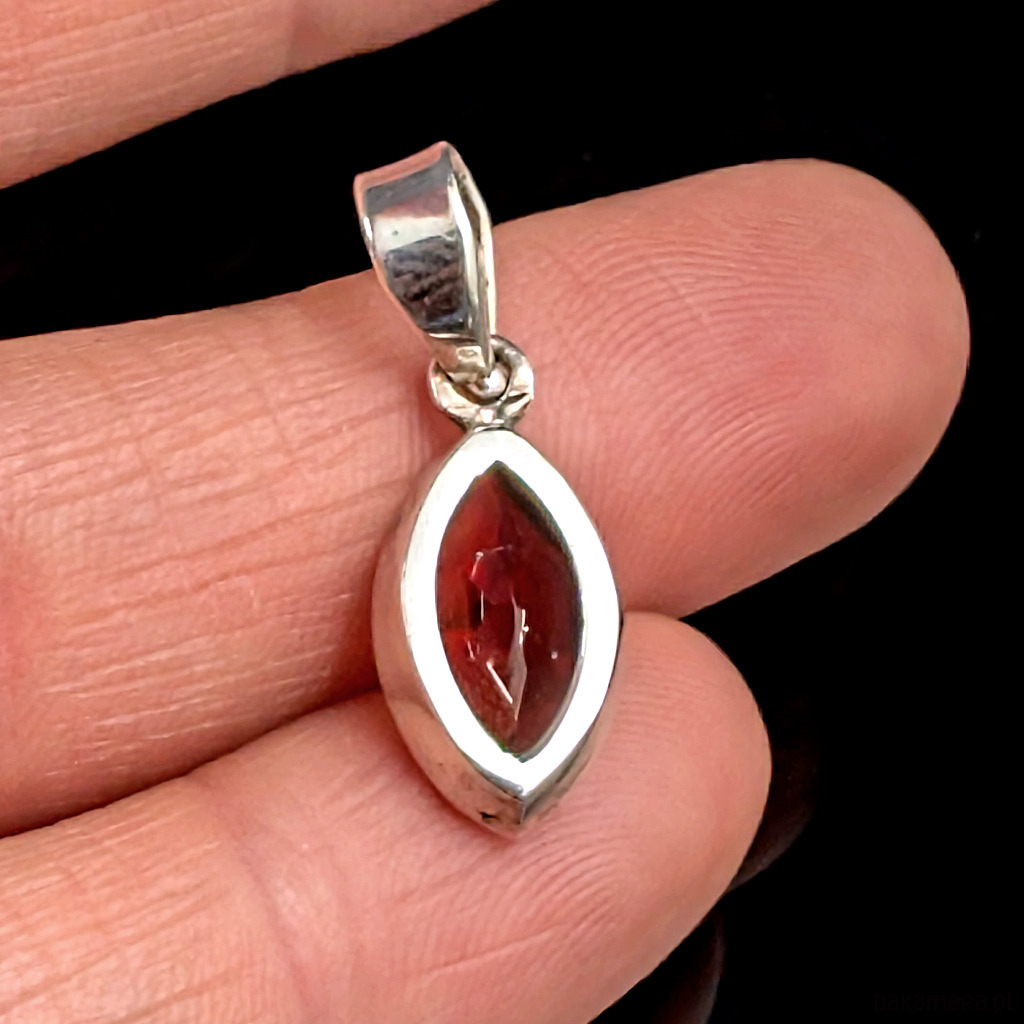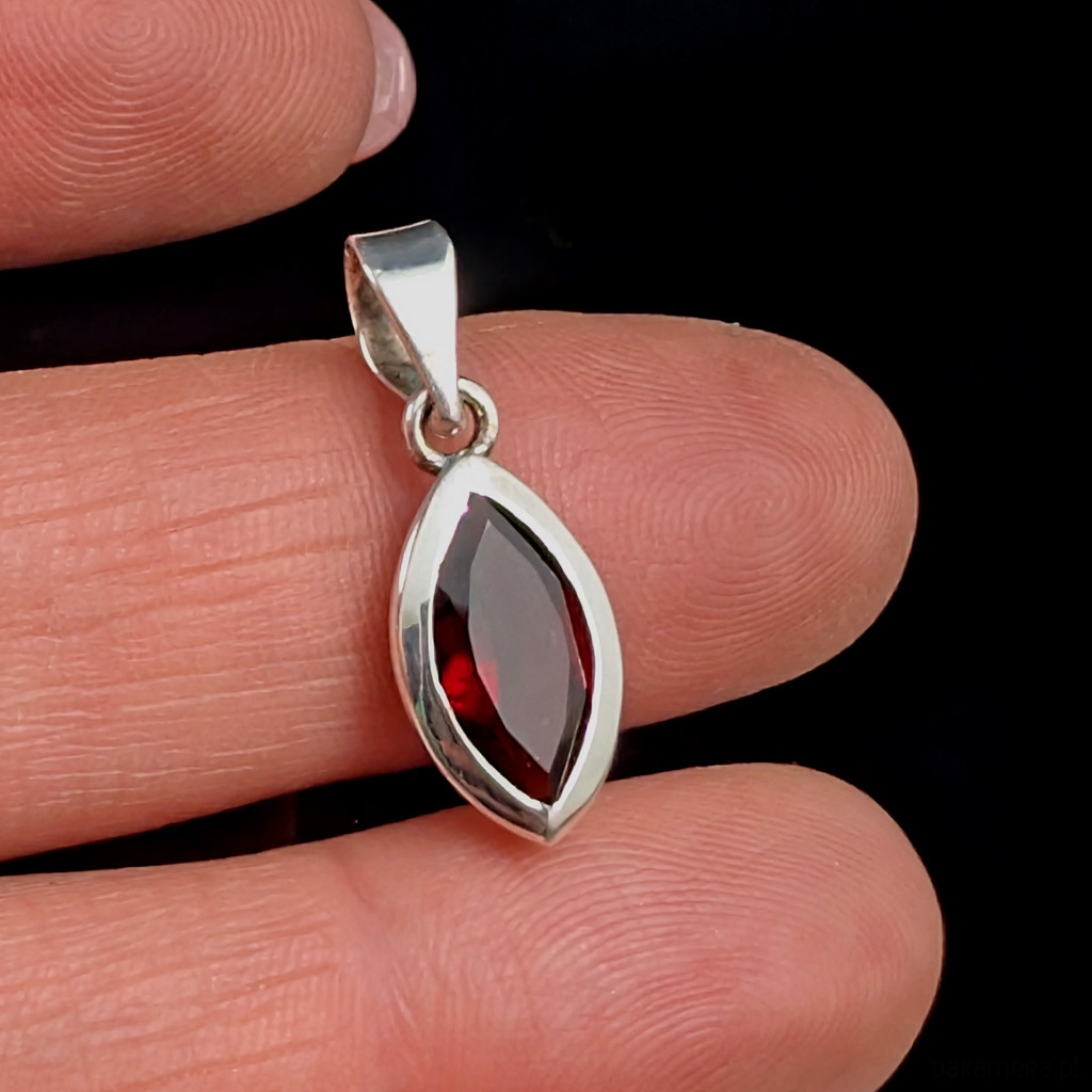 Subtelny, piękny granat w oprawie srebra próby 925. Wymiary 13 x 8 mm. Długość wisiorka 23 mm. Waga 2,15 grama. Polecam, uroczy drobiazg.