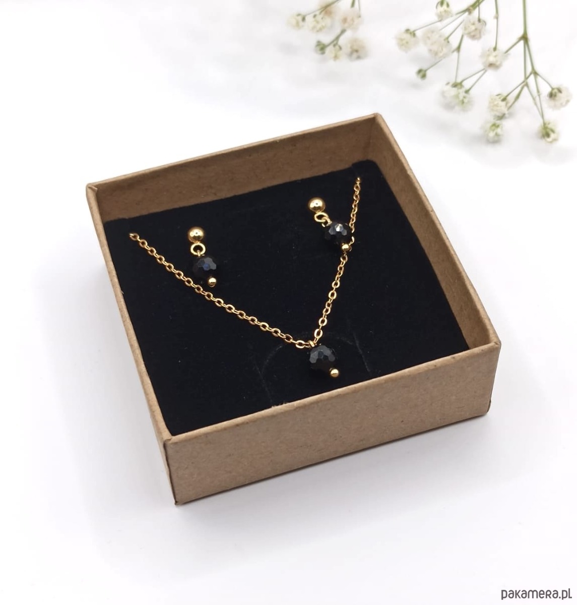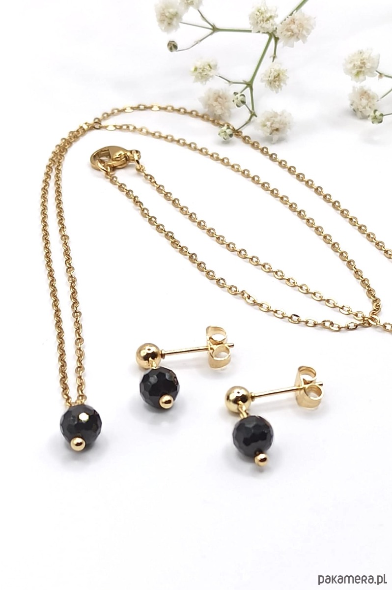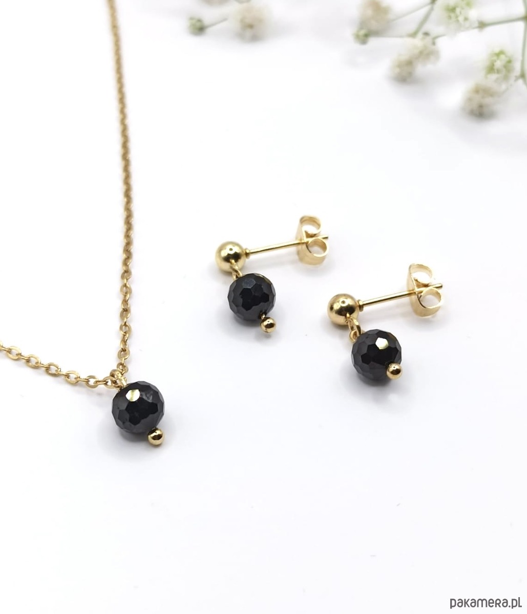 Subtelny i elegancki minimalistyczny komplet biżuterii z kamieniami czarnego turmalinu.