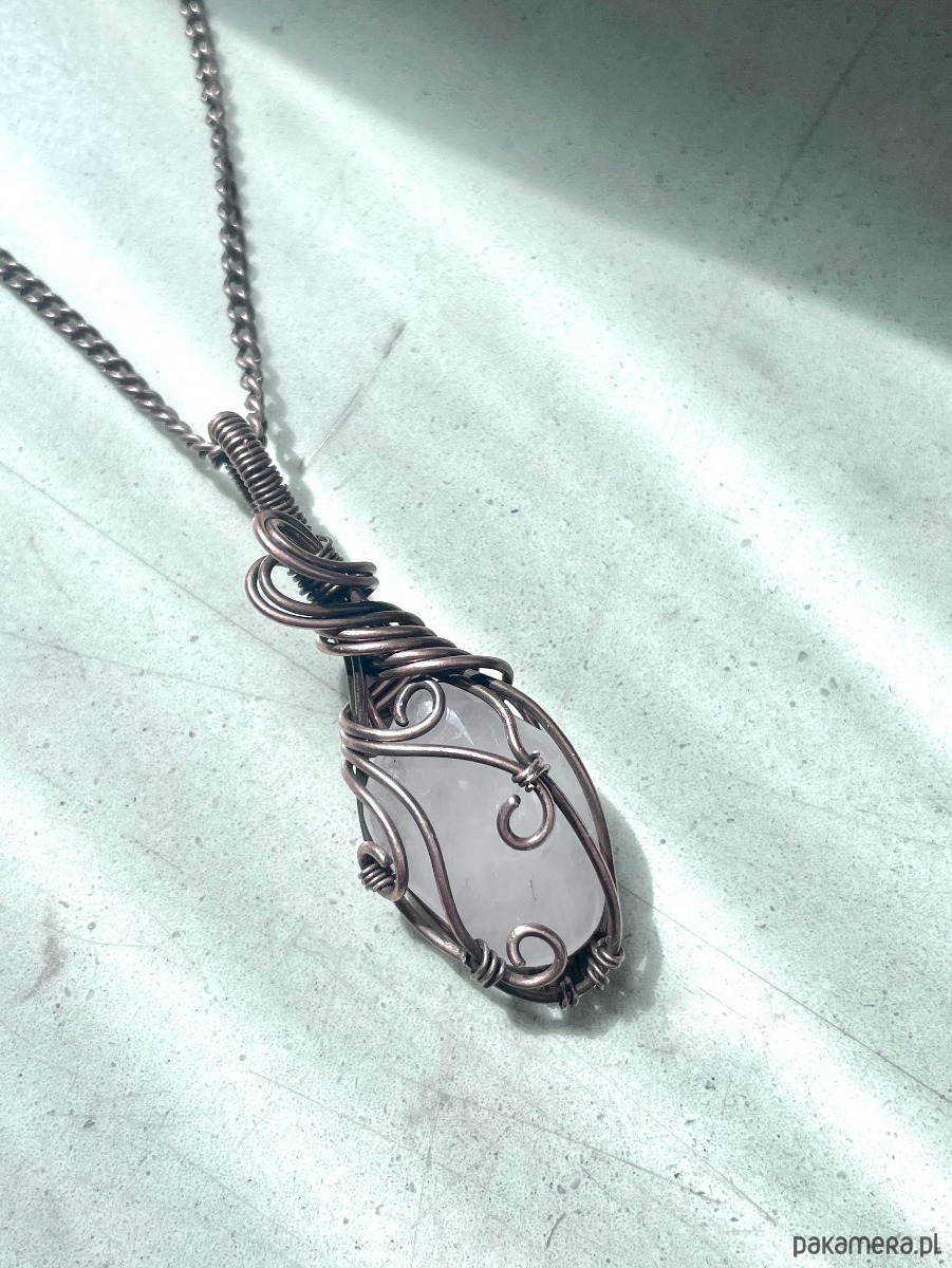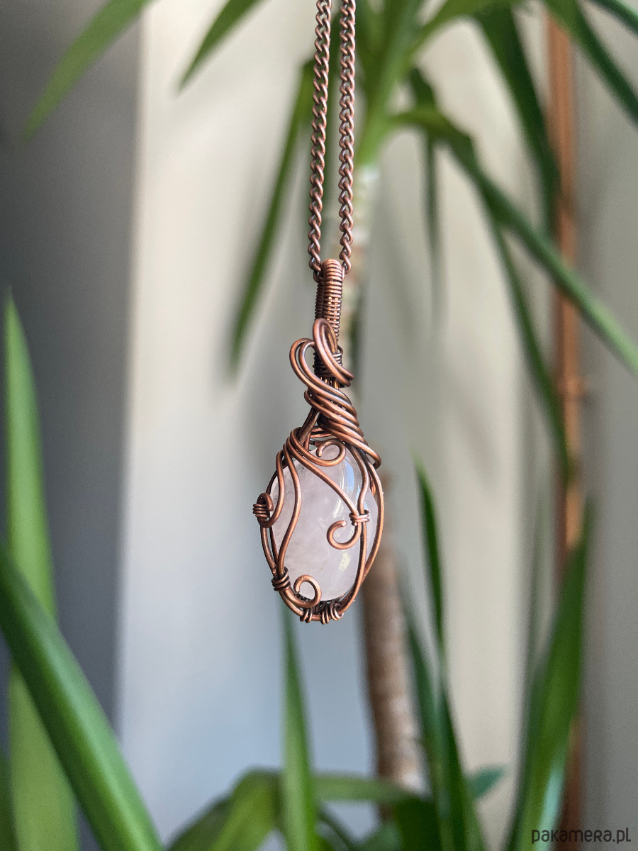 Ręcznie wykonany Elegancki miedziany wisiorek z kwarcem różowym. Kamieniem, który symbolizuje miłość do samej siebie oraz wspiera kobiecą energię Świetnie nadaje się za równo na co dzień jak i na specjalne okazje. Wysokość ozdoby to 4,5 cm, Idealny na prezent! Ozdoba po oksydacji (postarzana) oraz szlifowaniu. Nie drapie i jest komfortowa w noszeniu. Ozdoba sprzedawana jest bez łańcuszka.