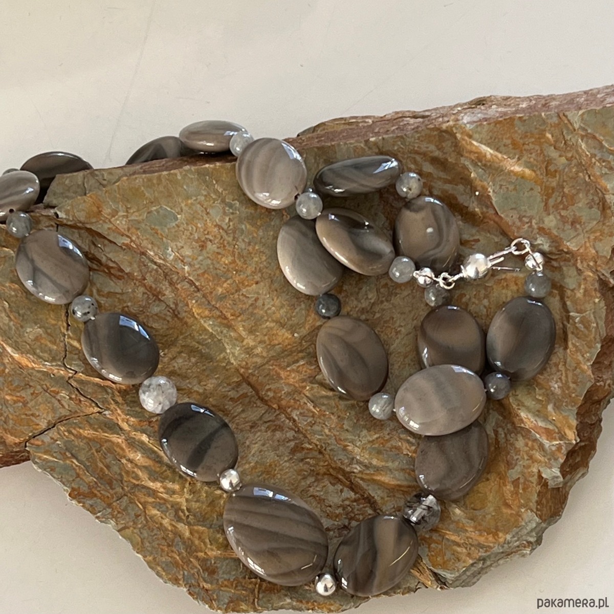 naszyjnik wykonany z owalnych pastylek krzemienia pasiastego , szlifowanych kulek krzemienia pasiastego, kwarcu - kryształu górskiego z igłami turmalinu i zapięcia patentowego kulkowego ze srebra próby 925