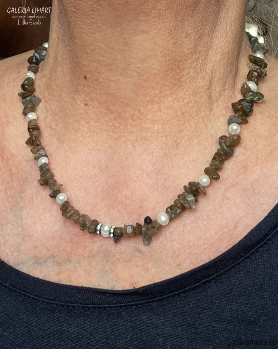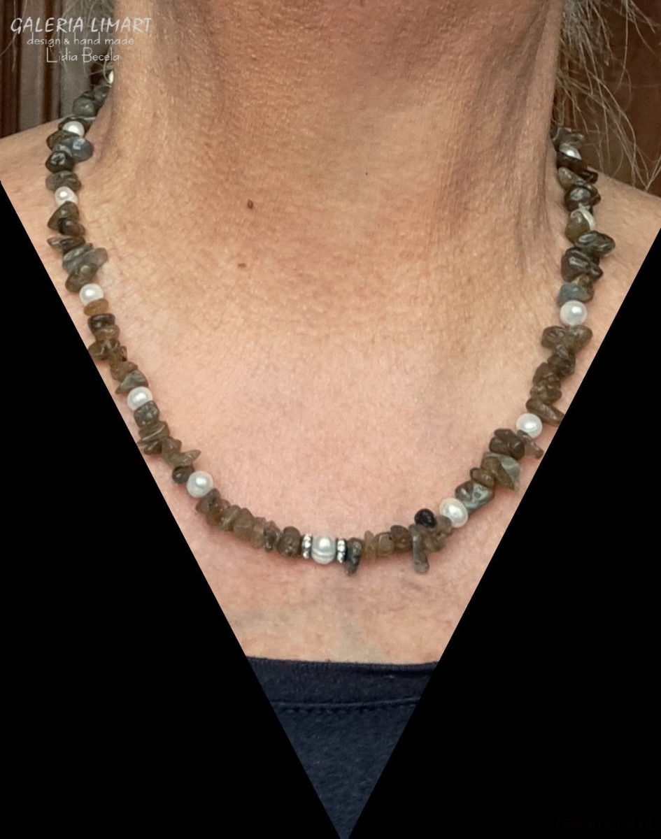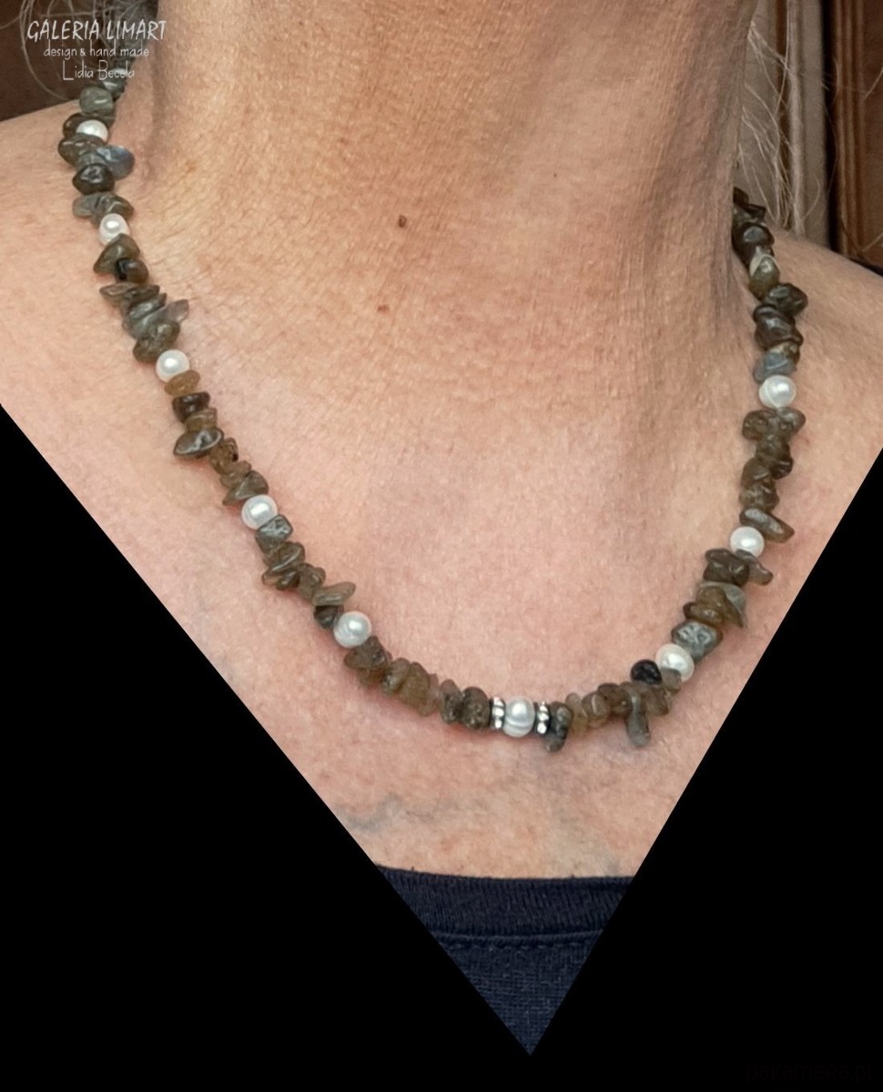 Subtelna, efektowna kompozycja naszyjnika z pięknych drobnych labradorytów przeplecionych prawdziwymi perełkami, co nadaje naszyjnikowi unikatowy i oryginalny charakter, a przekładki z cyrkonii dodają naszyjnikowi urody