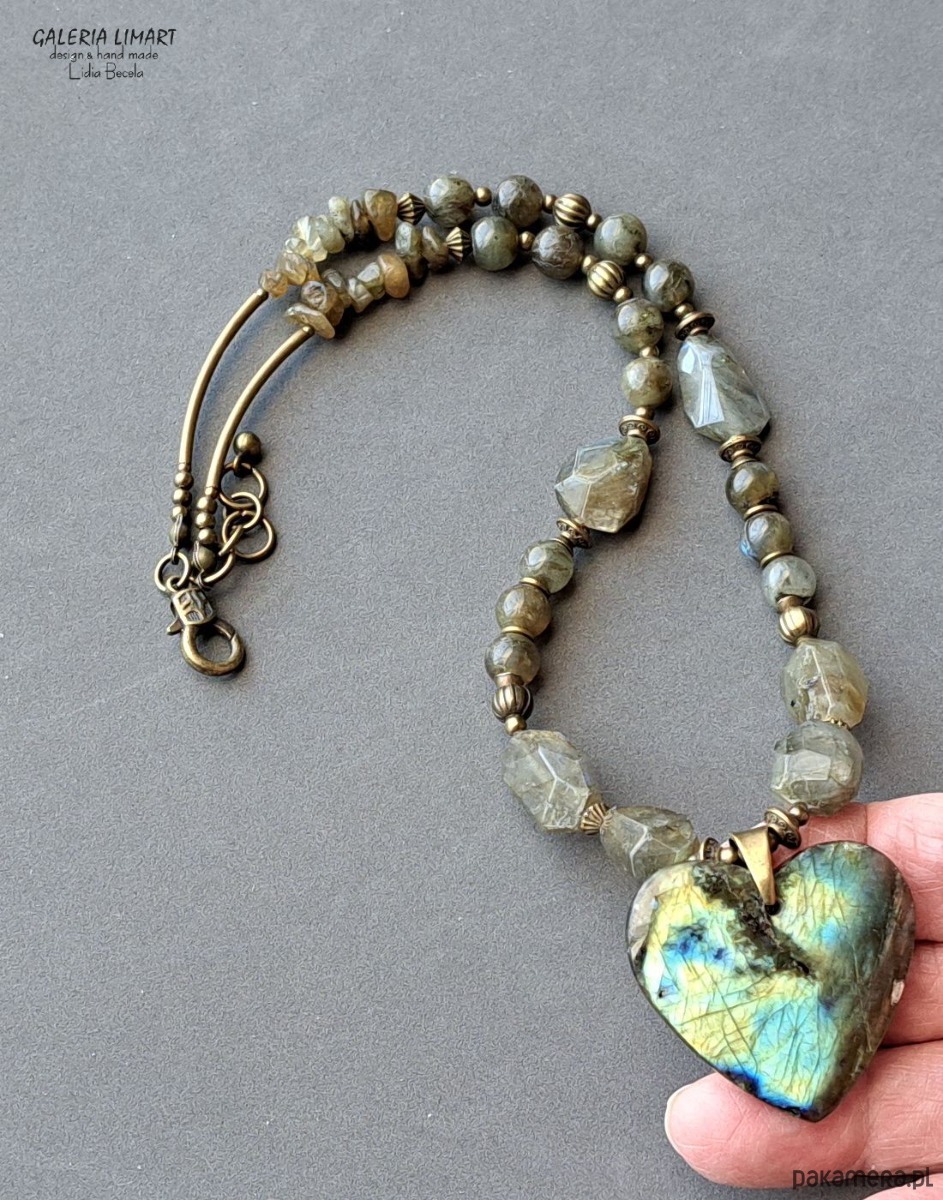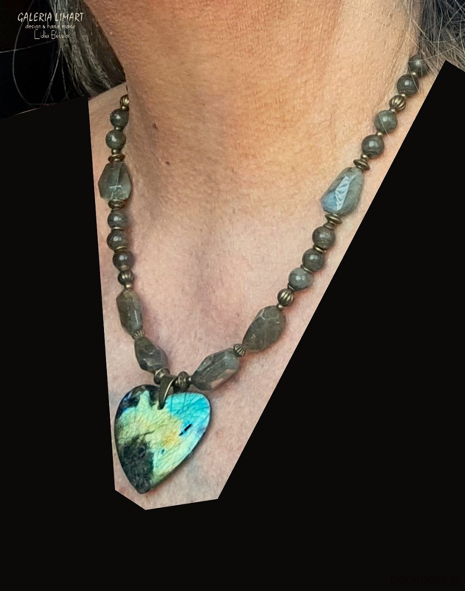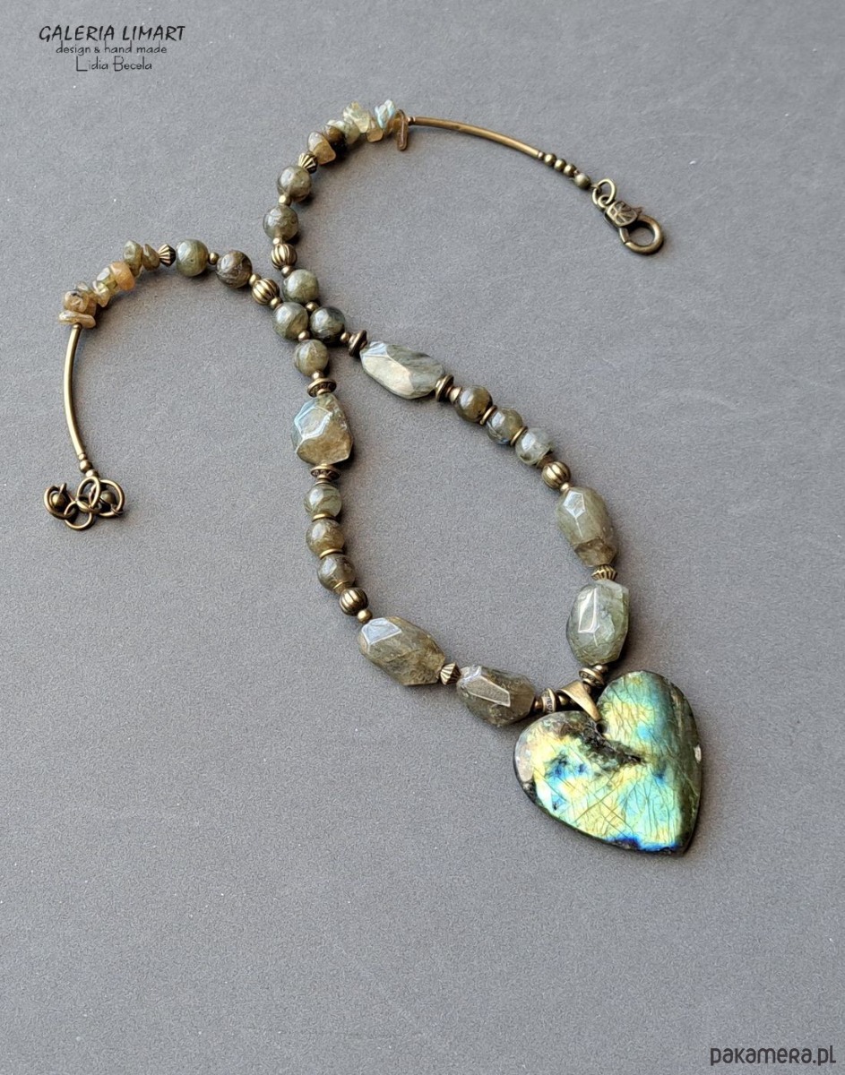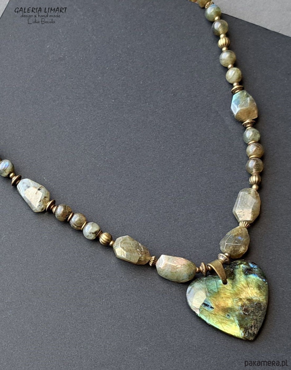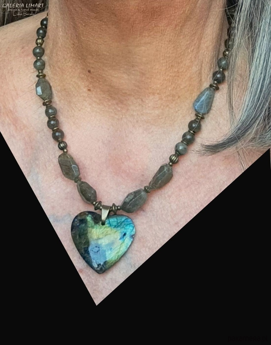 Ogromnie efektowna kompozycja naszyjnika z pięknego unikalnego swym ubarwieniem dużego (ok 4x4 cm) serca z ciekawego labradorytu zawieszonego na naszyjniku z mix różnych labradorytów w tej samej tonacji kolorystycznej, co nadaje naszyjnikowi unikatowy i oryginalny charakter. Dodatkowej urody nadają bardzo ładne ozdoby z mosiądzu.
