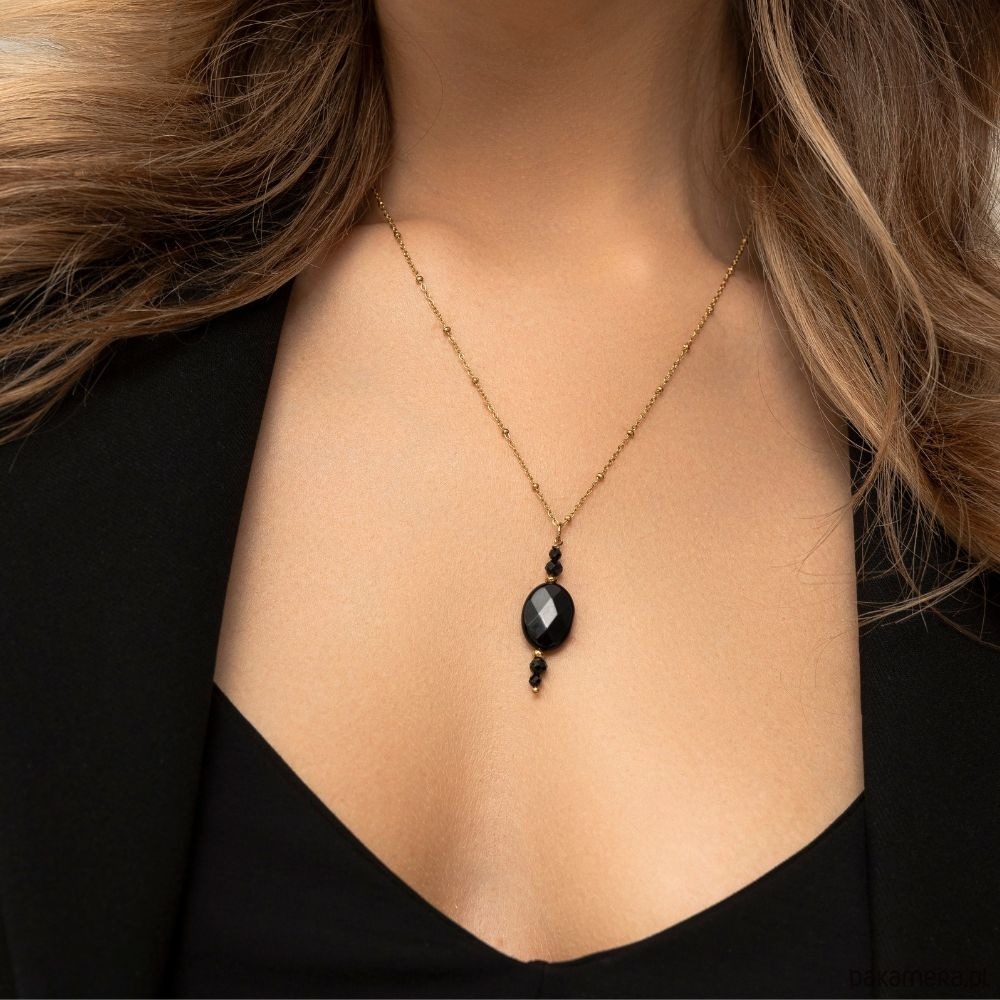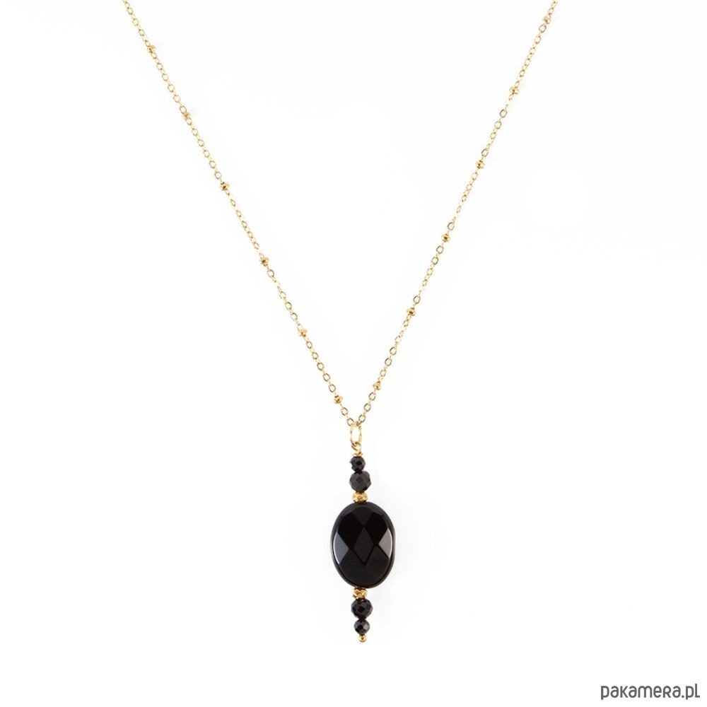 Naszyjnik z Onyksu, Spinelu i Turmalinu czarnego to elegancka biżuteria, która łączy w sobie naturalne piękno, moc i ochronę. Głęboka czerń kamieni w połączeniu ze złotym łańcuszkiem tworzy kompozycję pełną harmonii, równowagi i wyrafinowania.