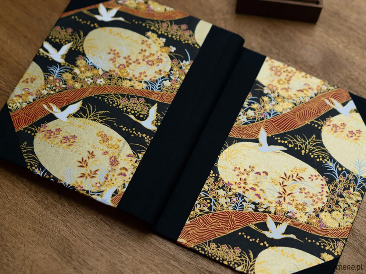 Piękny, elegancki notes. Robiony ręcznie. Okładkę zdobi wyjątkowy japoński papier. Rogi i grzbiet zabezpieczone są płótnem.