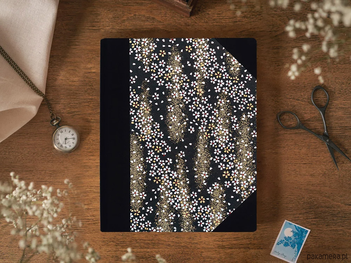 Piękny, elegancki notes. Robiony ręcznie. Okładkę zdobi wyjątkowy japoński papier. Rogi i grzbiet zabezpieczone są płótnem.