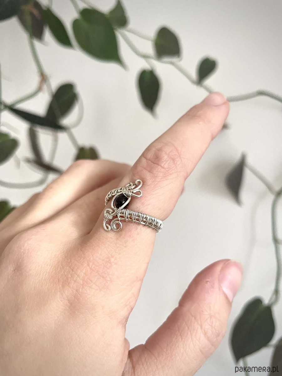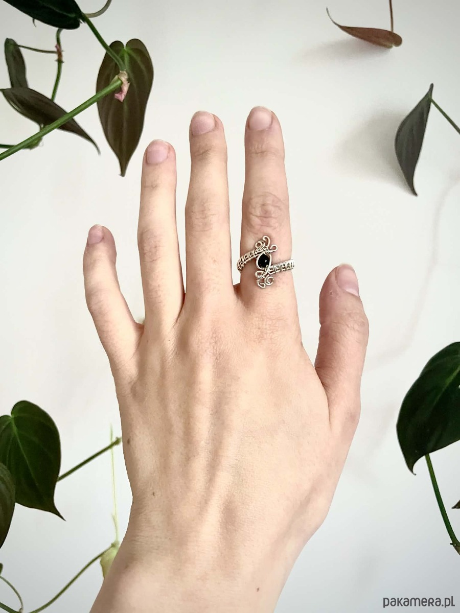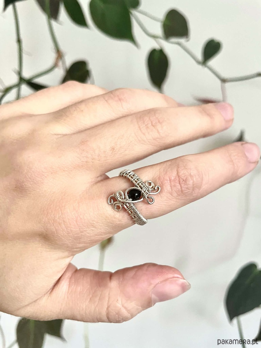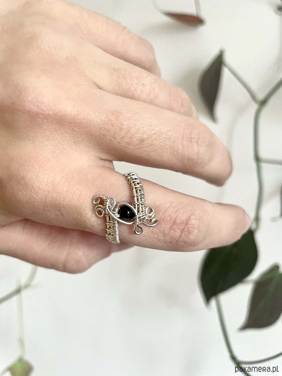 Piękny, elegancki pierścionek wyplatany z miedzi pokrytej srebrem z czarnym onyksem. Biżuteria pięknie dopełni stylizację na co dzień jak i na specjalną okazję. Jest bardzo wygodny na co dzień i dodaje dłoni eleganckiego wyglądu. Jest to także idealny pomysł na prezent!