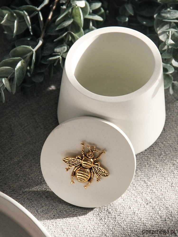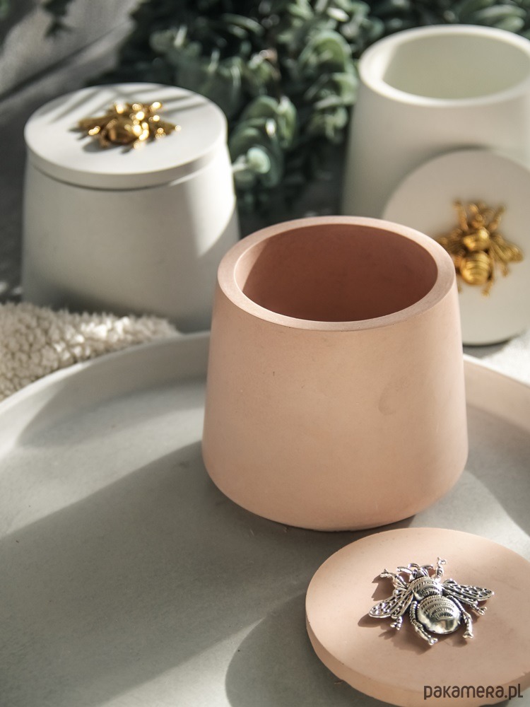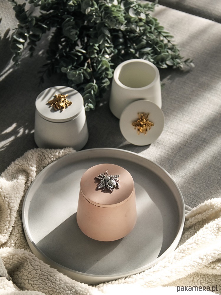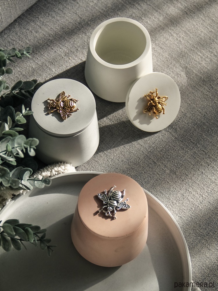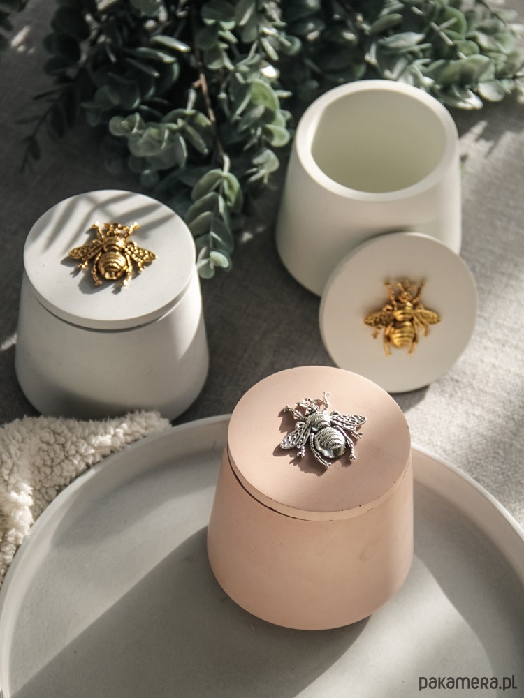Jedyne w swoim rodzaju, eleganckie i wyjątkowo piękne pojemniczki na biżuterię i inne drobiazgi wykonane z betonu architektonicznego z ozdobnym, metalowym ornamentem pszczoły na pokrywce. Wspaniały i wyjątkowy dodatek do każdego wnętrza. Idealne także na prezent dla ukochanej osoby. Sprawdzą się jako pojemnik na biżuterię, drobiazg, waciki, do zalewania świec.