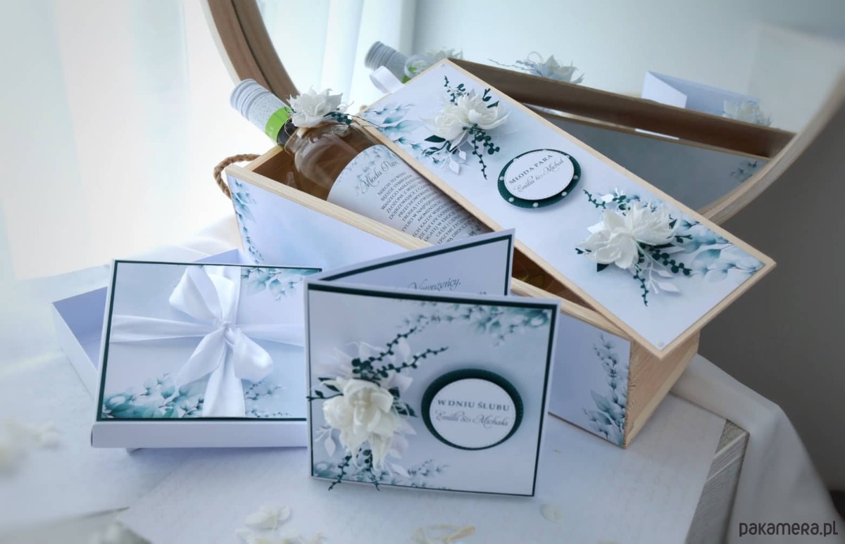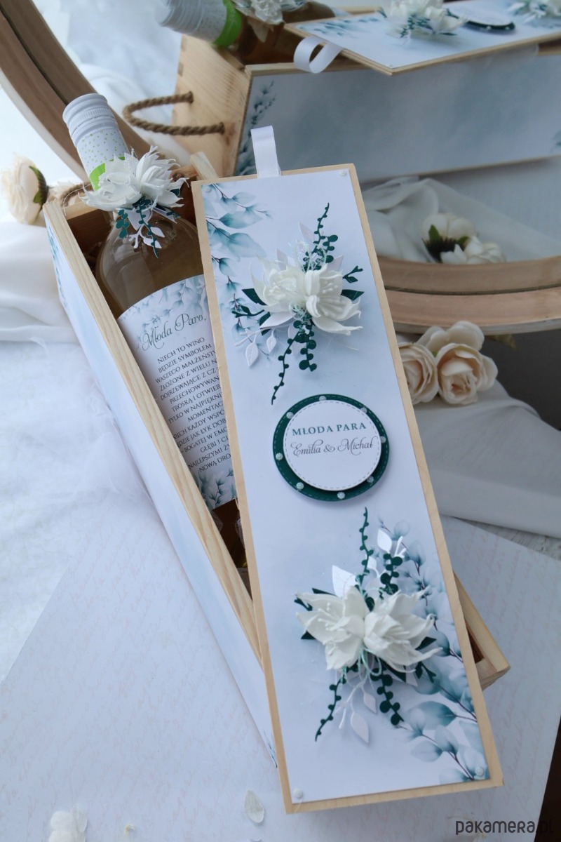 Ten zestaw ma kartkę w pudełku, skrzynkę na wino, zawieszkę oraz etykietę z personalizacją.