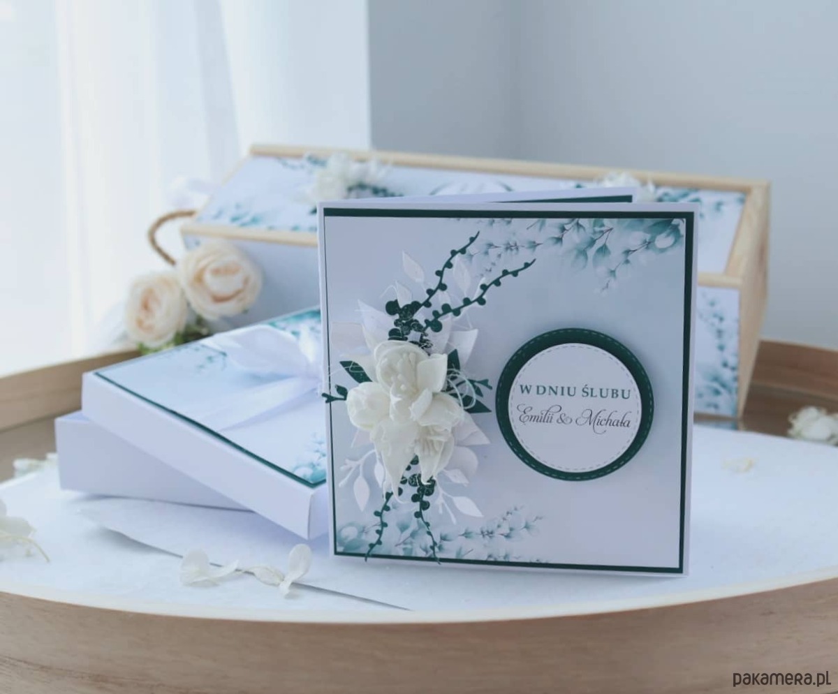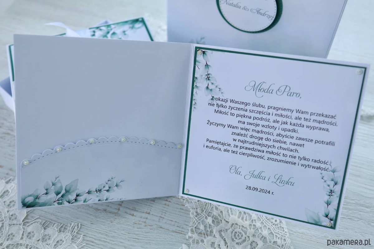 Wpiszę imiona, datę i życzenia, a do kartki dodam kieszonkę (jeśli chcesz). Klasyczne kolory: biel + butelkowa zieleń – pasują do większości ślubów. Butelka nie jest dołączona.
