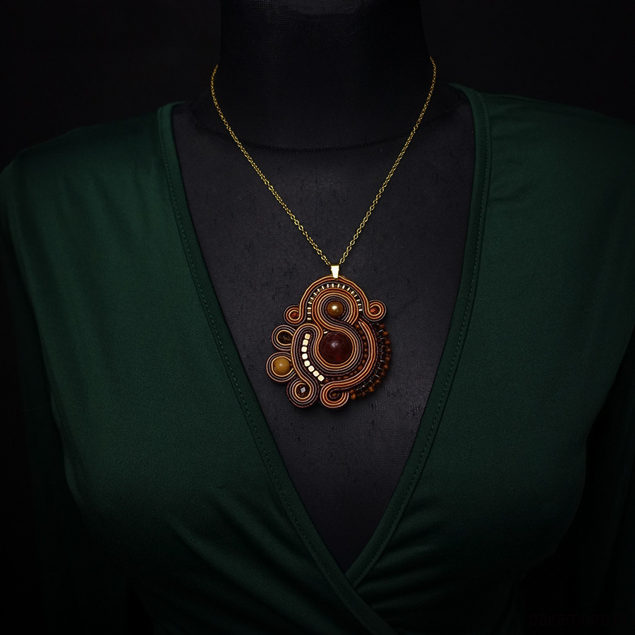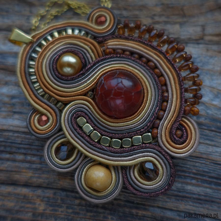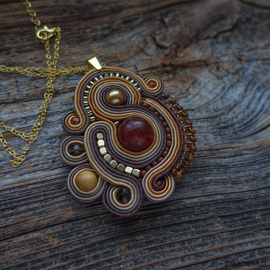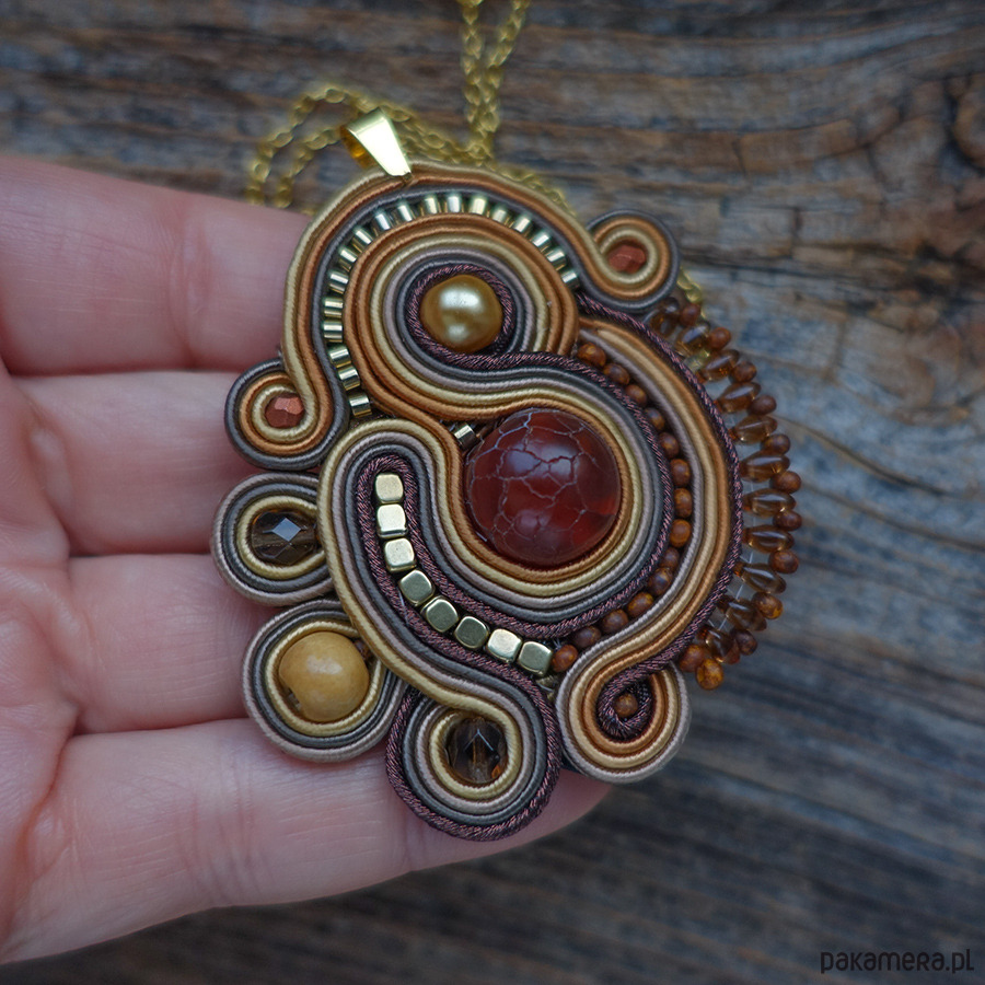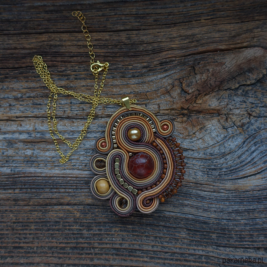 Naszyjnik wykonany metodą haftu soutache w ciepłych odcieniach brązu i złota.