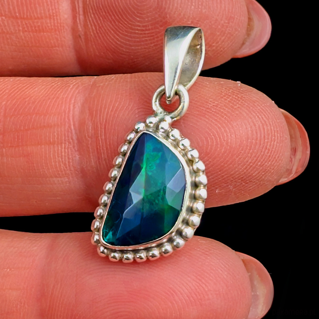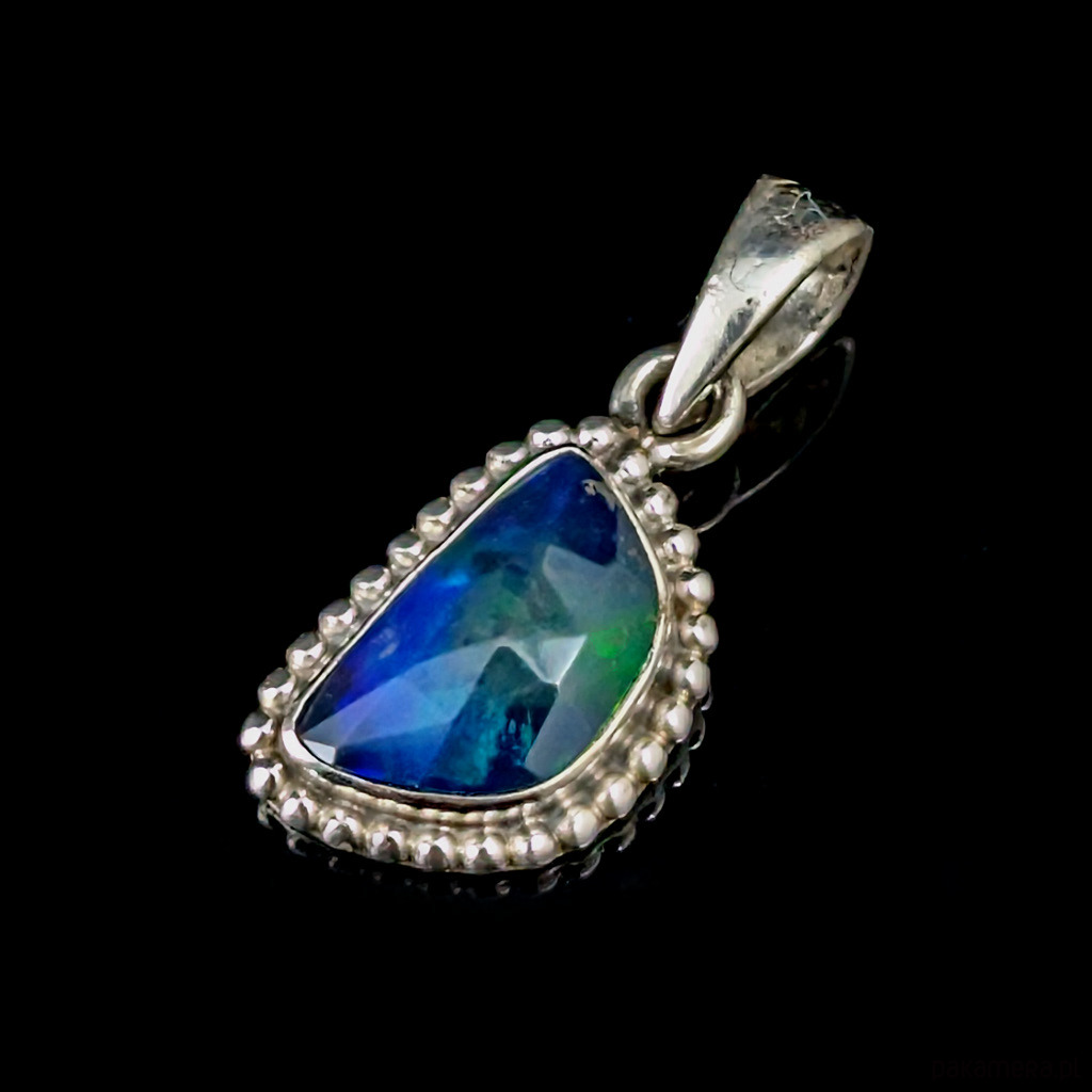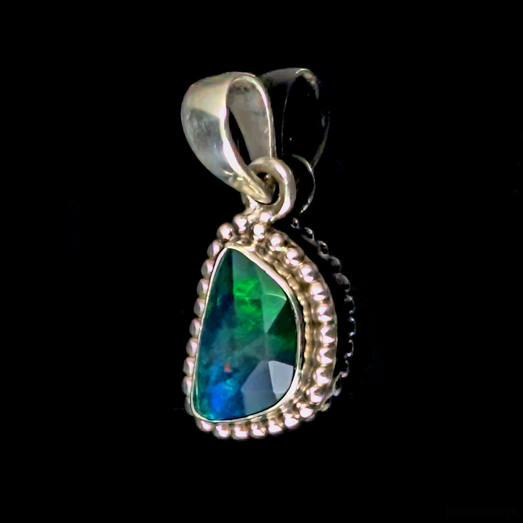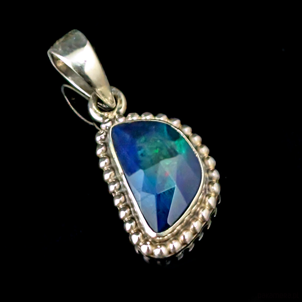 Delikatna, subtelna zawieszka z przepięknym, szlachetnym fasetowanym czarnym opalem oprawionym w srebro próby 925. Wymiary 16 x 12 mm, długość z krawatką 28 mm, waga 2,9 g. Wykonany przez dostawcę kamieni. Wisiorek zostanie zapakowany w ozdobne pudłeczko.