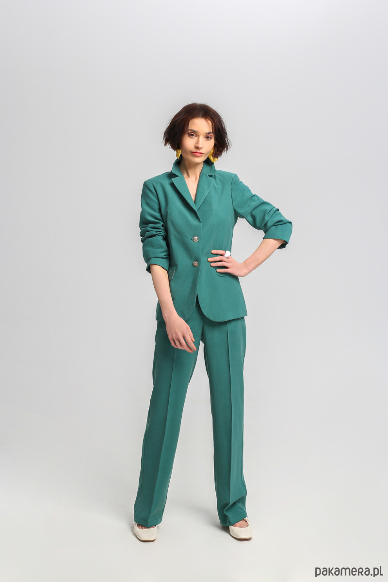 Elegancki żakiet wykonany w 95% z jedwabnej wiskozy. Zapinany na dwa guziki herbowe. Posiada poduszki na ramionach oraz podszewkę.