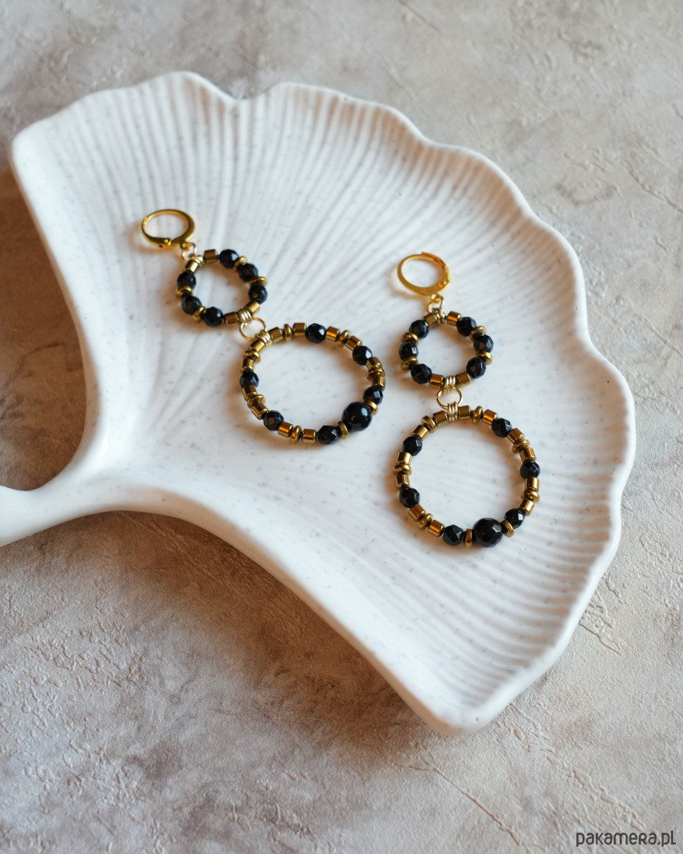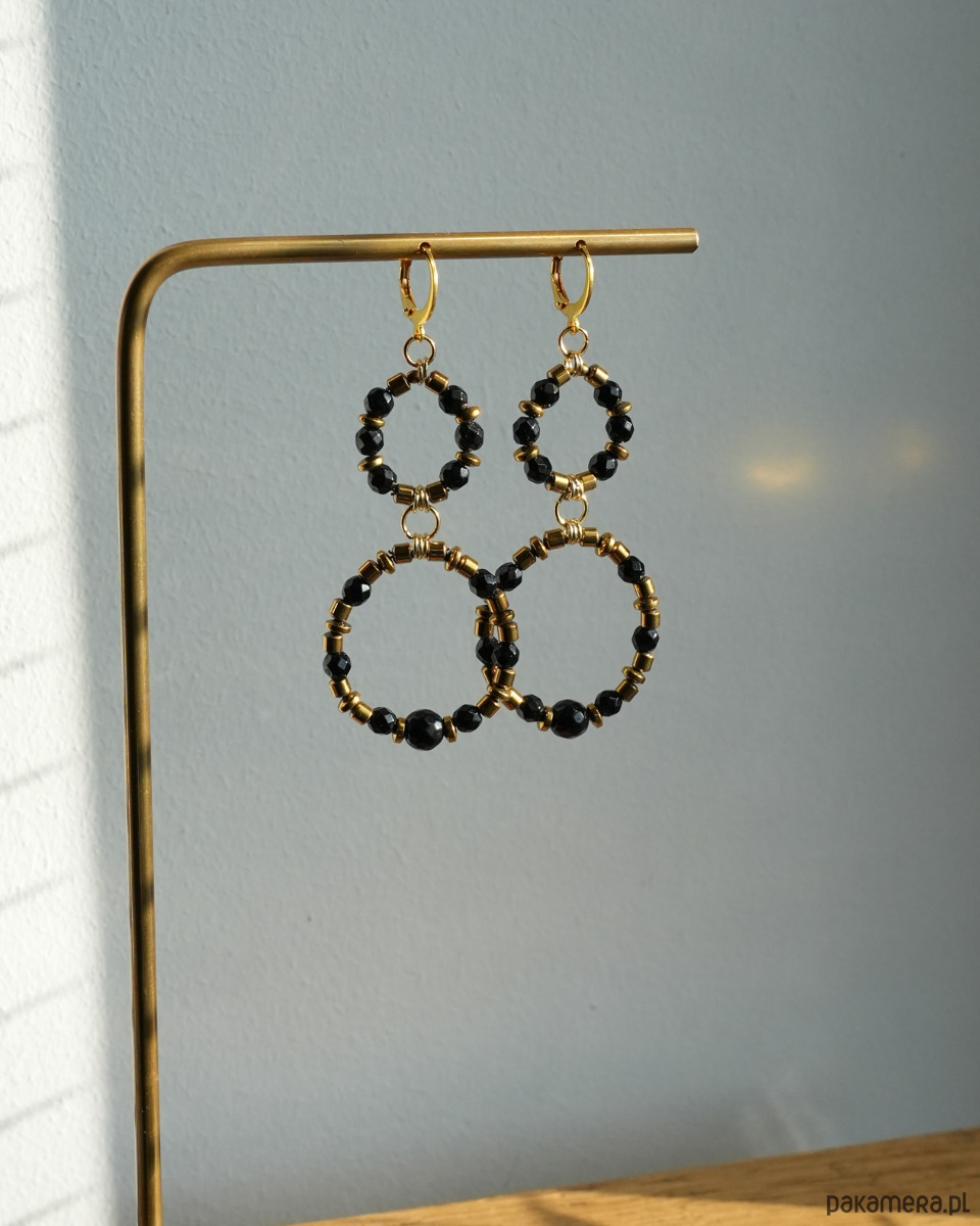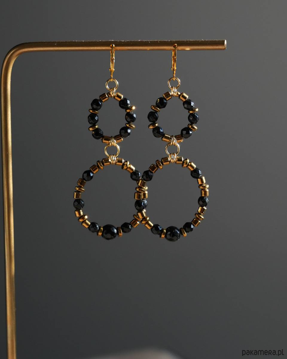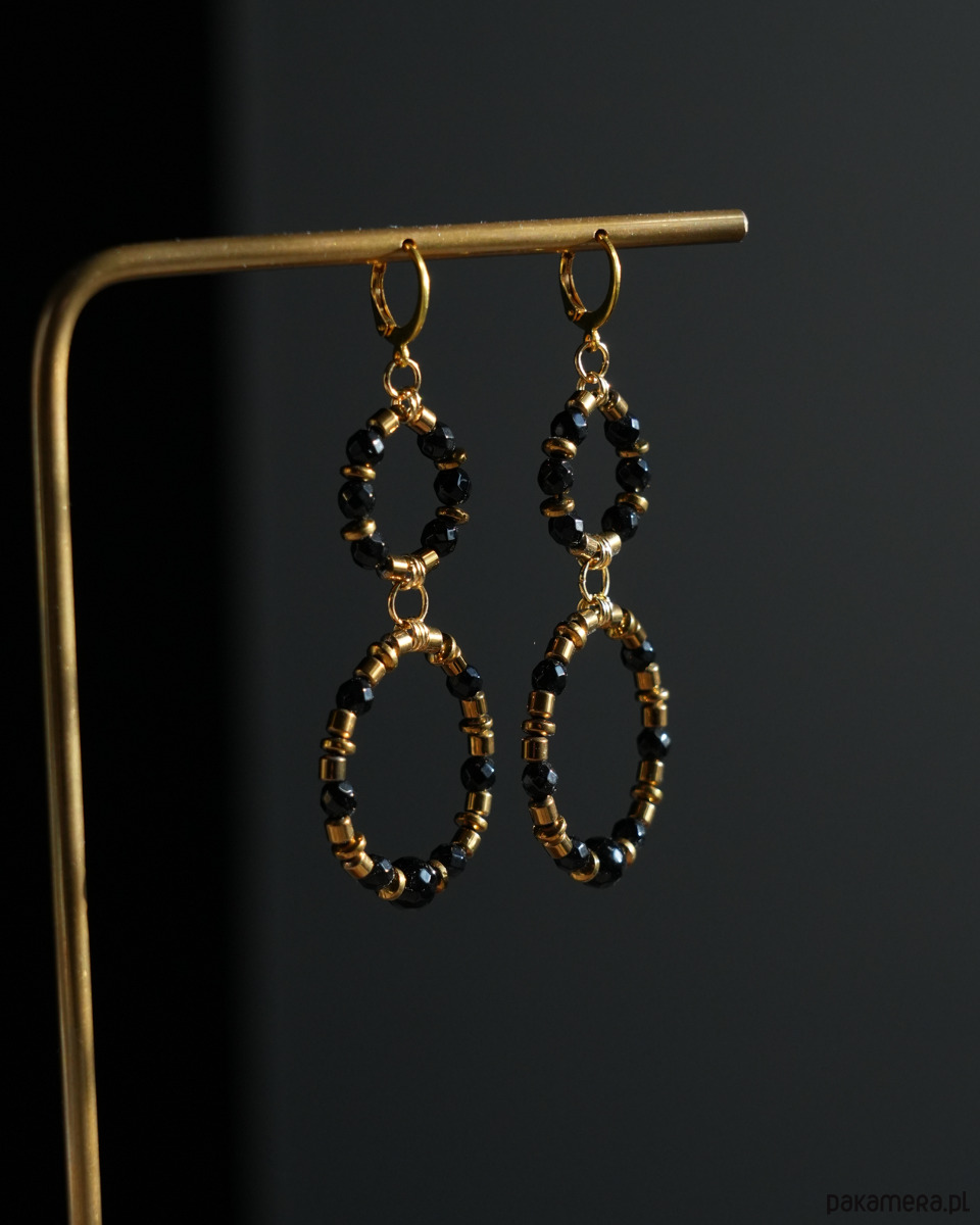 Długie, eleganckie i bardzo efektowne kolczyki z korali BLACK STONE (kamień syntetyczny) i ciemnozłotego HEMATYTU. Zamykane bigle typu "kajdanki" i ogniwka montażowe to stal szlachetna w kolorze złotym. Koraliki zostały nawleczone na podwójną, stalową linkę jubilerską i kółka są lekko elastyczne (nie są sztywne i idealnie okrągłe).