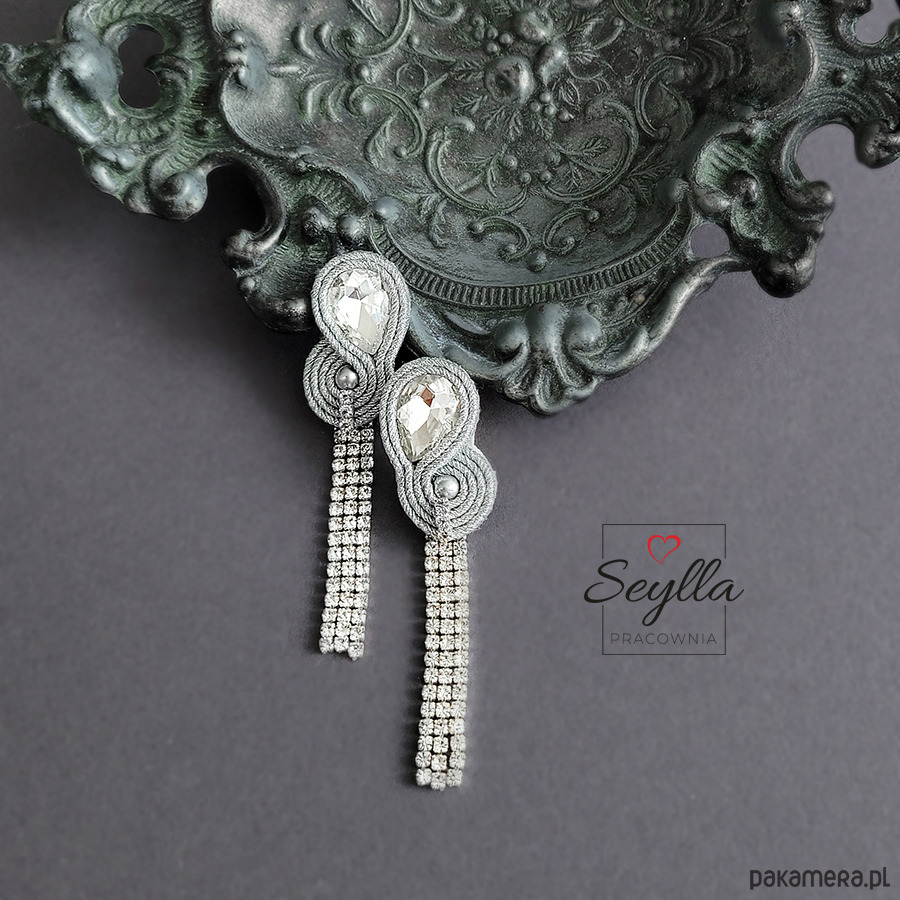 Niezwykle eleganckie kolczyki wykonane w technice haftu sutasz. W kolorze srebrnym, długie z pięknymi kryształkami. Osadzone są na sztyftach. Długość całkowita to ok.6,5cm. Kolczyki zapakowane w ozdobne pudełeczko. Do zamówienia dodaję elegancki upominek.
