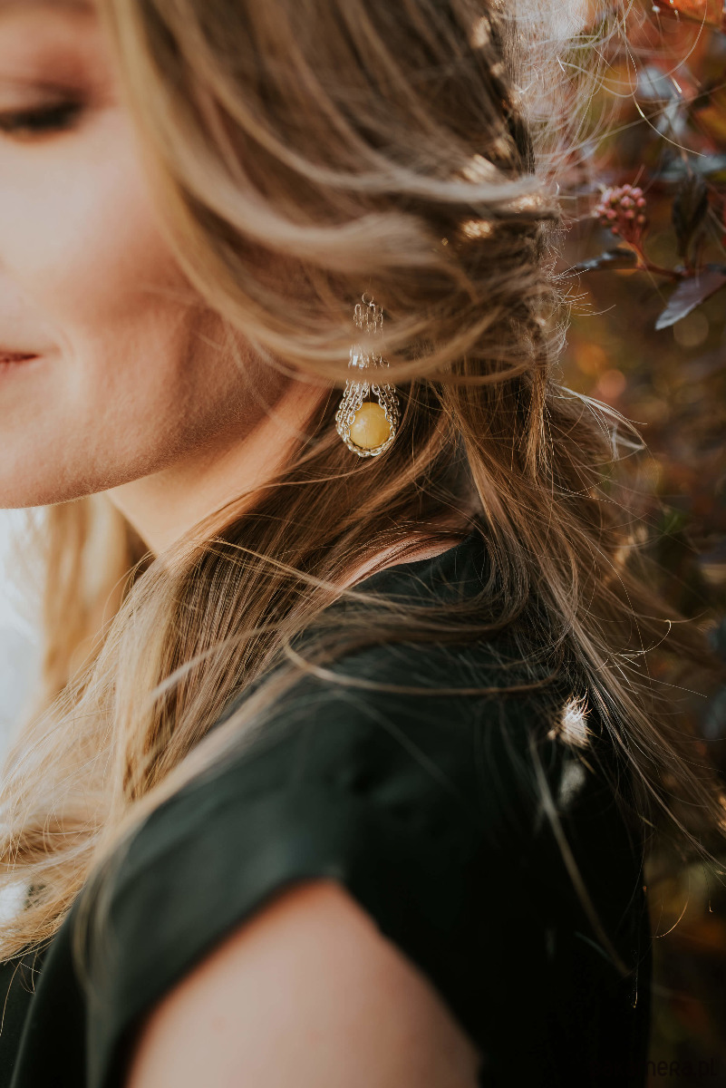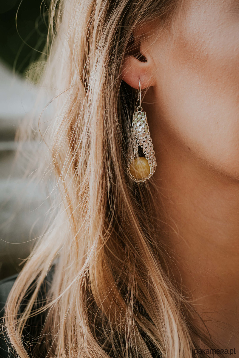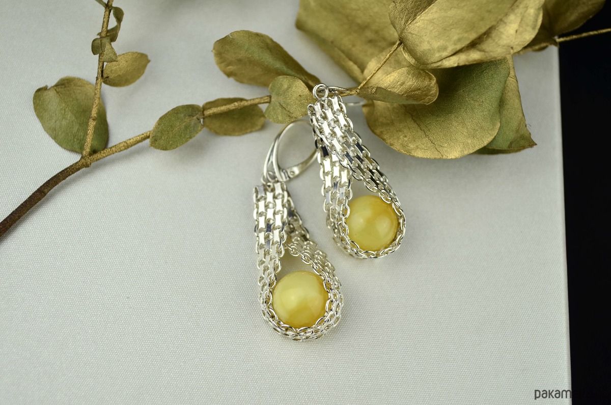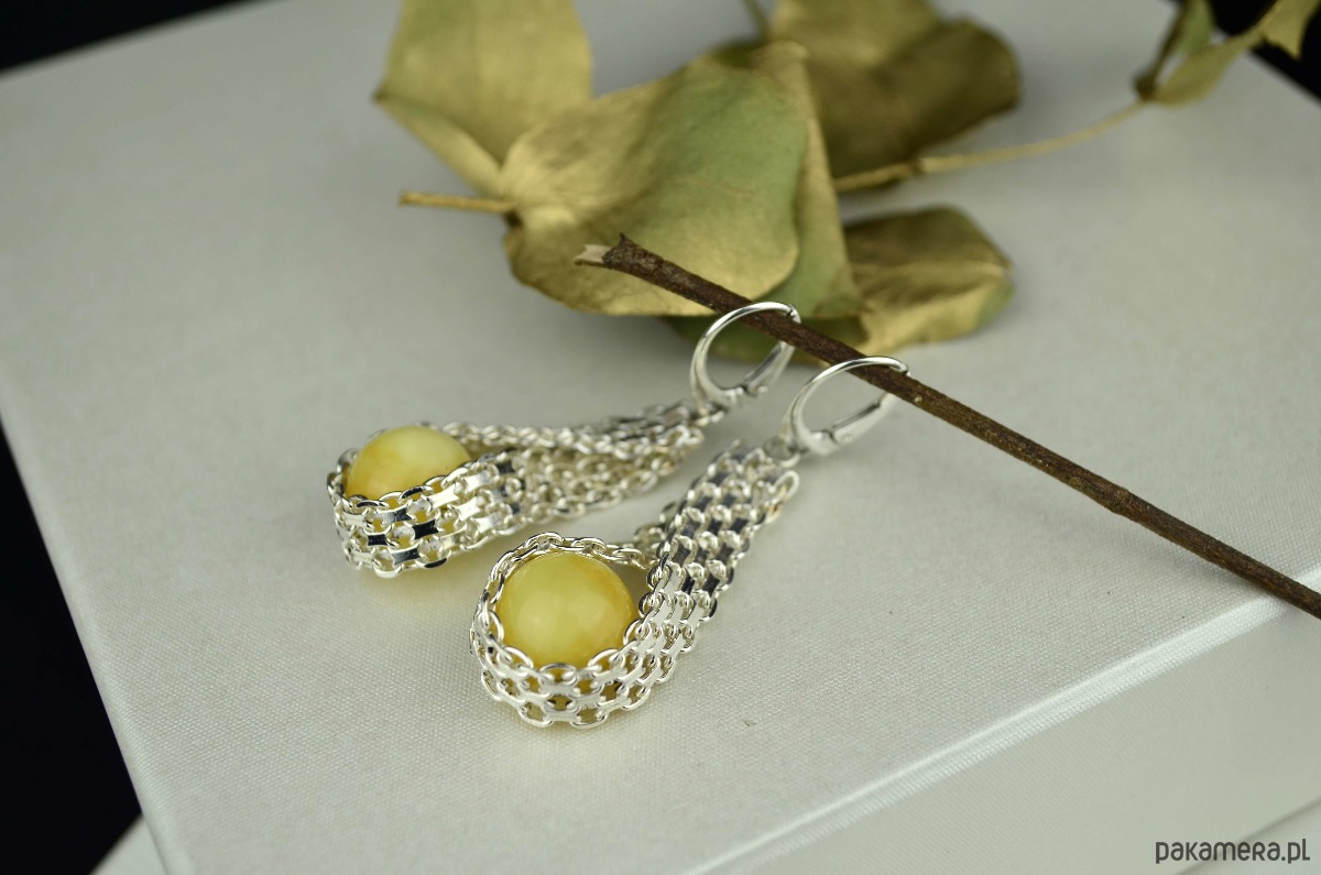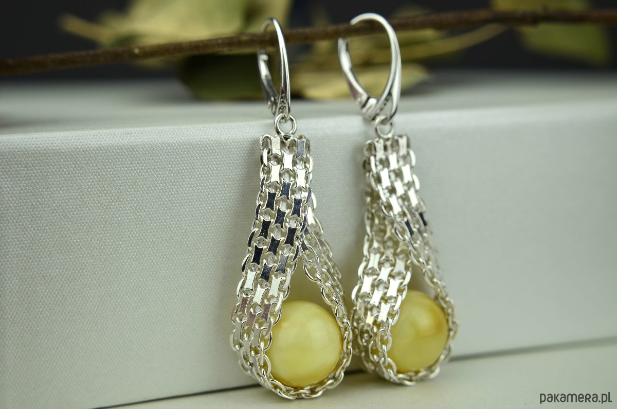 Długie, rzucające się w oczy kolczyki ze srebra i bursztynowych kul. Kolczyki wykonane są z grubego srebrnego łańcuszka i wypolerowanych kulek z bursztynu o średnicy 13 mm. Bursztyn jest w pięknym jasnożółtym odcieniu, tzw. mleczny bursztyn. Te wiszące kolczyki ładnie układają się na uchu i delikatnie połyskują podczas noszenia. Masywne i eleganckie idealnie pasują na wielkie wyjścia.