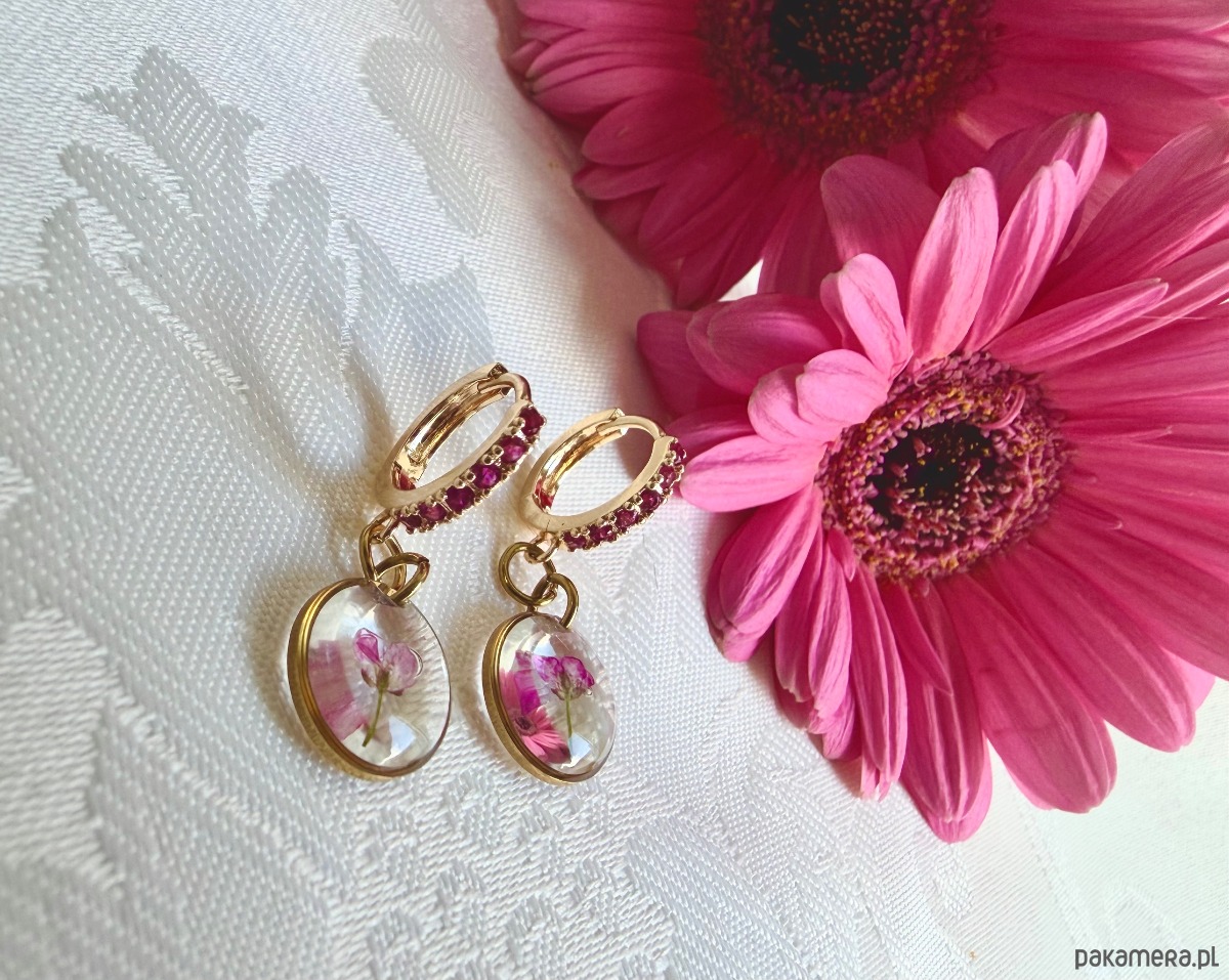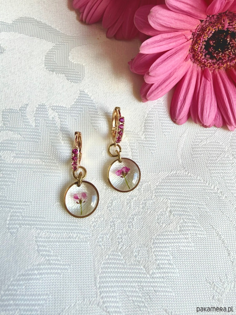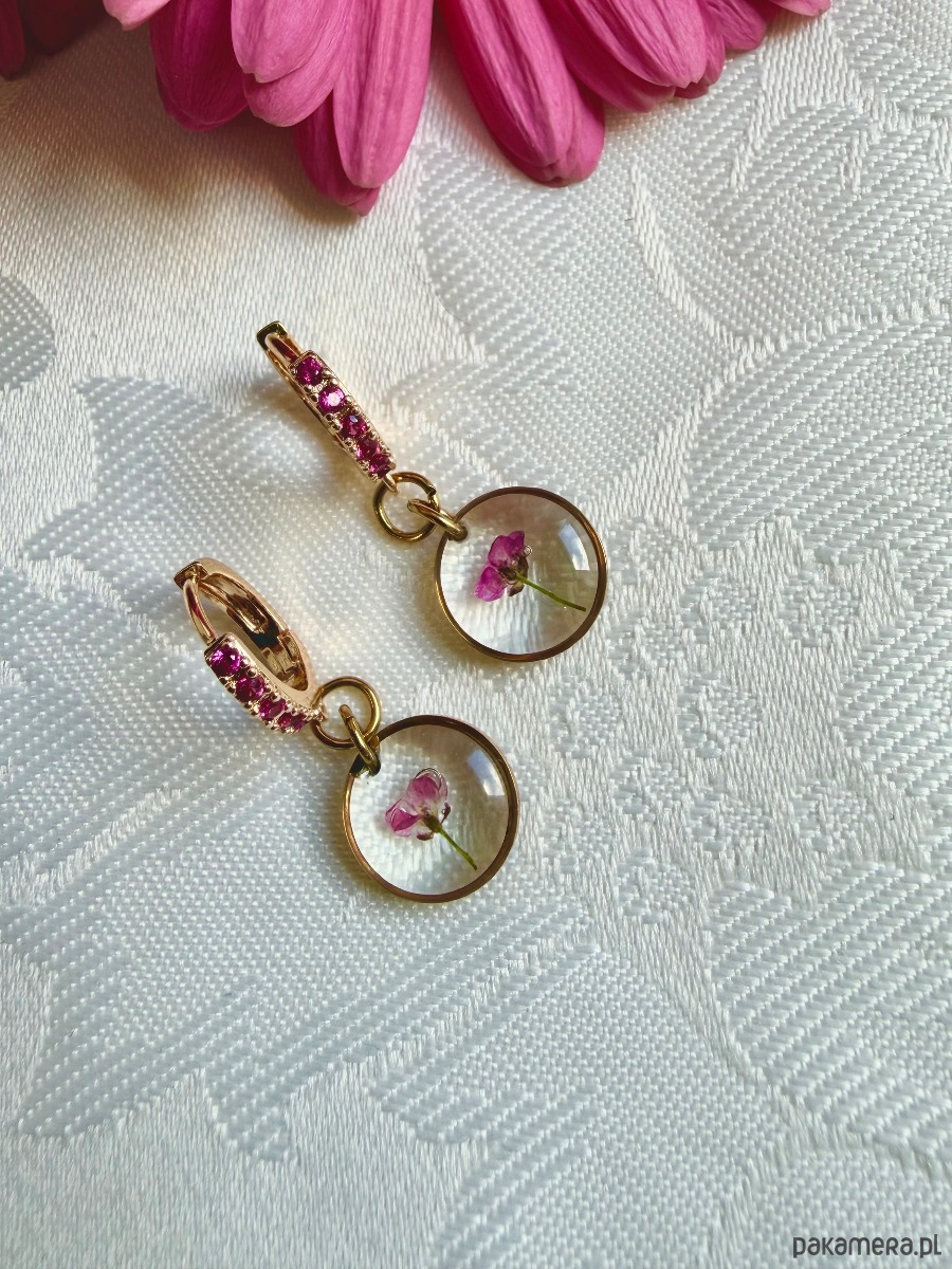 Te wyjątkowe kolczyki to propozycja dla osób, które kochają subtelność natury, ale nie boją się dodać do swojej stylizacji odrobiny lśniącego szyku. W każdej 12-milimetrowej zawieszce zamknęliśmy prawdziwy kwiat Smagliczki nadmorskiej, otulony krystaliczną żywicą. Całość została zawieszona na klasycznych kołach, które zdobią delikatne, różowe cyrkonie, pięknie komponujące się z barwą kwiatka.