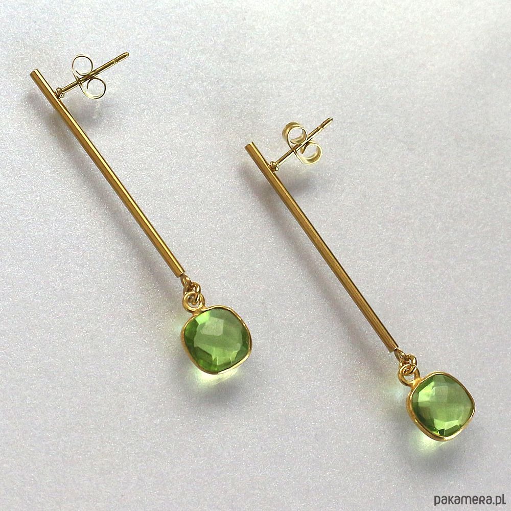 Eleganckie minimalistyczne kolczyki na biglu ze stali chirurgicznej pozłacanej 24k złotem, hypoalergiczne. Ozdobione pięknymi fasetowanymi peridotami w oprawie ze srebra próby 925 pozłacanego 24k złotem. Kolczyki są bardzo lekkie!