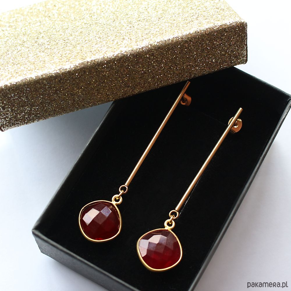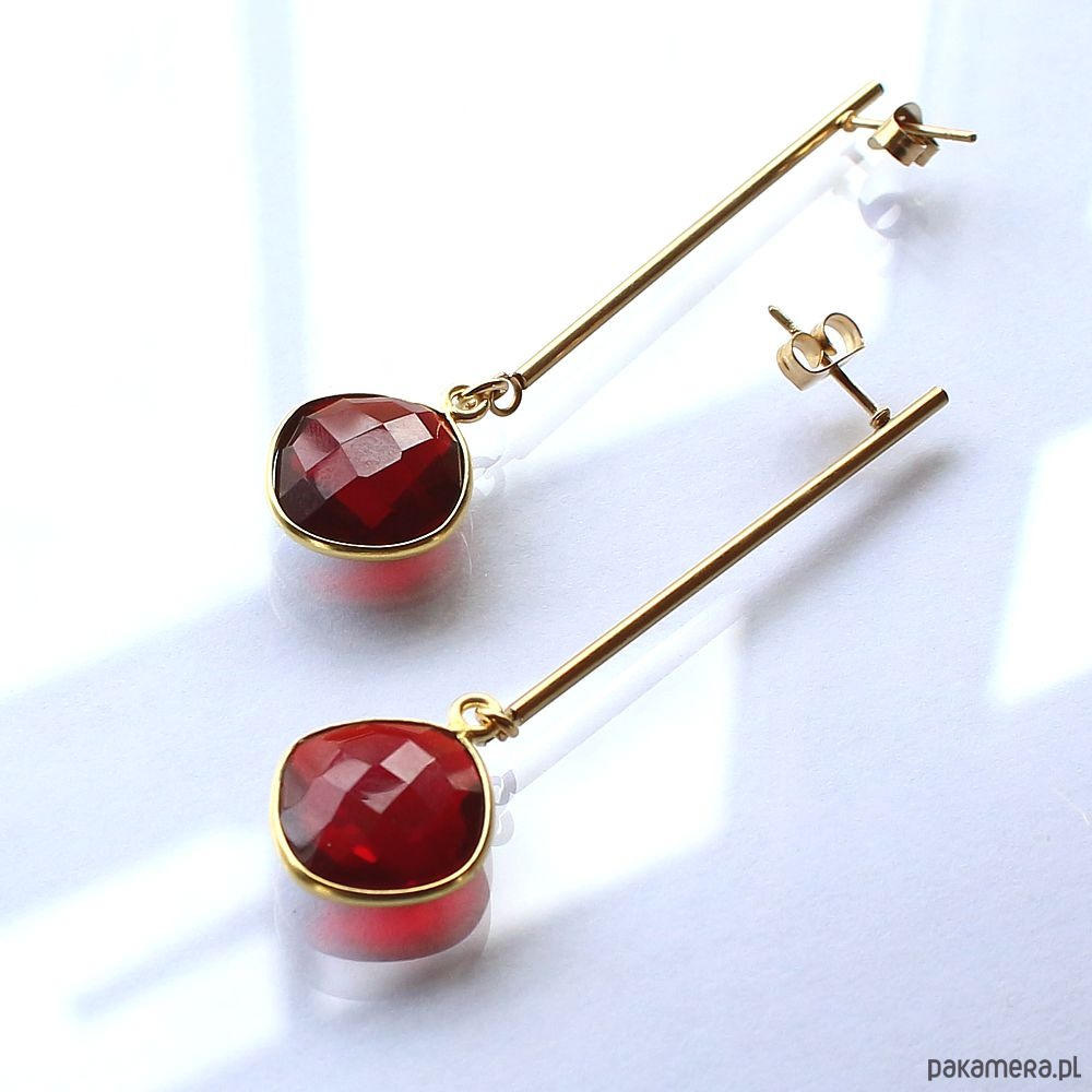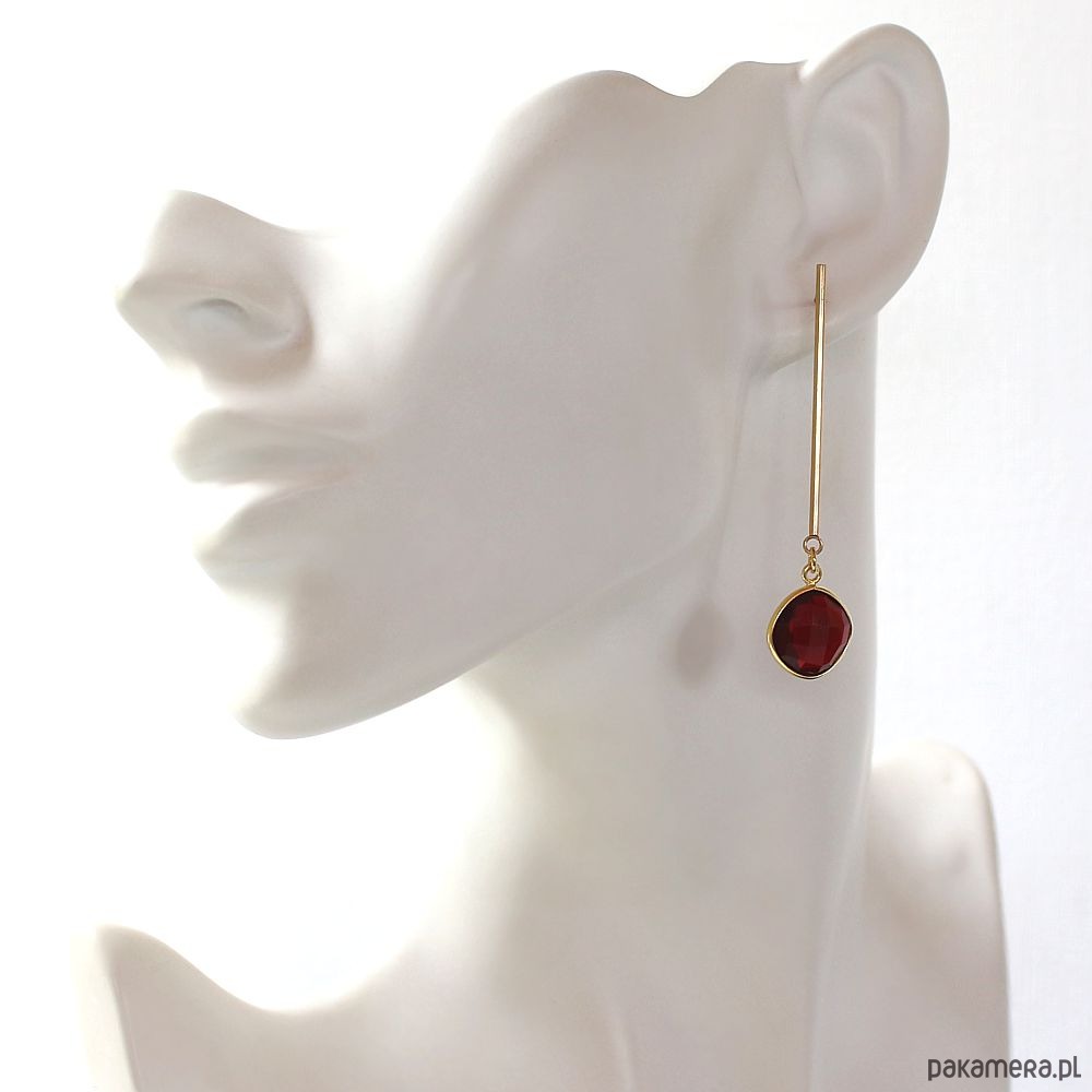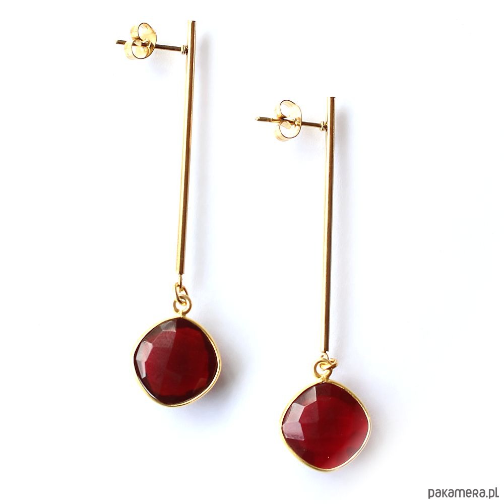 Eleganckie minimalistyczne kolczyki na biglu ze stali chirurgicznej pozłacanej 24k złotem, hypoalergiczne. Ozdobione pięknymi fasetowanymi granatami w oprawie ze srebra próby 925 pozłacanego 24k złotem. Kolczyki są bardzo lekkie!