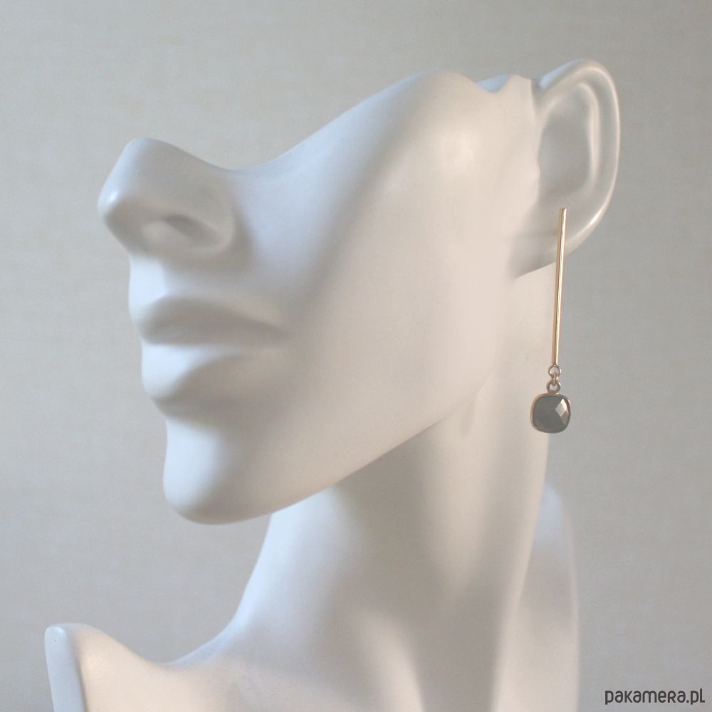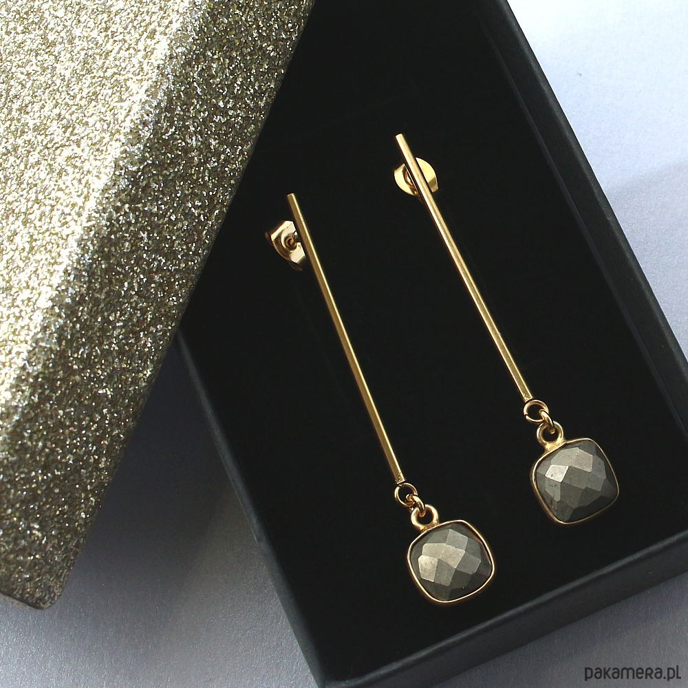 Eleganckie minimalistyczne kolczyki na biglu ze stali chirurgicznej pozłacanej 24k złotem, hypoalregiczne. Ozdobione pięknymi fasetowanymi pirytami w oprawie ze srebra próby 925 pozłacanego 24k złotem. Kolczyki są bardzo lekkie!