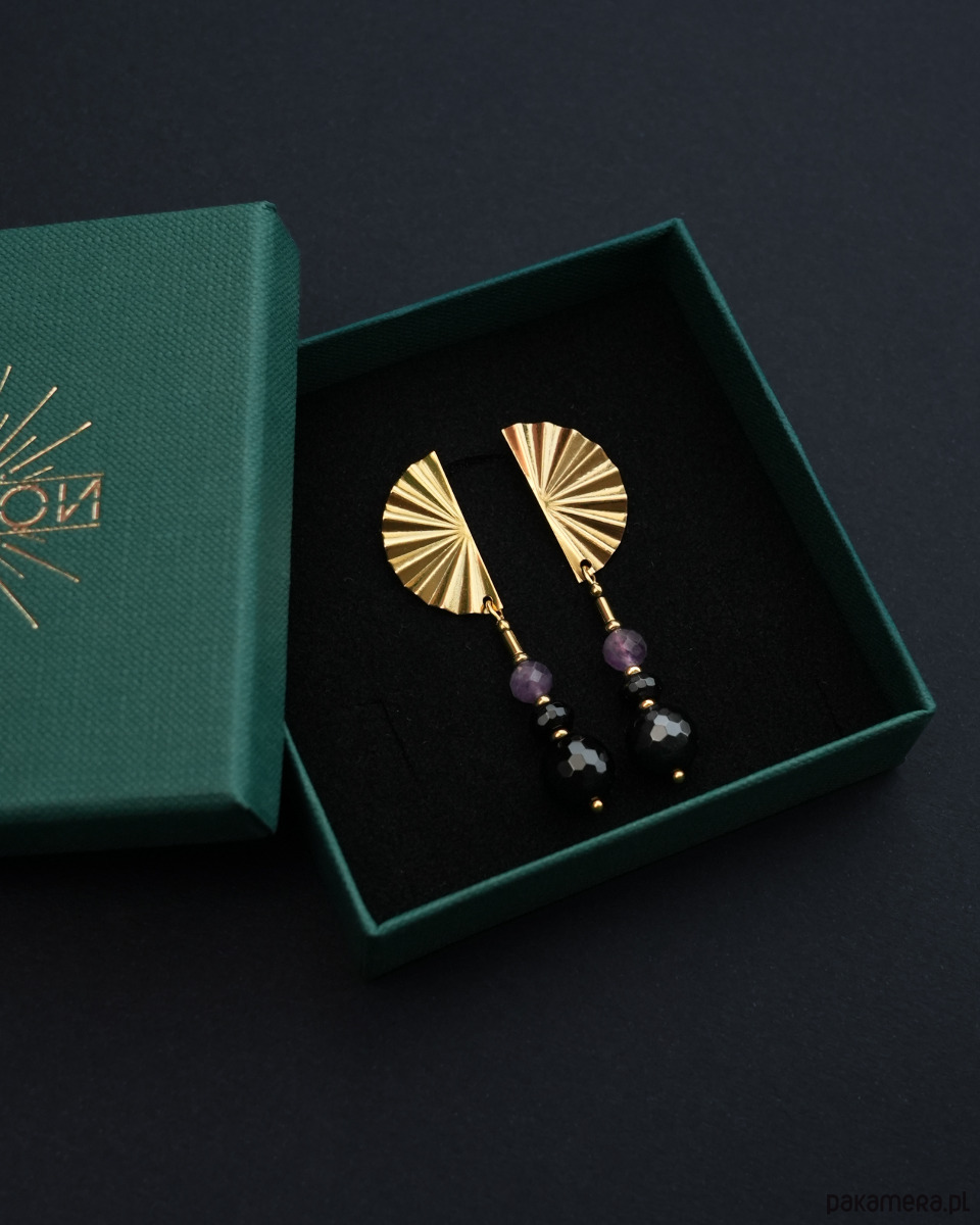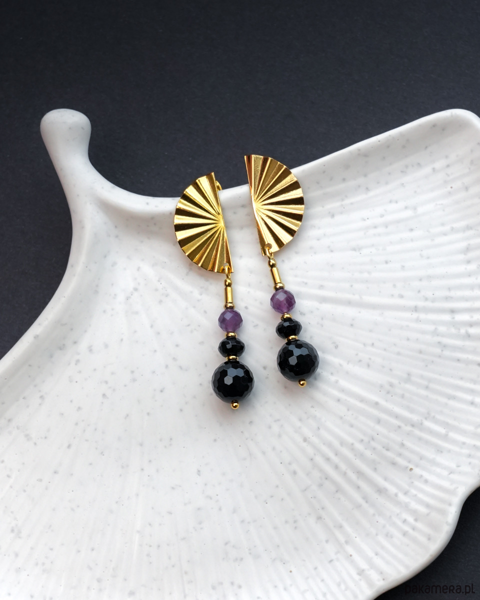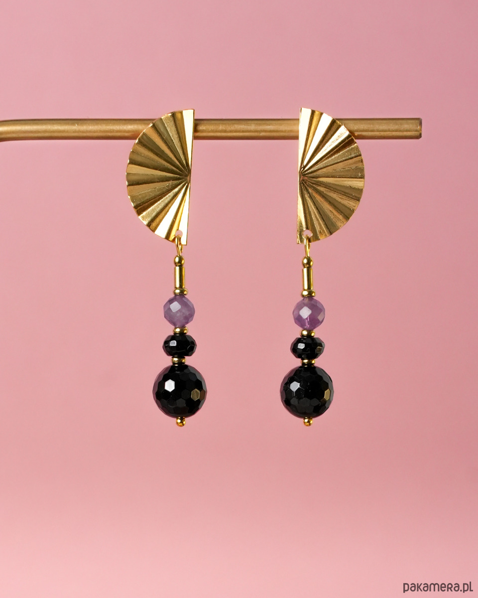 Eleganckie i unikatowe kolczyki z AMETYSTEM, czarnym ONYKSEM i złotym HEMATYTEM, zawieszone na ozdobnych i efektownych sztyftach, wykonanych ze STALI SZLACHETNEJ w kolorze złotym. Idealne na specjalne okazje jako uzupełnienie wieczorowych kreacji, ale również na mniej eleganckie wyjścia. Na pewno będą przykuwać wzrok :)