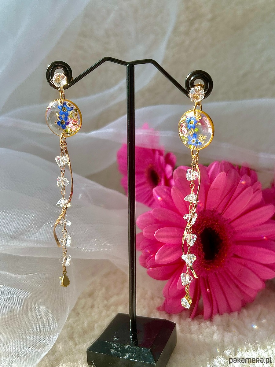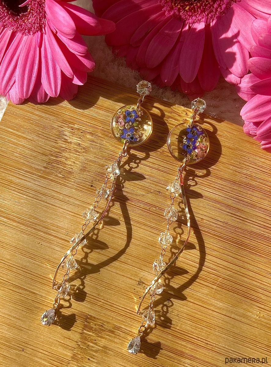 Naturalne, suszone kwiaty zatopione w przejrzystej żywicy tworzą subtelną kompozycję inspirowaną naturą. Złote elementy oraz delikatne, błyszczące zdobienia nadają kolczykom elegancji i lekkości, a ich wydłużona forma pięknie wysmukla szyję.
