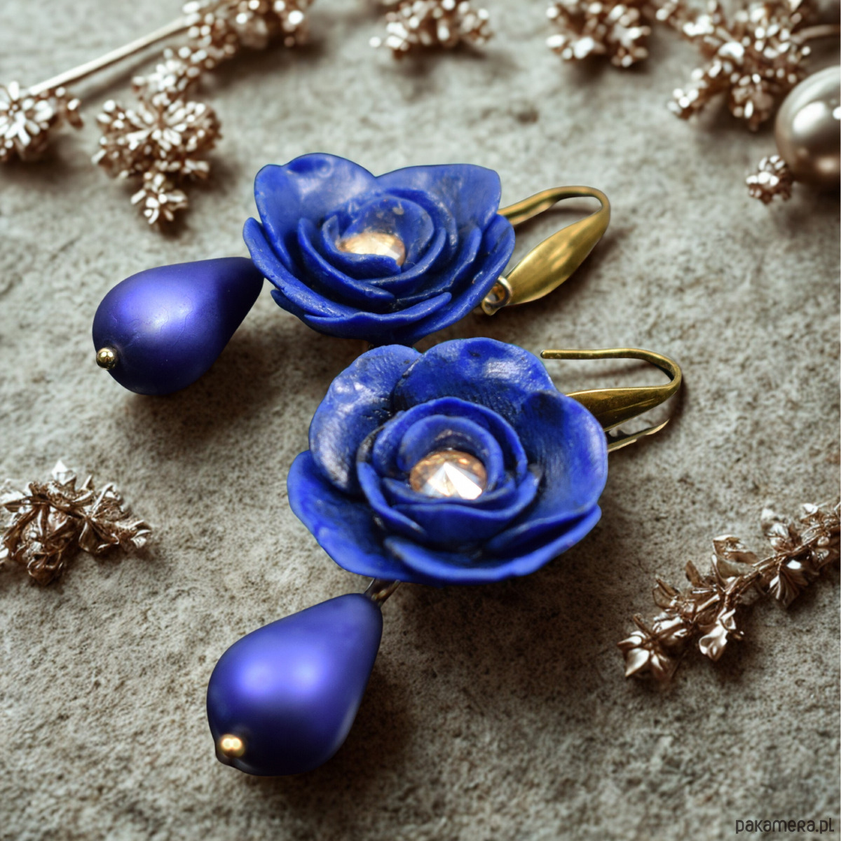 Eleganckie, ręcznie robione kolczyki, które łączą w sobie subtelność i wyjątkowy charakter. Delikatne kwiaty w odcieniu ciemnego niebieskiego (chabrowy, delikatnie przechodzący w granat) zostały uformowane z wysokiej jakości glinki polimerowej, a ich serce zdobi błyszczący kryształ w złotym odcieniu. Pod kwiatem zawieszona jest efektowna, czarna szklana kropla, która dodaje całości głębi i kontrastu.
