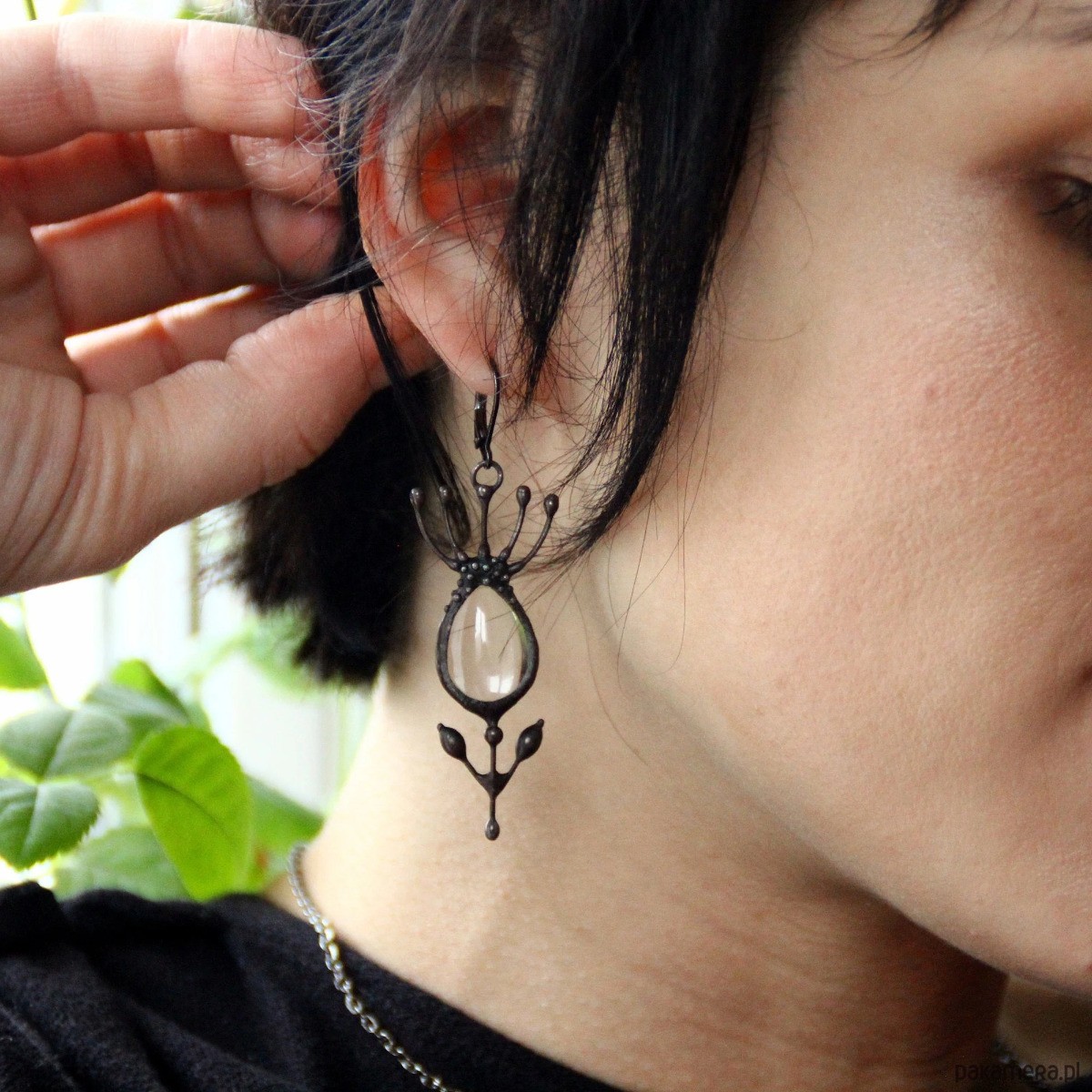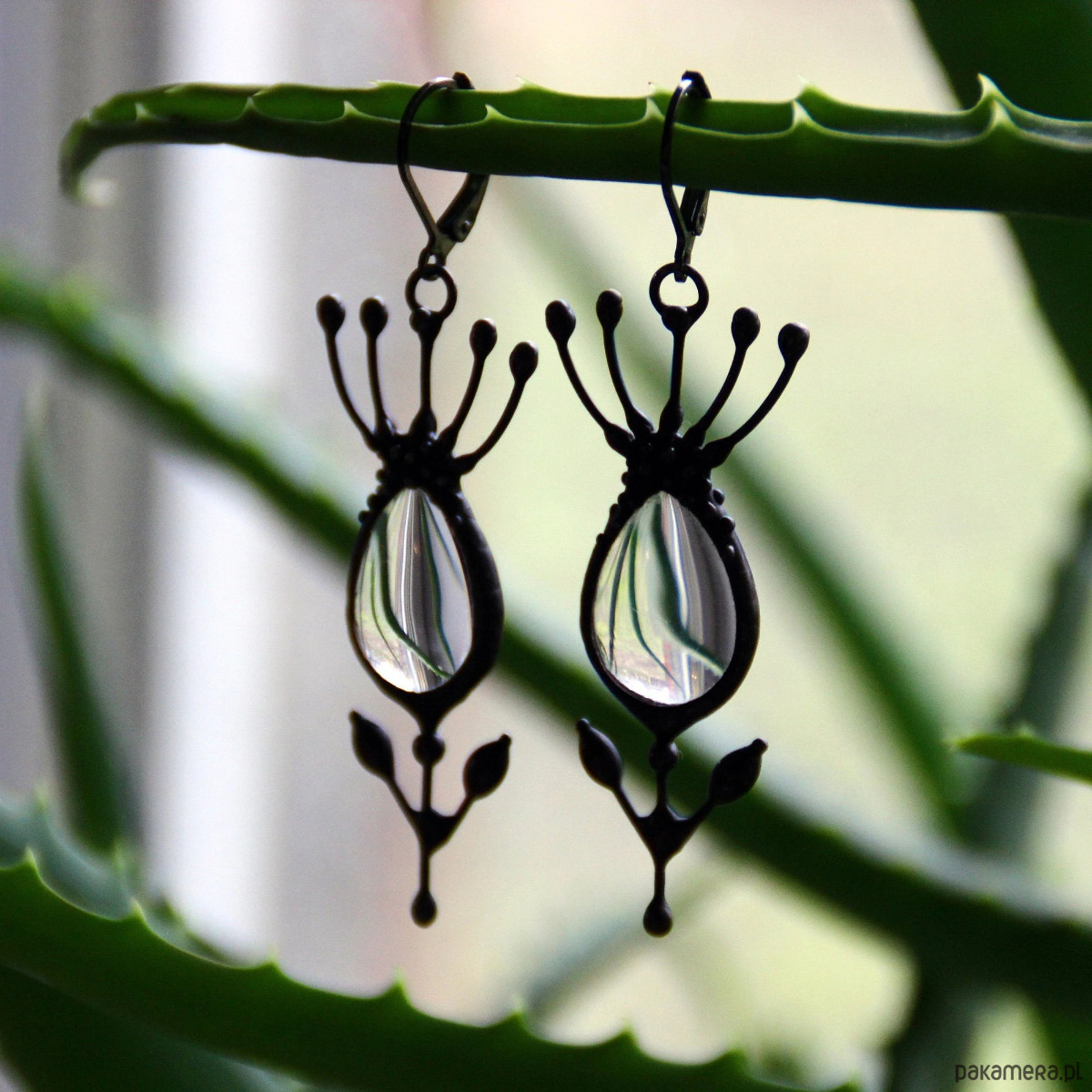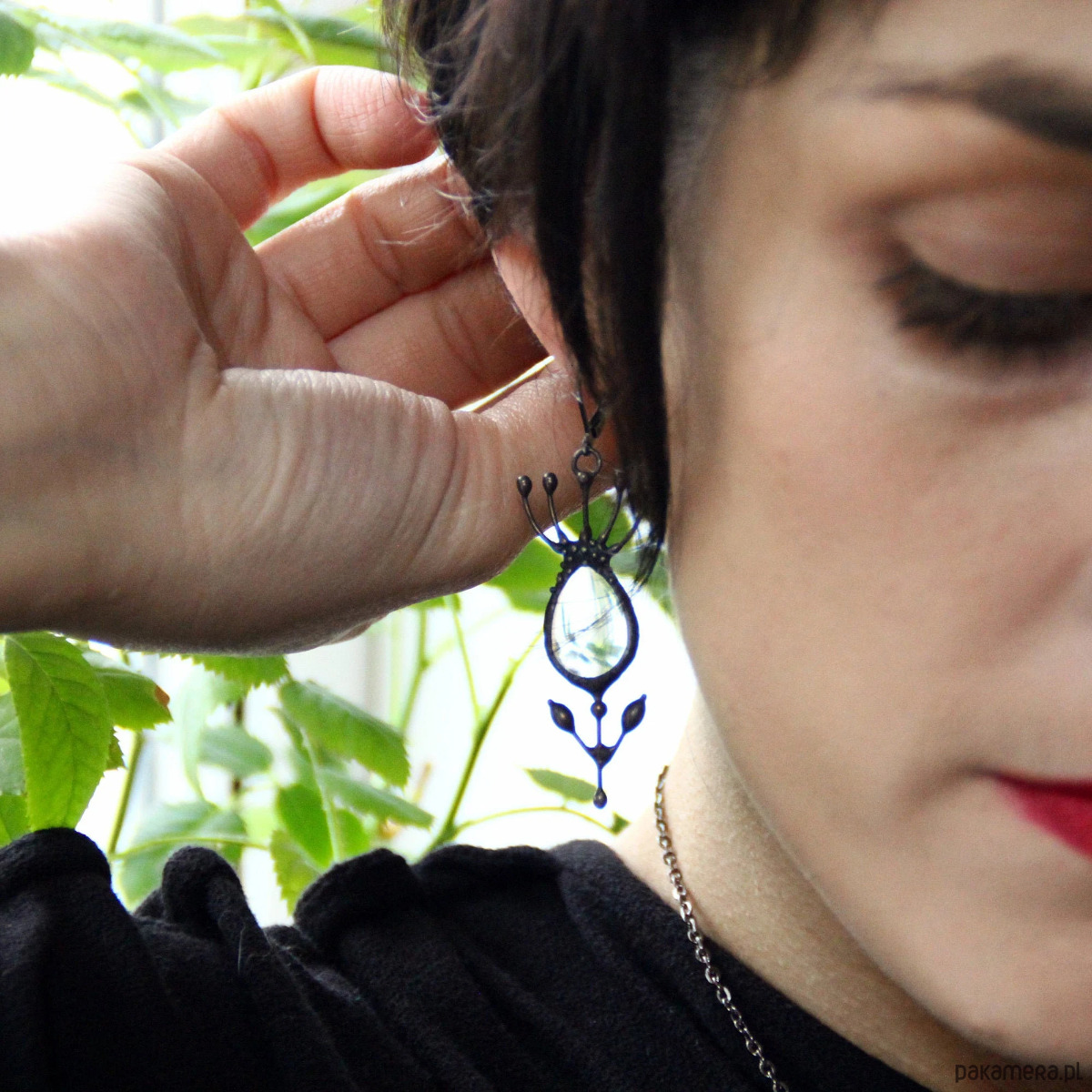 Wszystkie elementy są wykonane ręcznie, co gwarantuje indywidualność każdego produktu, który powstaje w pracowni Yadovito. Stop cyny i miedzi jest polerowany roztworem wykończeniowym, aby nadać biżuterii szlachetny wygląd, a jednocześnie zapobiec utlenianiu się metalu.Kolor: Czarny/Przezroczysty. Rozmiar około 5/3 cm.